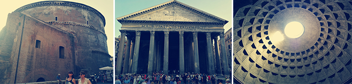 Il diametro interno della cupola corrisponde esattamente all’altezza da terra del tempio e prolungando idealmente la curvatura della volta si ottiene una sfera perfetta. La cupola è stata realizzata mescolando del calcestruzzo a materiali sempre più leggeri, dal travertino alla pietra pomice, via via che ci si avvicinava alla cima. Quest’idea assolutamente geniale ha permesso alla cupola del Pantheon di resistere quasi duemila di anni ed arrivare perfettamente intatta fino ad oggi. Alzando gli occhi noterete che l’unica fonte di luce è rappresentata da un oculus, ovvero un foro posto allo zenith del diametro di 9 metri. Ed è proprio il suo rapporto con la luce, l’aspetto più importante del Pantheon. E’ la luce a creare lo spazio all’interno.