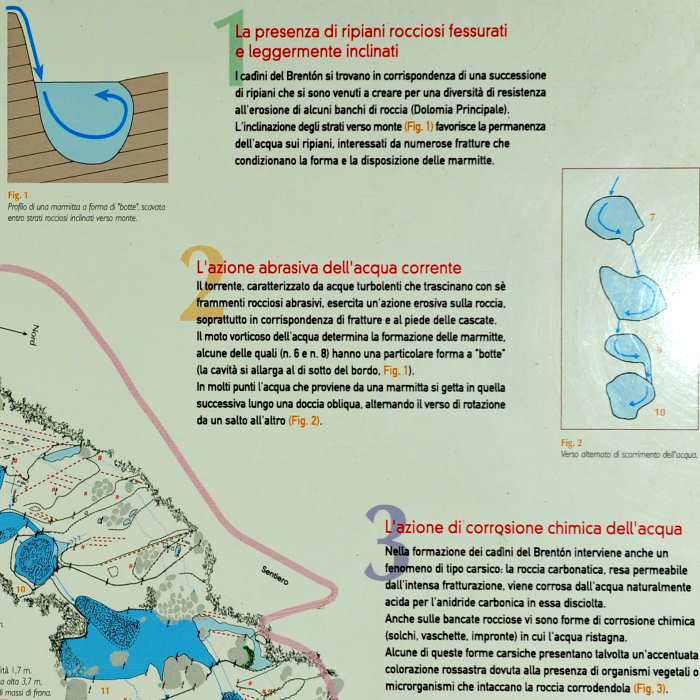 Ora, lasciato il giardino alle spalle proseguiamo seguendo le indicazioni per i Cadini, un sentiero adatto a tutti, anche per i più piccini. Essendo autunno il percorso è umido, attenzione. Un facile sentiero conduce ad una sequenza di 15 profonde cavità scavate dalle acque del torrente Brentòn, che si getta da limpide cascatelle. Queste spettacolari marmitte di evorsione, situate nel cuore del Parco, stupiscono per la bellezza dei colori e la perfezione delle forme.