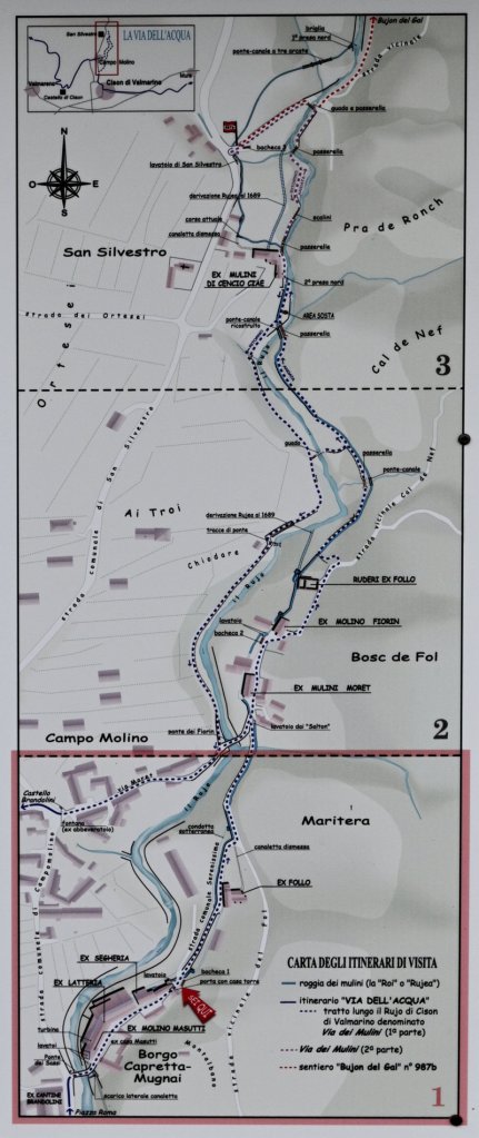 Qualche centinaio di metri a nord di piazza Roma, è possibile intraprendere un particolare percorso storico naturalistico che si snoda attraverso la valle sino al Bosco delle Penne Mozze. Si tratta di un tracciato capace, ad ogni angolo, di stupire anche il più esigente dei visitatori: racchiude in sé il valore della storia e la bellezza della natura. Il percorso ricostruisce quella che era, fino all’inizio del secolo scorso, la realtà artigianale di Cison, legata a doppio filo con il torrente Rujo e con lo sfruttamento delle sue acque: si potranno così vedere vecchi lavatoi ricostruiti, fontane, canalette con le diverse chiuse e antichi mulini.