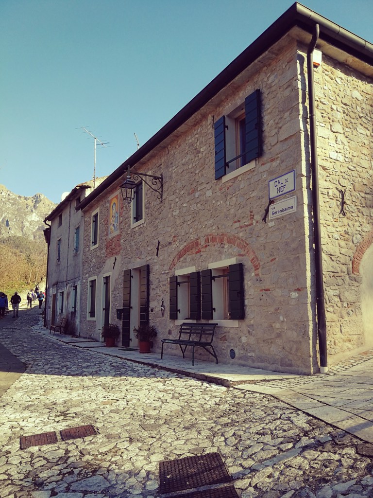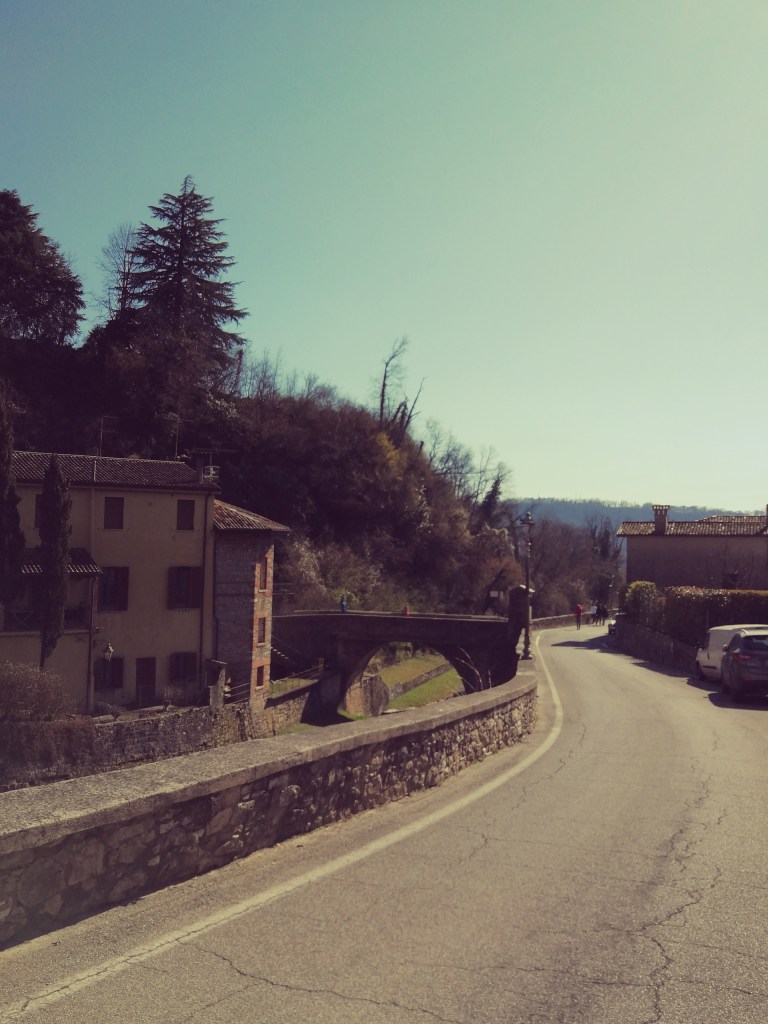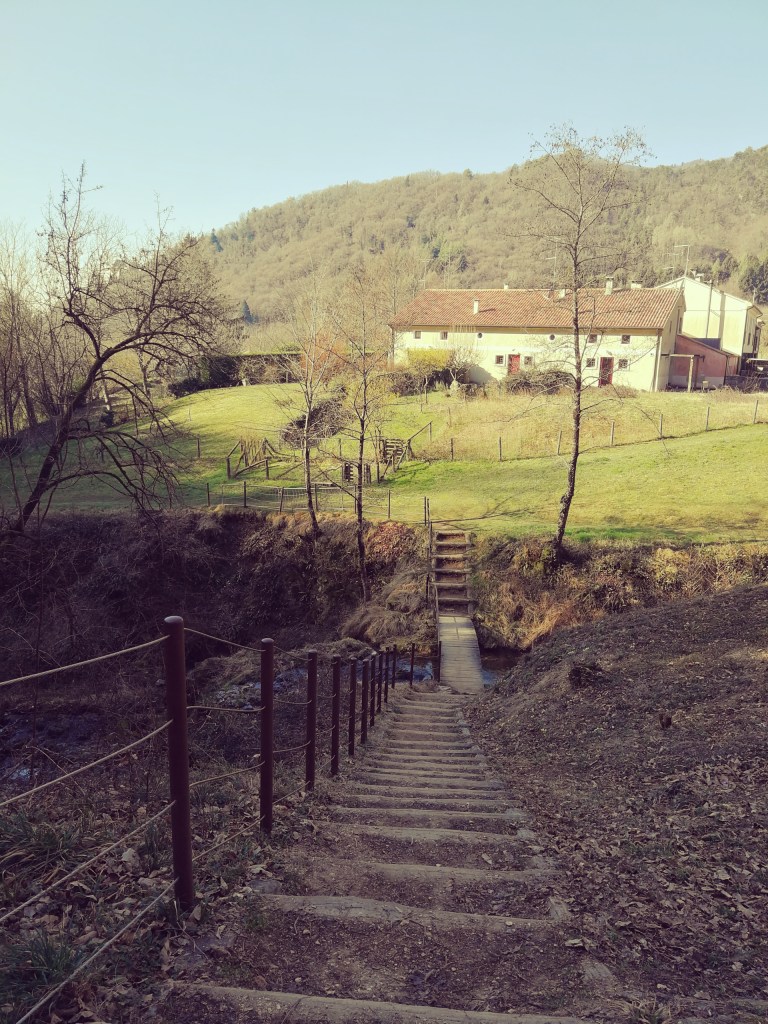 La passeggiata presenta alcune diramazioni ed è possibile arrivare fino al ‘Bosco delle Penne Mozze’. In breve siamo al ponte di pietra (con una magnifica casa in stile) che attraversiamo per giungere in Via Serenissima (a sinistra) e iniziare la Via dei Mulini.