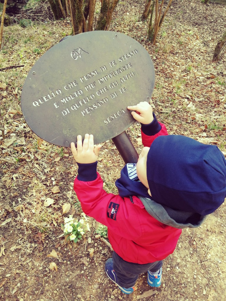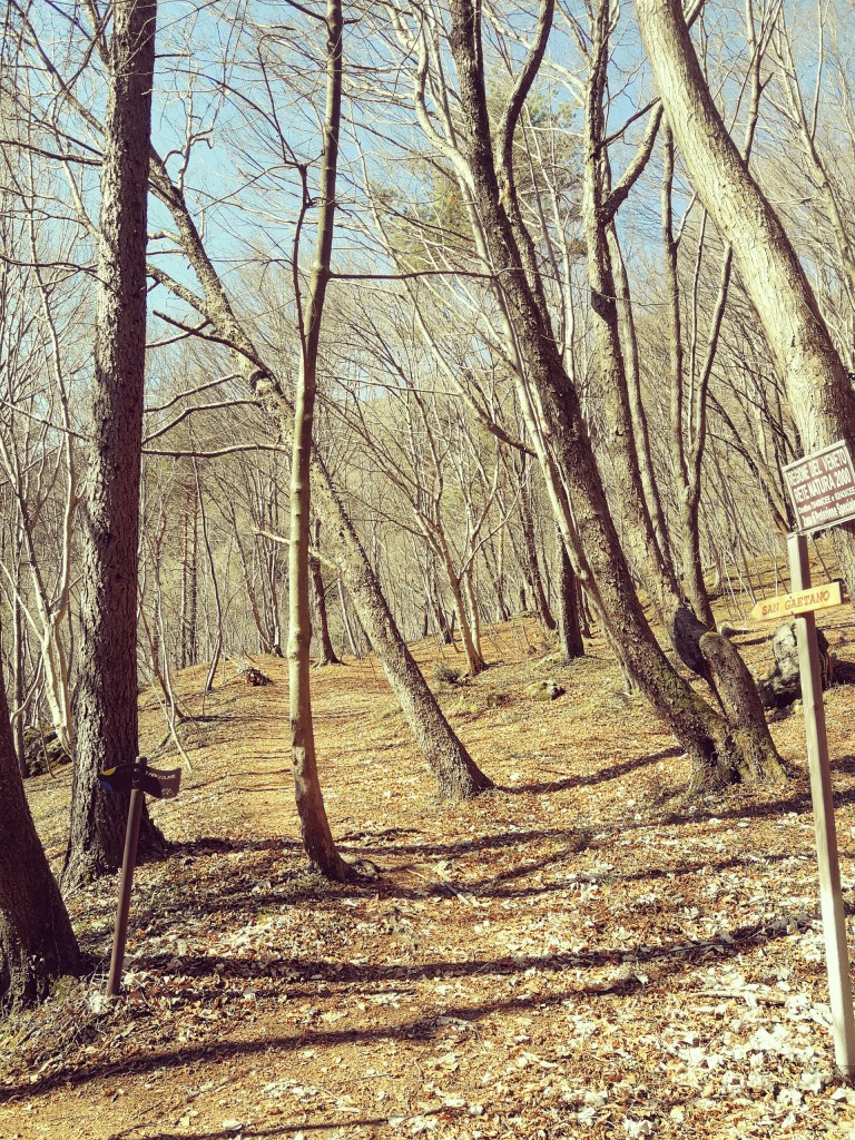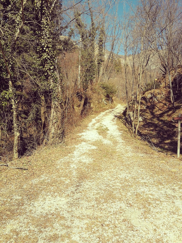 Andiamo avanti lungo il sottobosco e arriviamo in un grande prato, a sinistra un ponte con una sbarra di ferro, mentre più in sù un parcheggio e il bosco delle penne mozze, un suggestivo memoriale creato per ricordare tutti gli alpini della provincia di Treviso caduti in guerra. Siamo al giro di boa, facciamo una breve pausa e poi si deve seguire brevemente la strada asfaltata che torna verso Cison di Valmarino, per poi rientrare nel bosco in prossimità della solita segnaletica (ricordate di seguire il colore giallo adesso). Ignorate le varie diramazioni che portano a S. Gaetano e che potrebbero confondervi le idee lungo il cammino. In alcuni tratti si ha l’impressione di perdersi perché la traccia si confonde sull’erba e perché a qualche palo in metallo manca il segnavia, ma basta prestare un po’ d’attenzione e seguire la stessa direzione della strada statale (più in basso a sinistra e a tratti visibile).