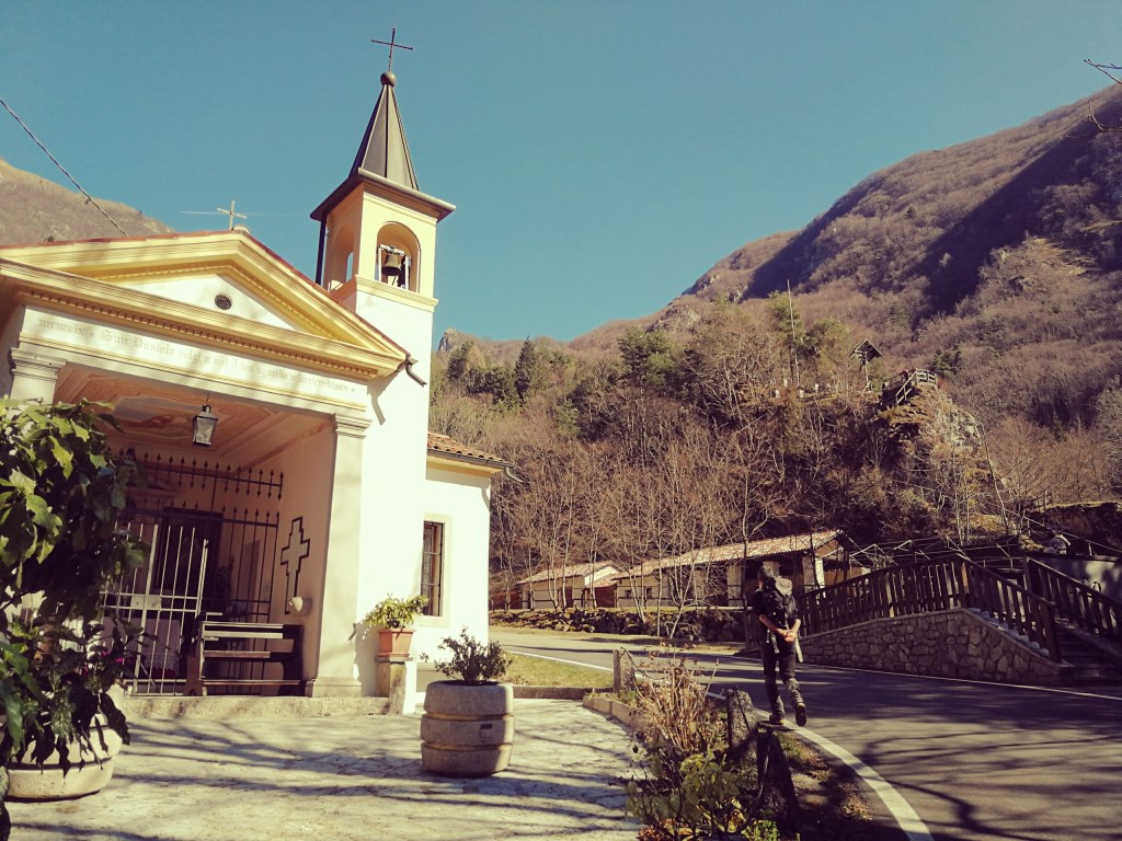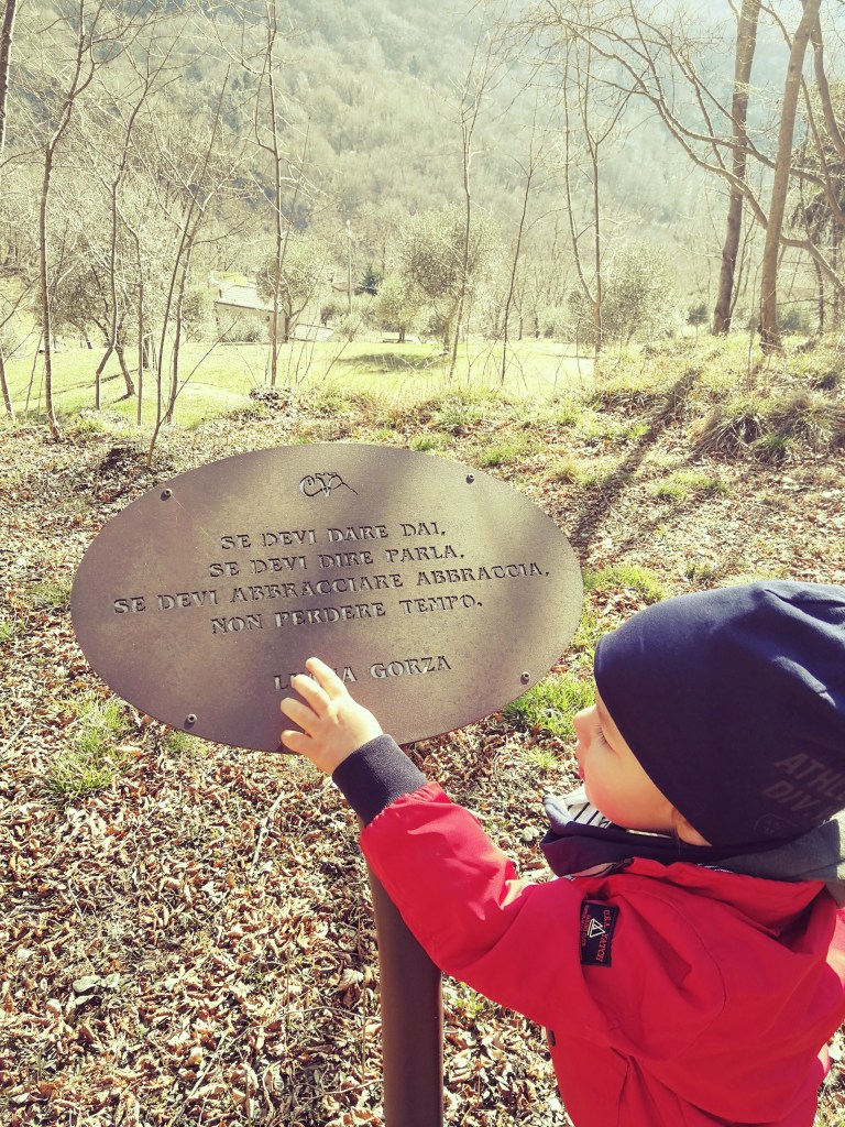 Continuiamo lungo la strada asfaltata, passiamo accanto alla casa dell’Associazione “la Via dei Mulini”, e poco più un la ecco la mappa del percorso con la prima fontanella. Procediamo lungo la strada asfaltata che poi diventa lastricata, seguiamo i cartelli di “Camminando per volare” che saranno molto utili per guidare i nostri passi. Giunti a una curva a gomito, giriamo a sinistra abbandonando il lastricato per lo sterrato che quasi subito si reimmette in una via di paese.