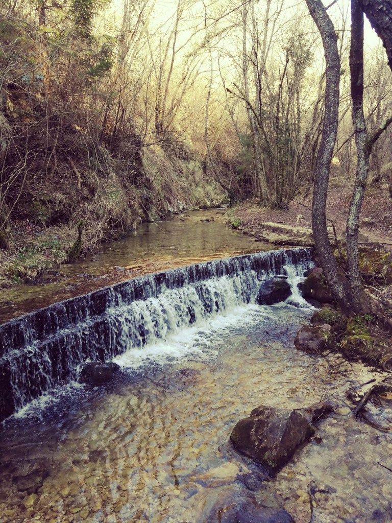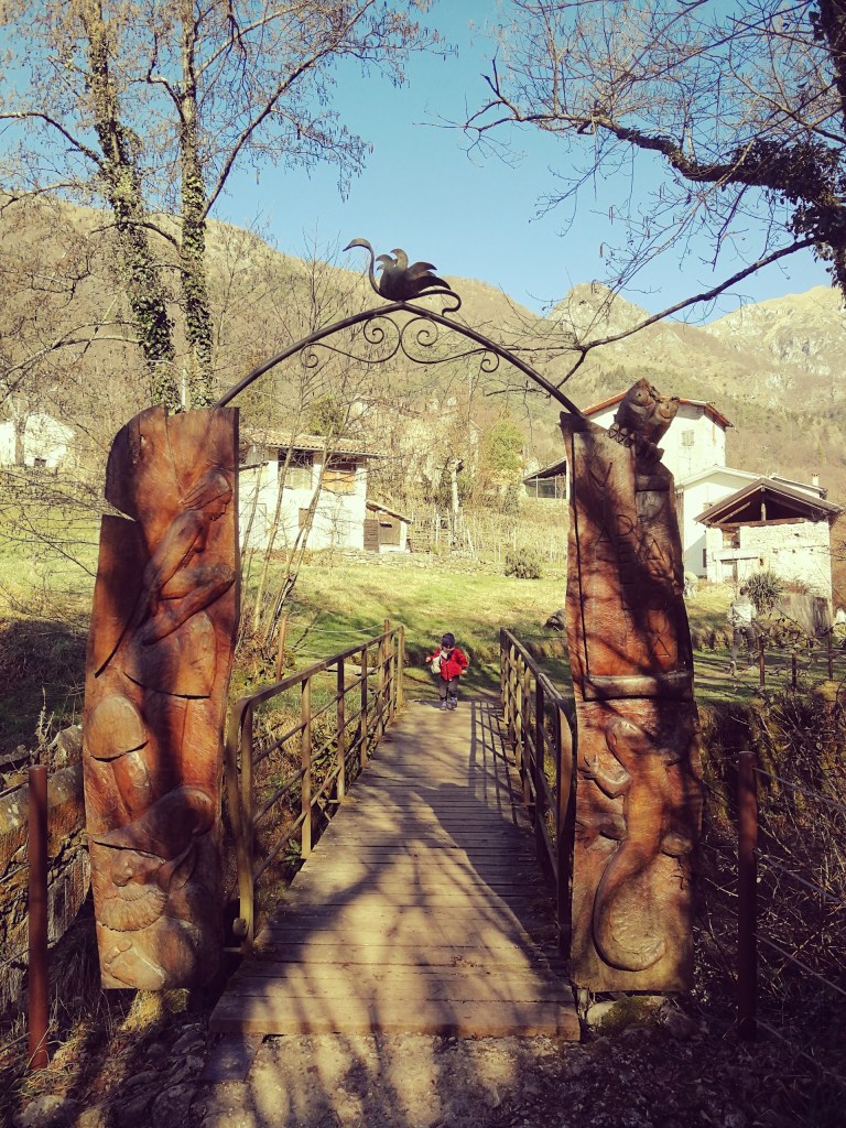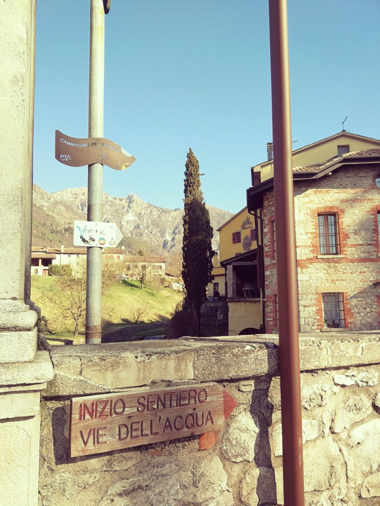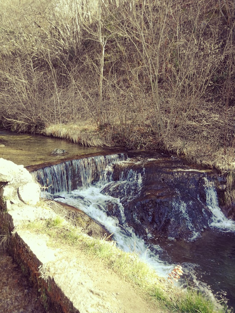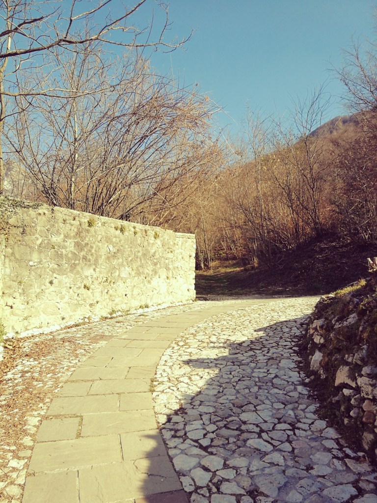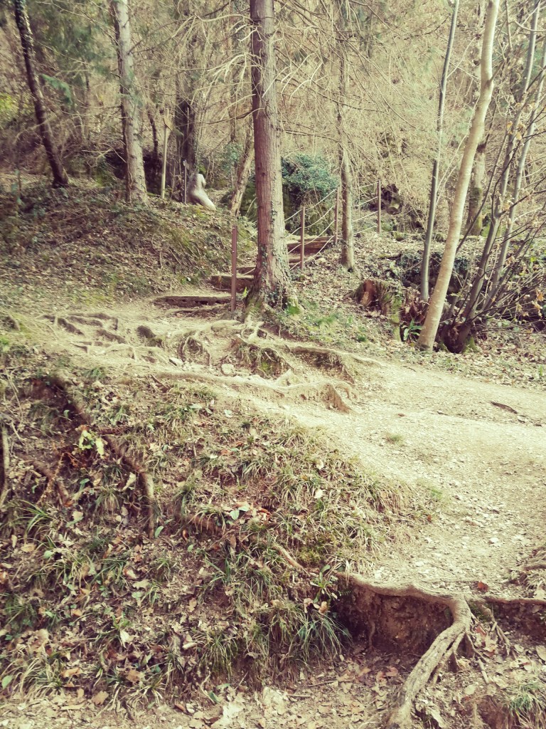 Superato il mulino inizia un pò di salitella tra le rocce umide, e raggiunta una scultura di un corpo di donna andiamo a sinistra seguendo le indicazioni. Camminiamo in piano lungo una via ben battuta con dell’acqua che scorre lungo una canaletta.