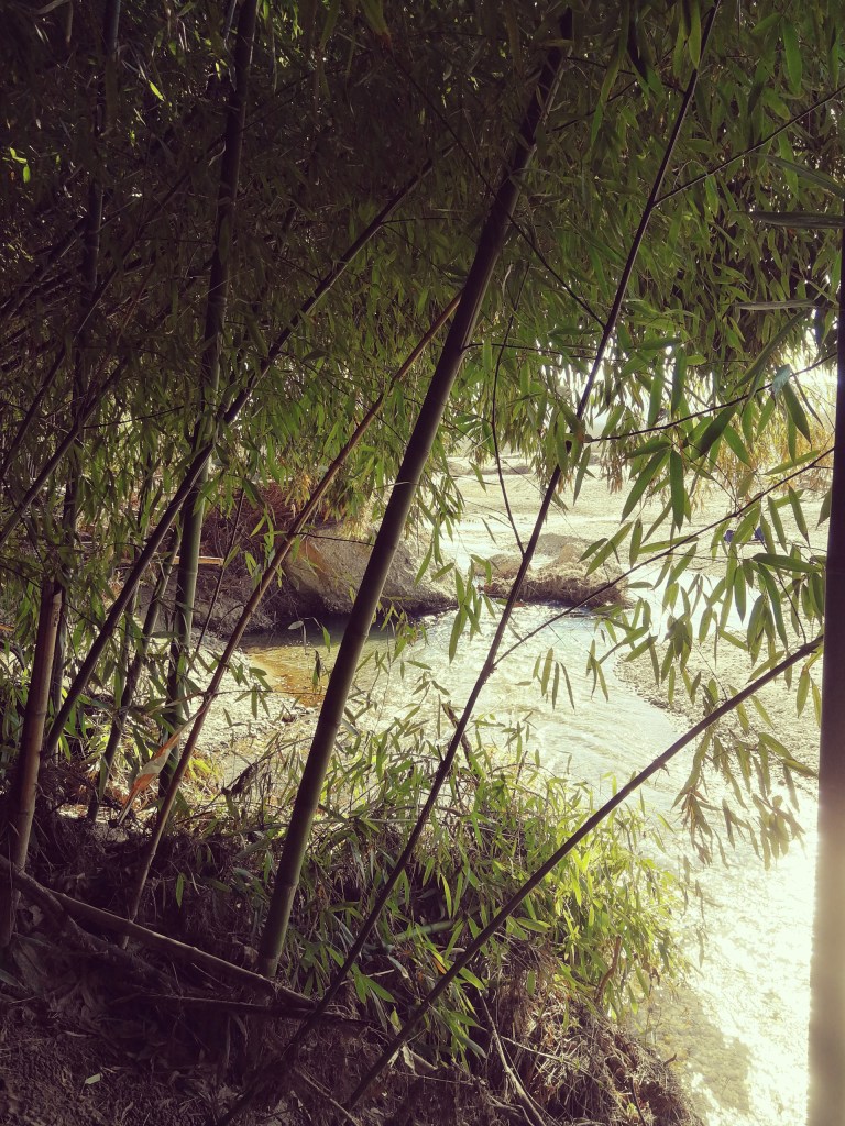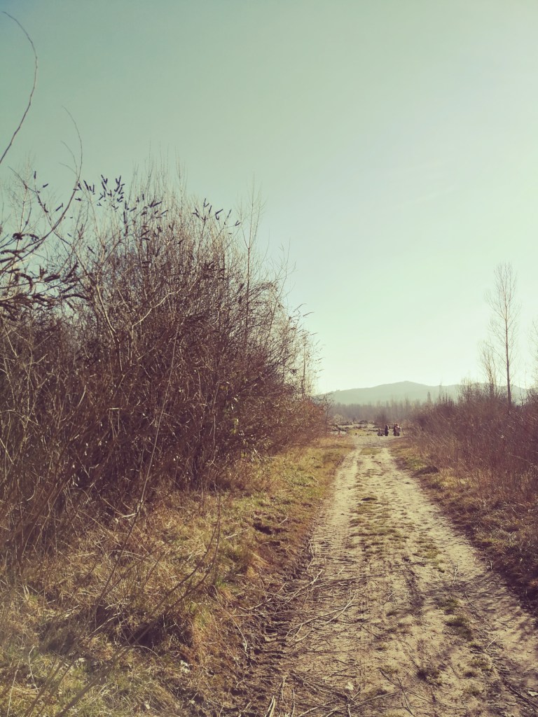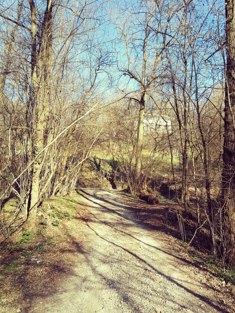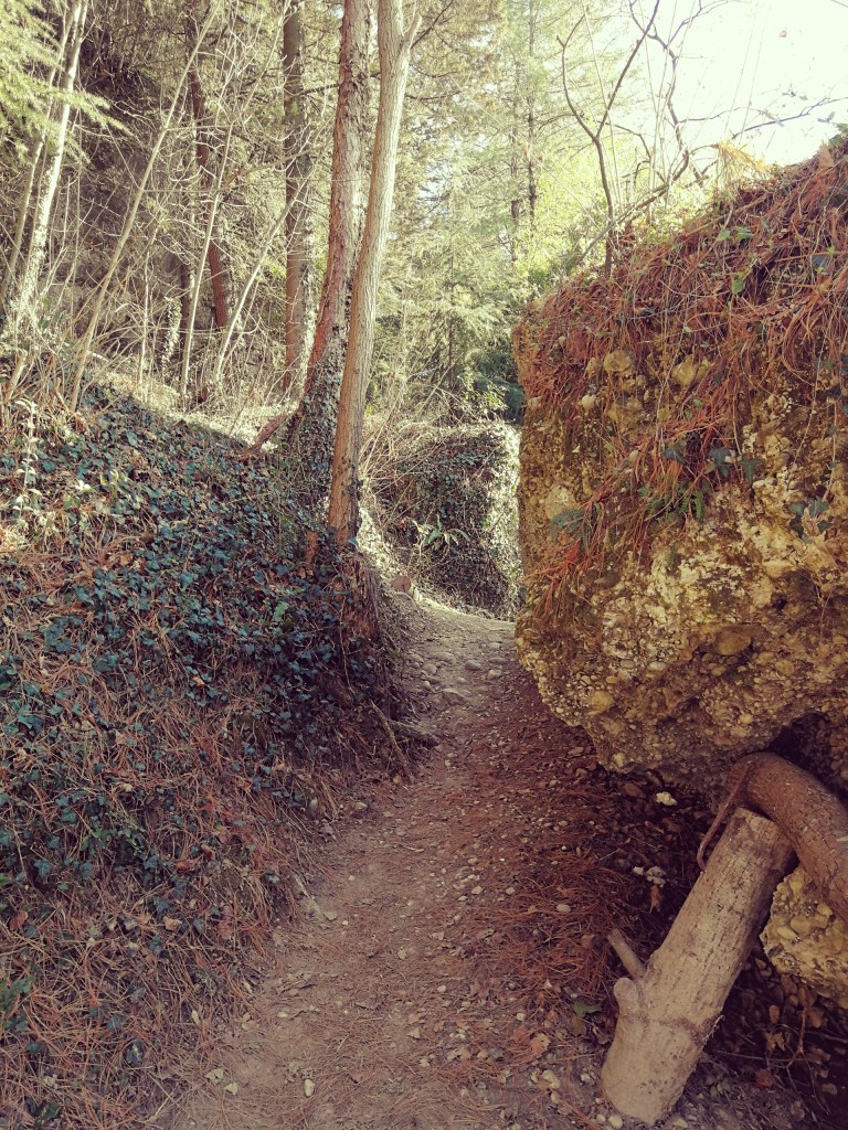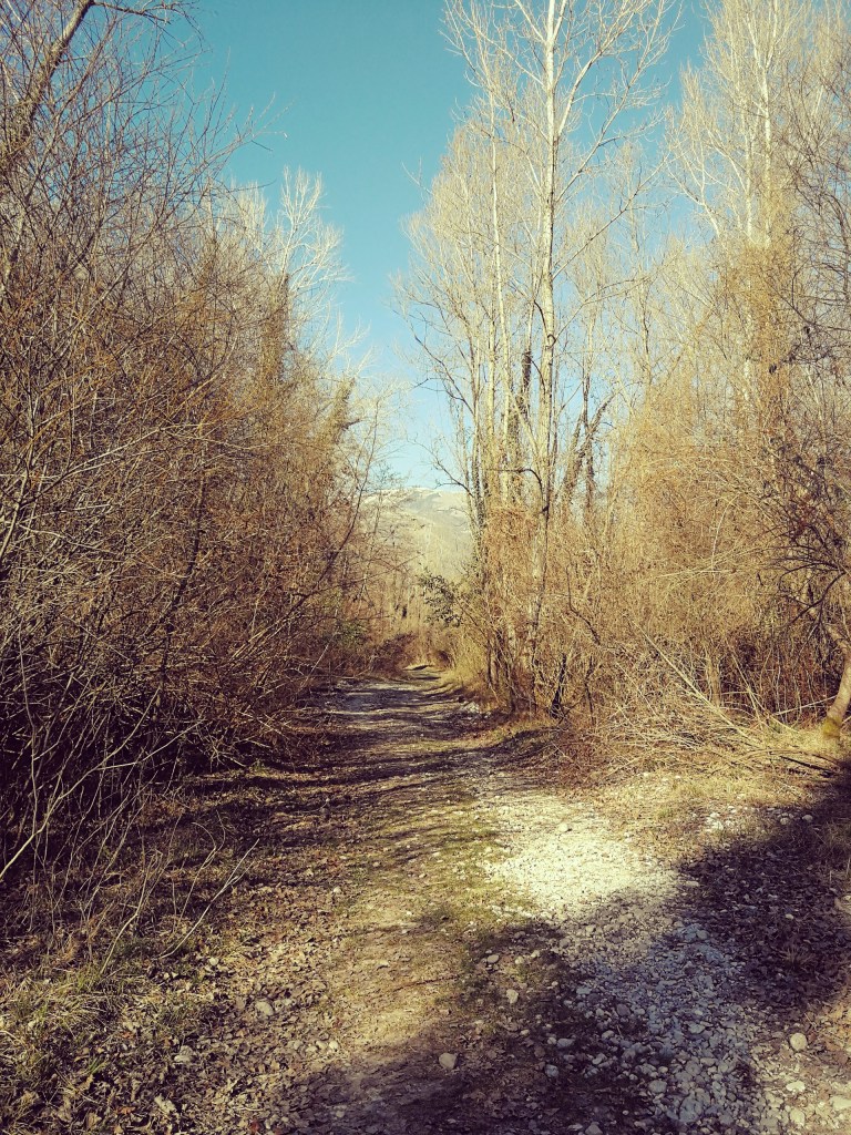Seguiamo verso nord il sentiero a lato del ponticello d’accesso alla radura e raggiungiamo una stradina ghiaiosa con sulla sinistra un guado (quando il fiume non è in secca), seguiamo invece verso destra la stradina.