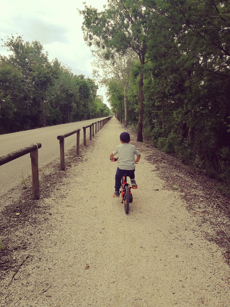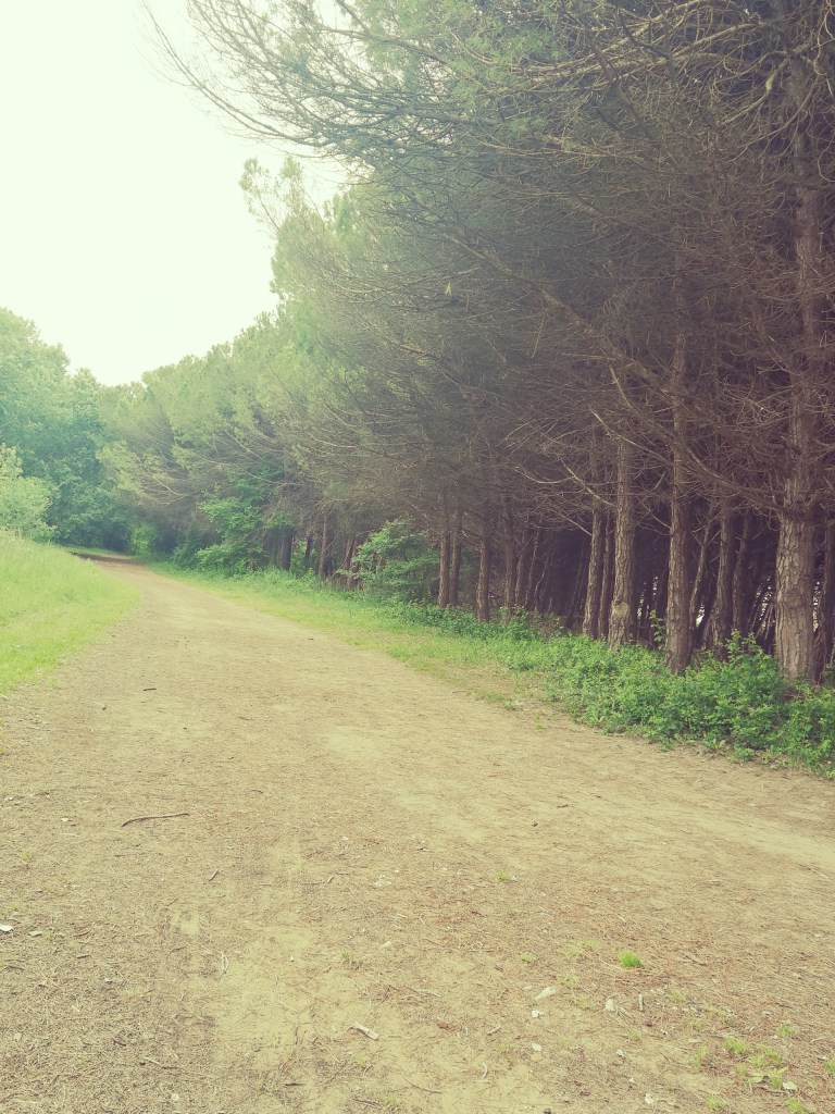 Parcheggio alle spalle, ci inoltriamo a destra nella pineta lungo un viale infinito, incontrando spesso degli accessi alla spiaggia. Il percorso è semplice e alla portata di tutti, può essere praticata anche con una city bike come la mia, il terreno è in parte sabbioso, sterrato ma accessibile.