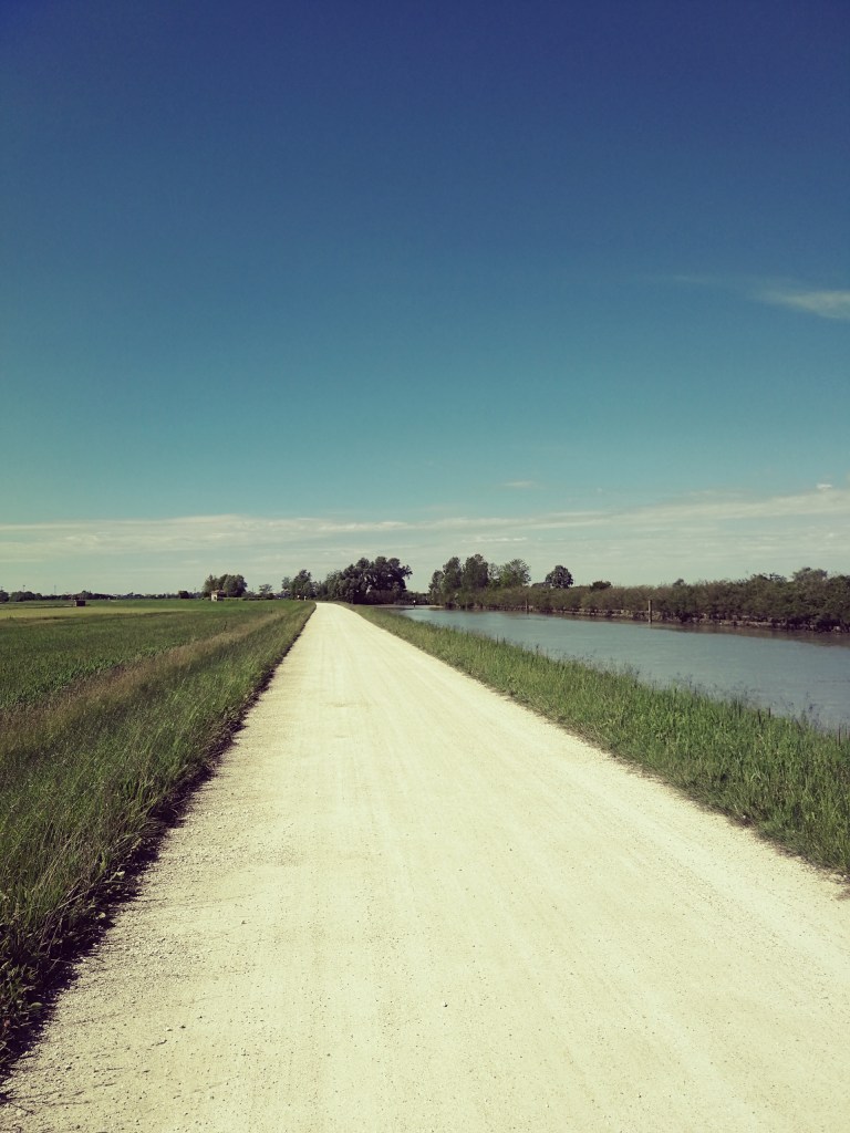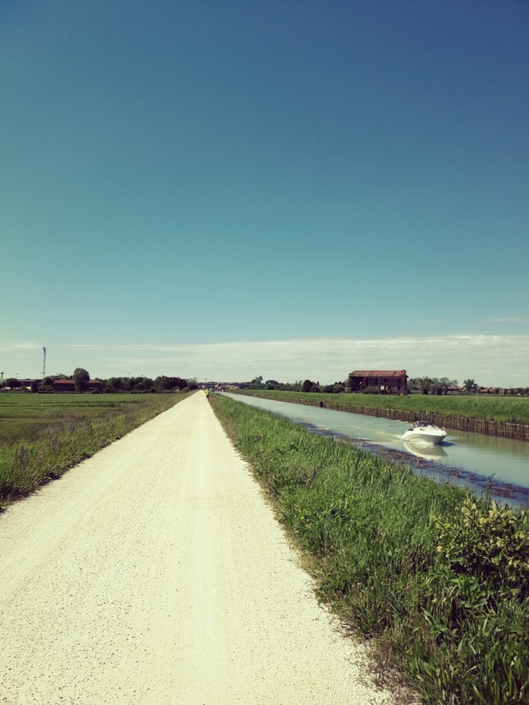 strade secondarie asfaltate, argini in terra battuta e ghiaia, breve tratto di percorso urbano, in parte non aperto al traffico automobilistico.