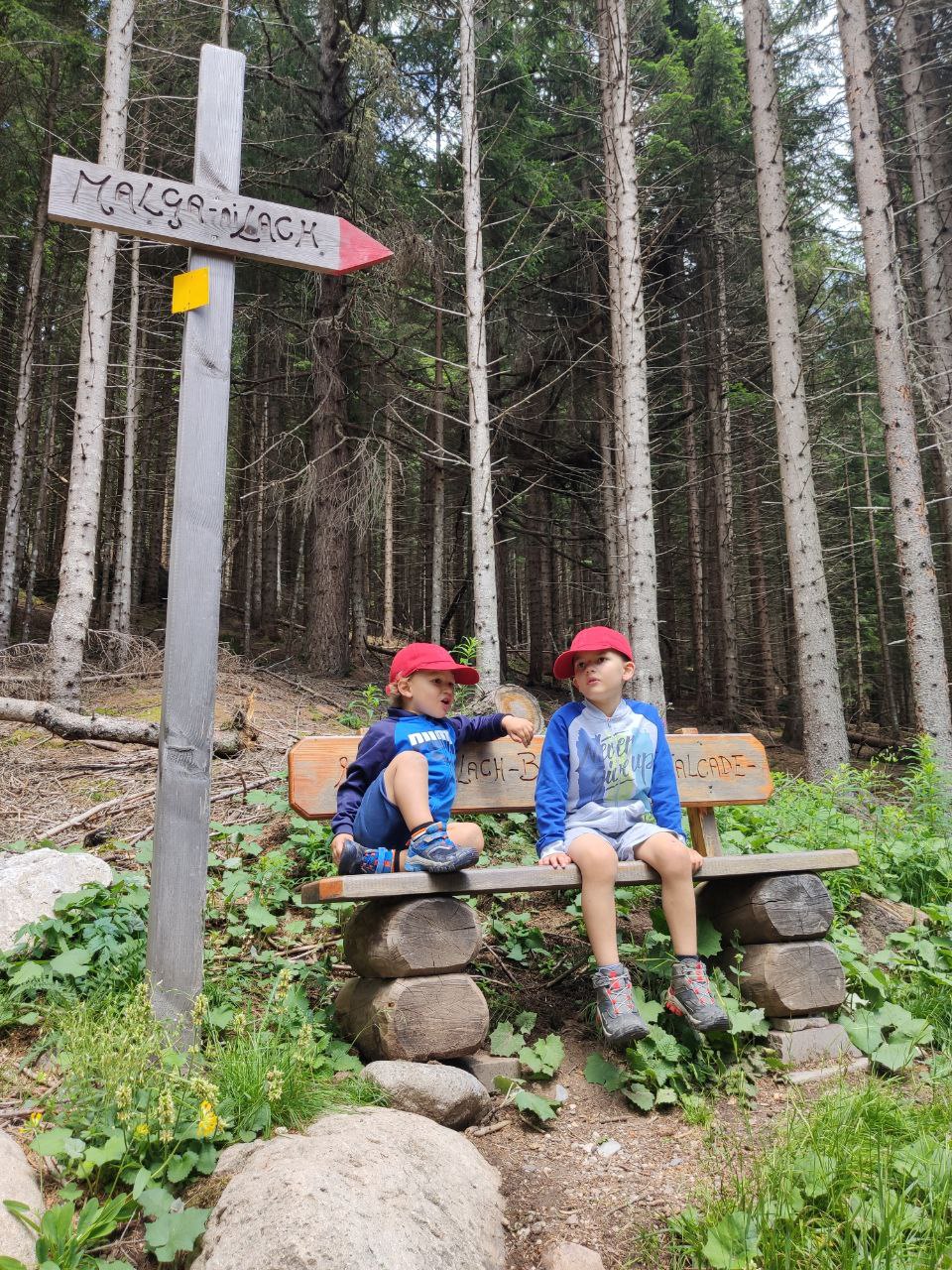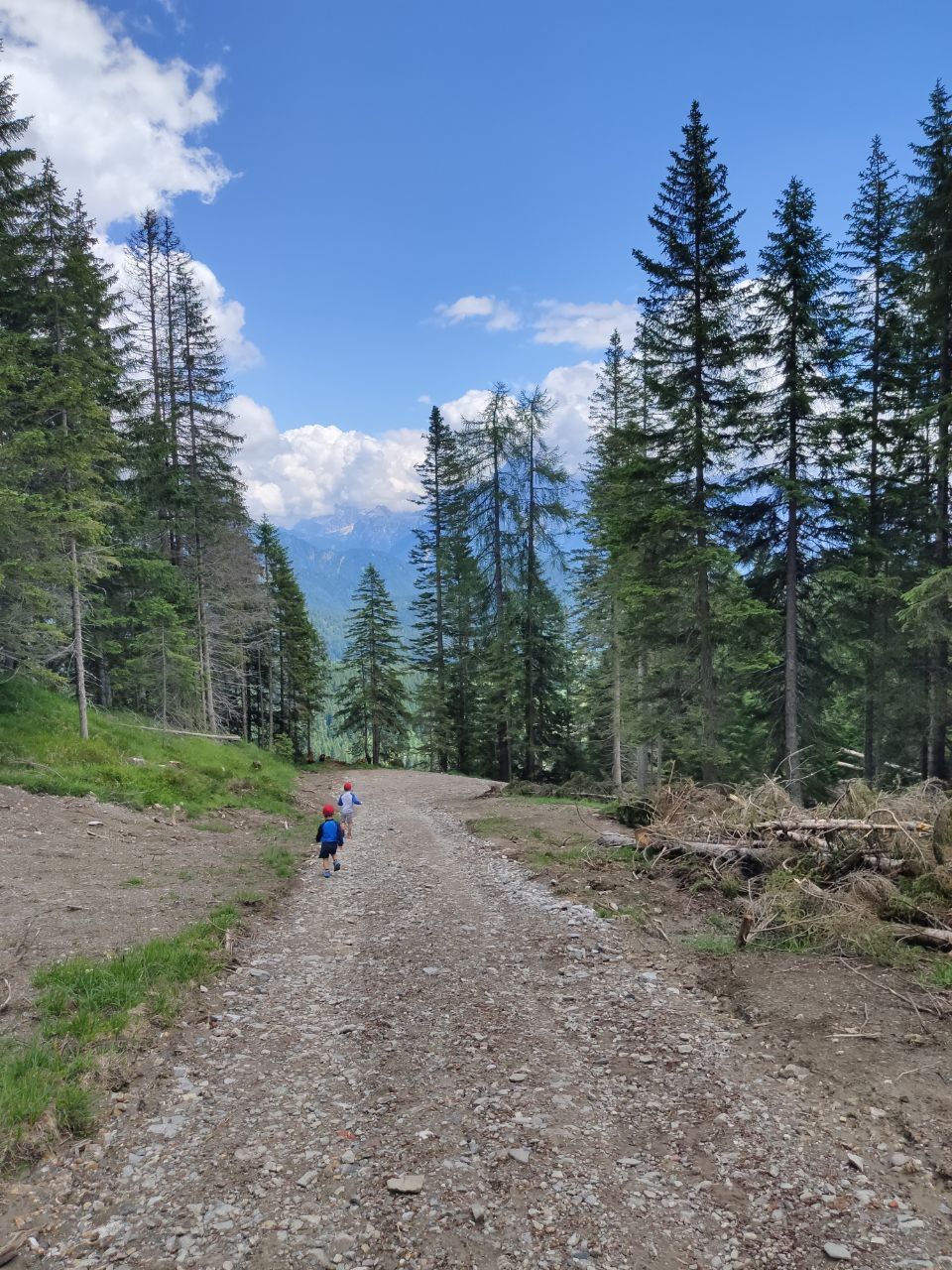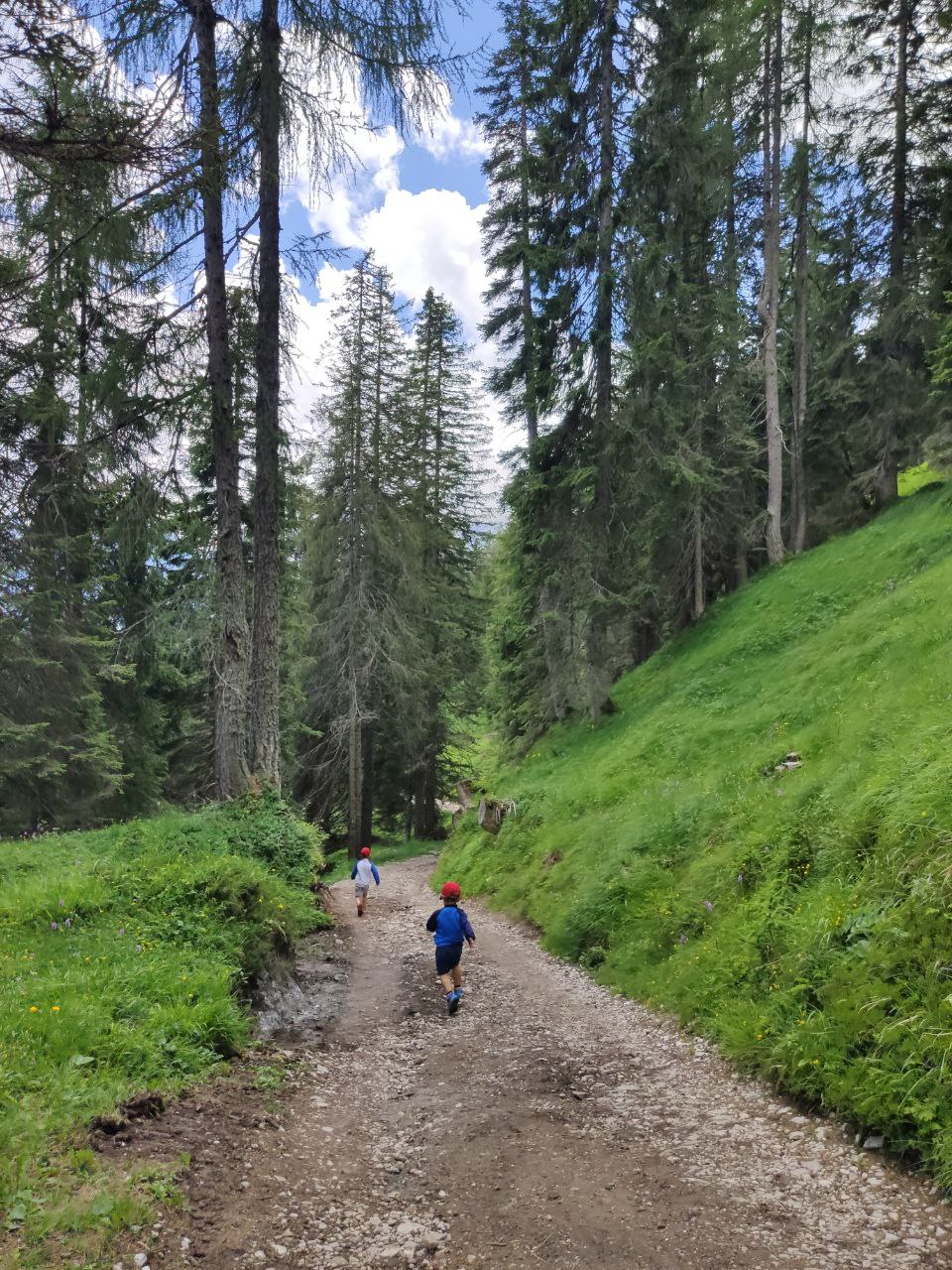 Camminare soli nel bosco con noi genitori senza incrociare quasi mai nessuno, attraversare sentieri solcati dalle radici dei pini mughi, salire in cima tra le rocce e guardare l’infinito. Questa per loro è la vera avventura.