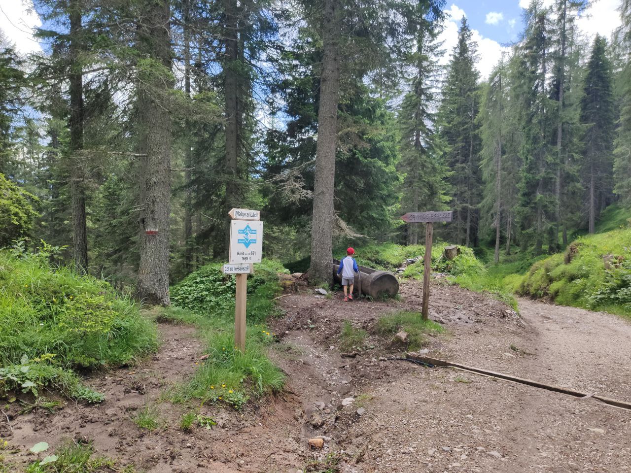 Ci incamminiamo per altri 20 minuti, lasciamo alle spalle la fiabesca Valfredda e proseguiamo a sinistra attraversando un ponticello e arrivando ad un punto dove il sentiero si divide in tre, dando la possibilità di salire al Rifugio Fuciade, a Forca Rossa o proseguire lungo il sentiero 691 fino a Malga ai Lach (la nostra direzione).