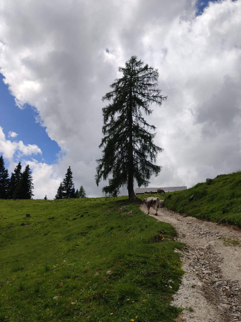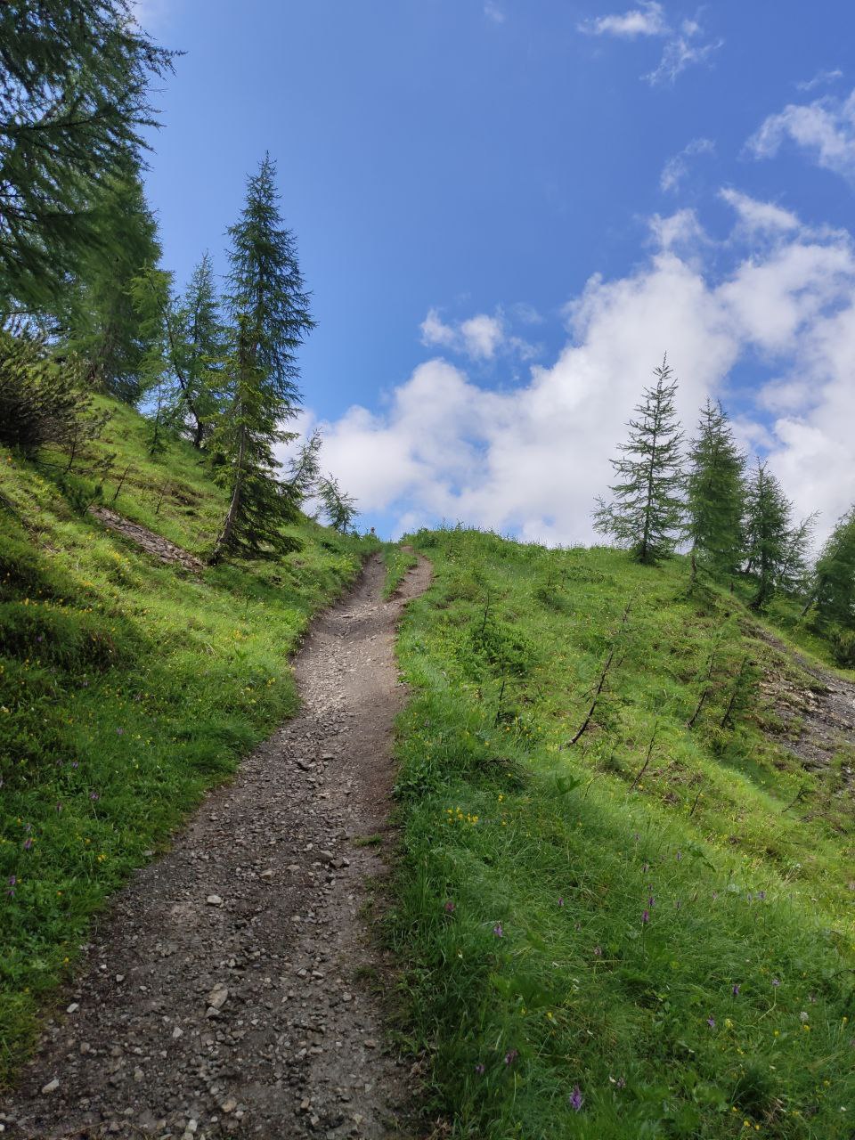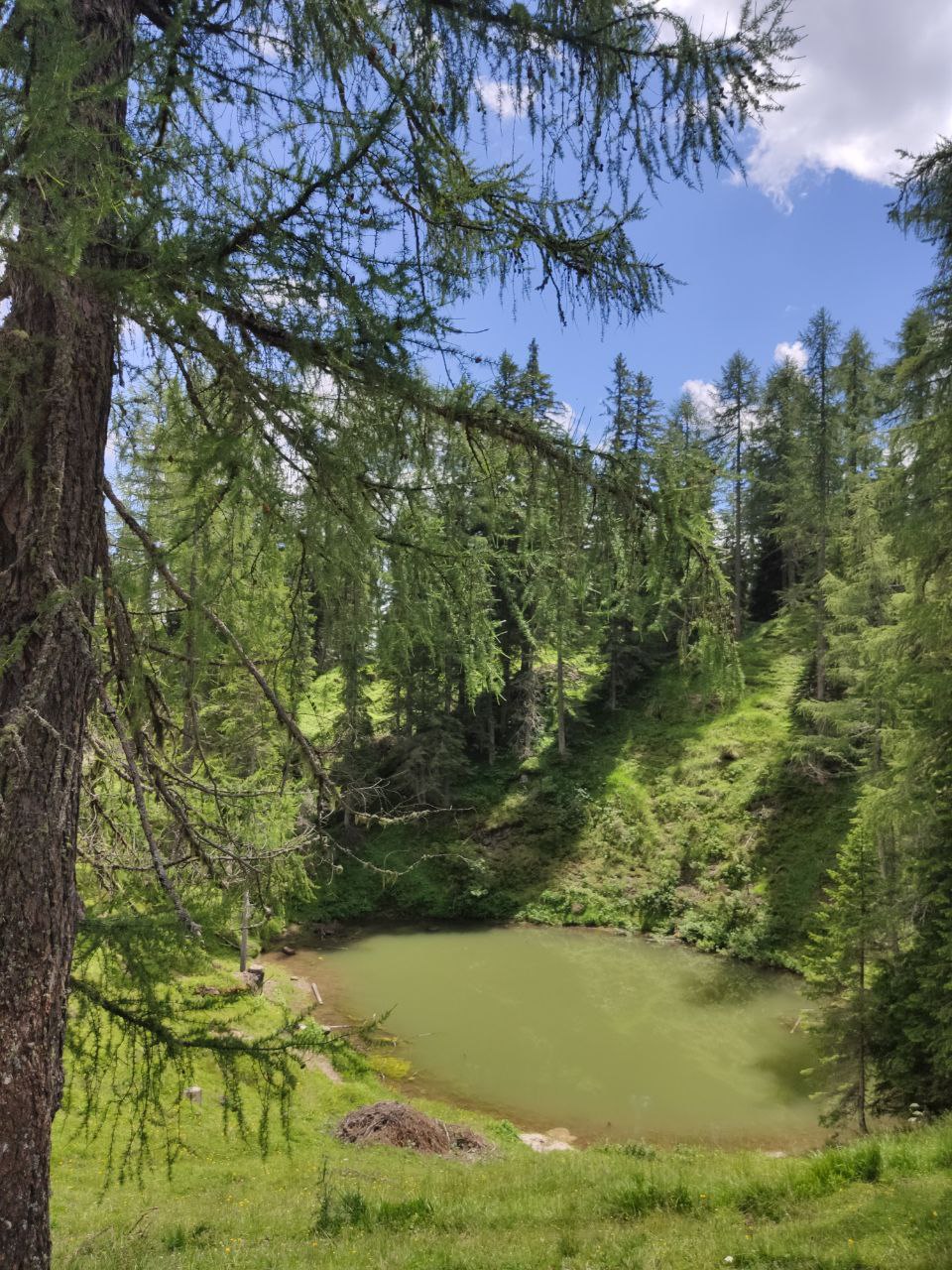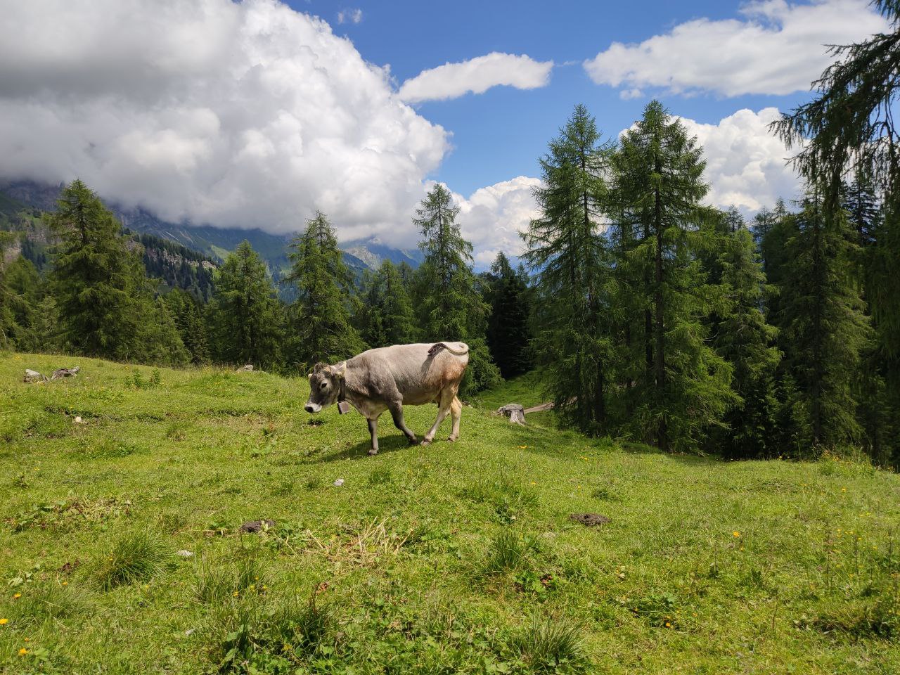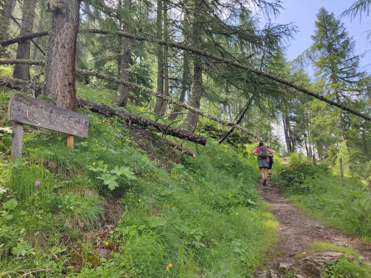 Da qui il sentiero diventa più stretto e in terra battuta, e dopo aver risalito i prati, arriveremo infine ad un bivio. Noi proseguiremo verso destra, immergendoci tra pini, abeti e larici, in costante e dolce salita.