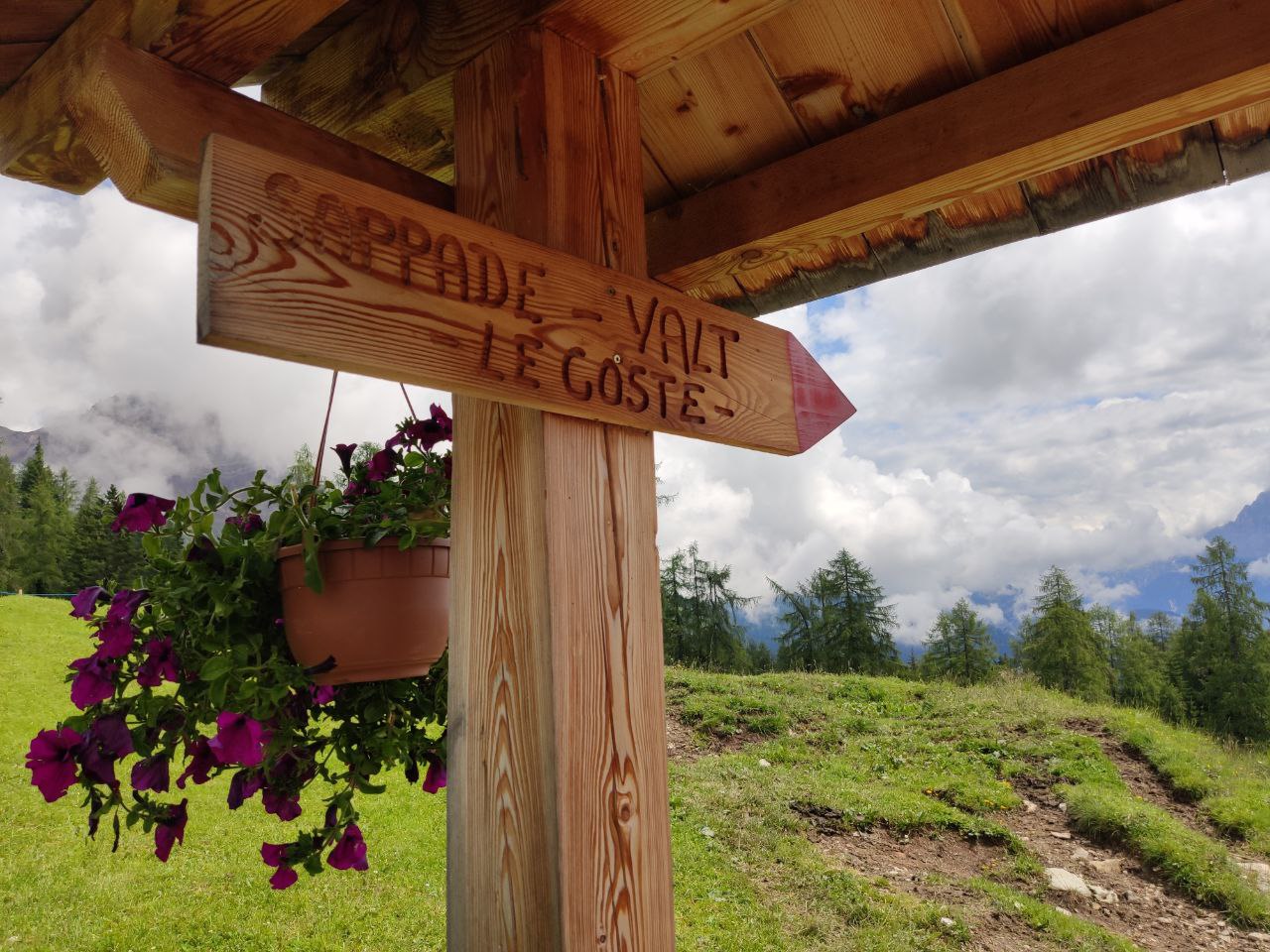 Dopo una meritata e gustosa sosta noi proseguiamo verso la seconda meta, Rifugio Flora Alpina (m.1860), seguiamo le indicazioni per Sappade – Valt – Le Coste, una discesa su ampio sentiero sterrato fino ad un bivio con indicazioni per il Rifugio Flora Alpina, dal quale sarà in costante salita fino alla meta.