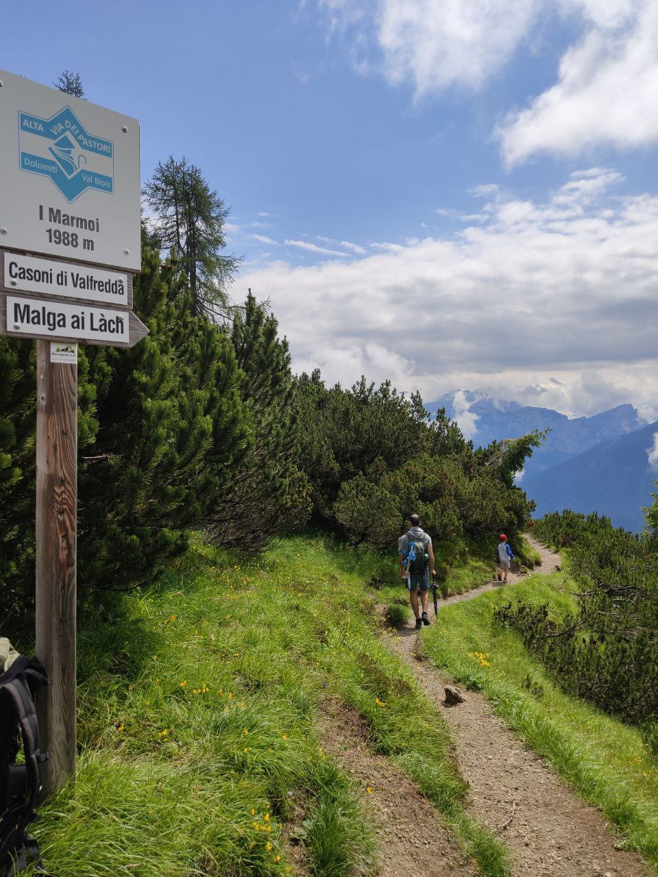 Lasciamo l’auto in uno dei parcheggi gratuiti in località Col de Mez, lungo la strada che da Falcade sale al Passo San Pellegrino, seguendo le indicazioni per Rifugio Flora Alpina. Si parte dai 1800 mt. del parcheggio, ci incamminiamo lungo la strada asfaltata fino all’indicazioni Malga ai Lach un sentiero sulla sinistra, percorrendo per un lungo tratto l’Alta Via dei Pastori. Non ci si può sbagliare un bel cartello ci indica la nostra meta a 50 minuti. Questo primo tratto si svolge su una strada sterrata in un continuo saliscendi prima al fresco sotto gli alberi del bosco attraversando pascoli e valli fiorite.
