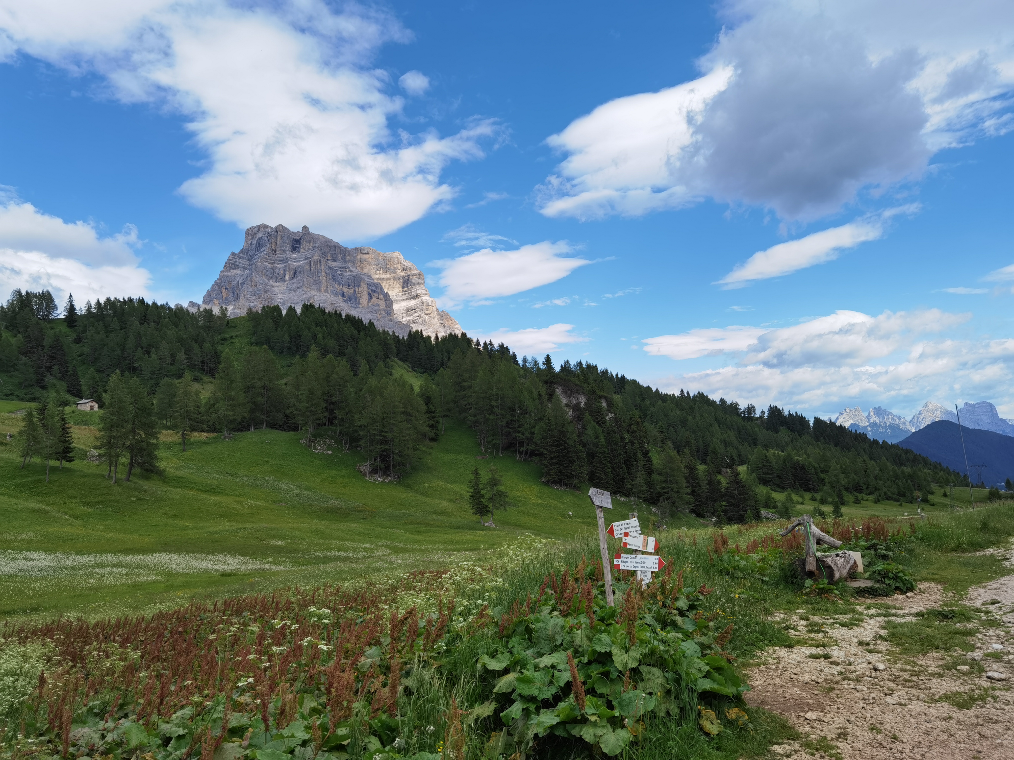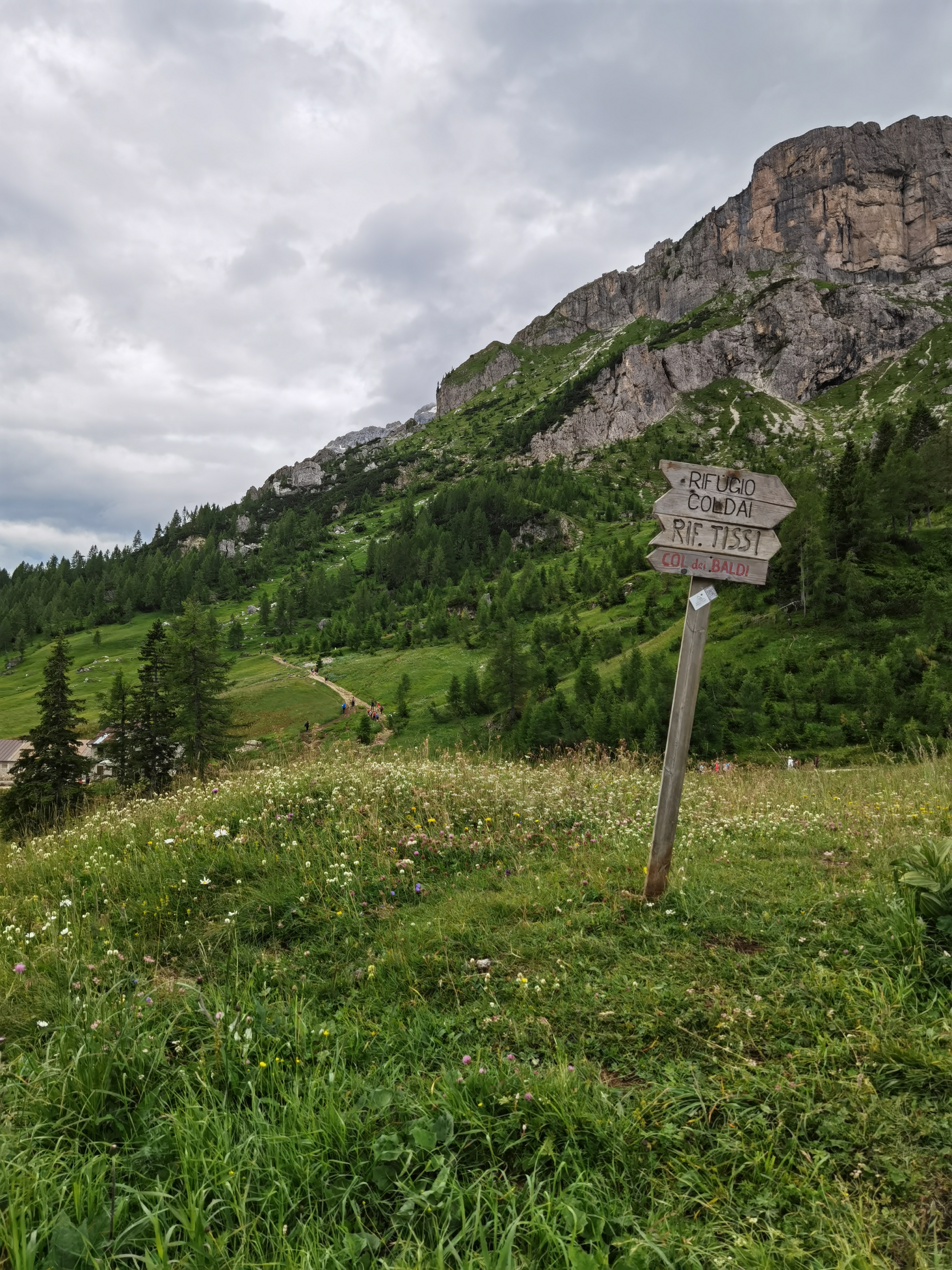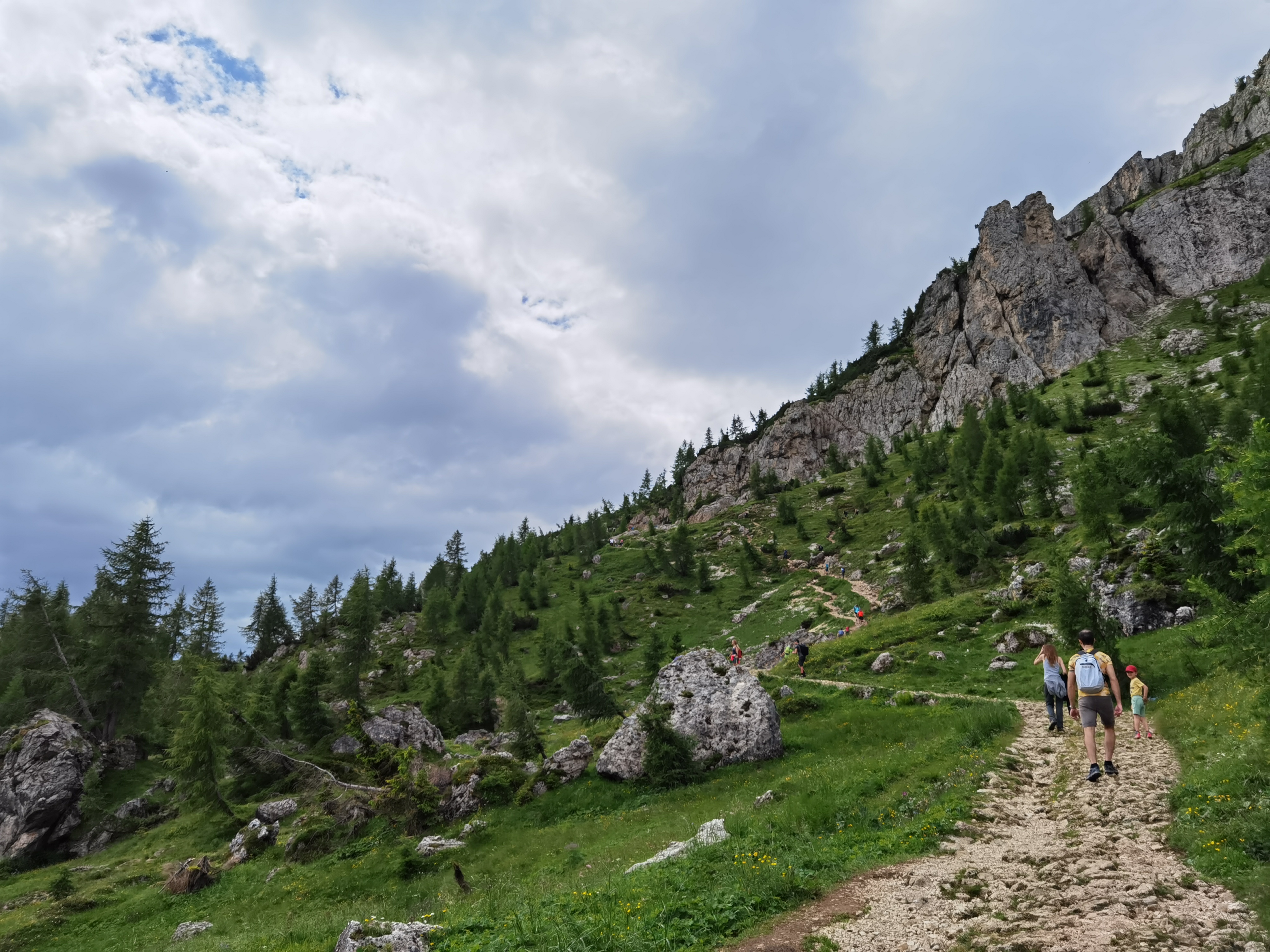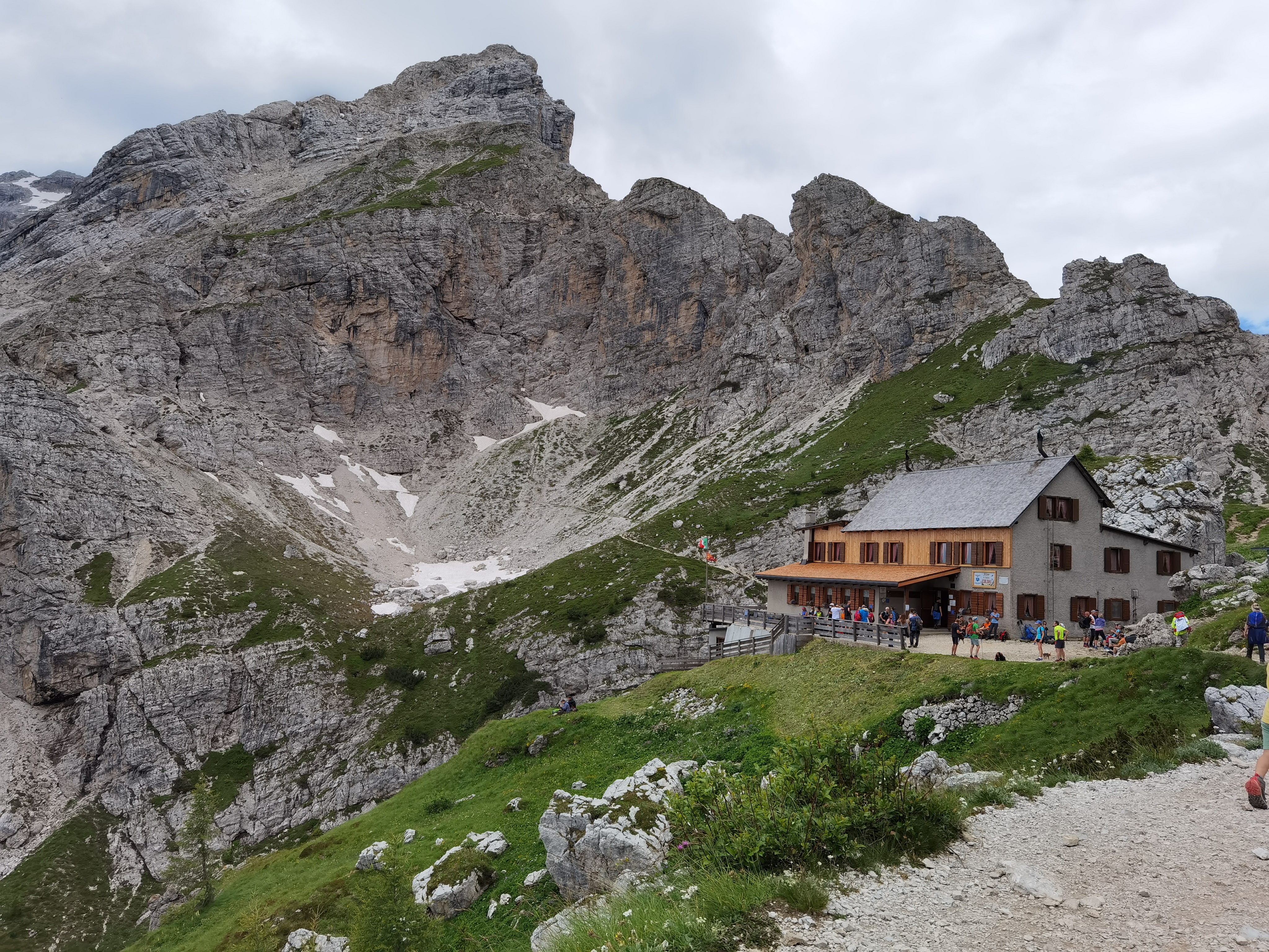 Il Monte Pelmo, che prima avevamo iniziato ad intravedere, ora si erge sempre più maestoso con il suo inconfondibile profilo. Dopo aver percorso tutto il sentiero lastricato in salita, il percorso prosegue nell’ultima parte del tracciato, molto più impegnativo, a causa anche della ghiaietta presente sul fondo. Dopo circa mezz’ora, il Rifugio Coldai (m.2132).