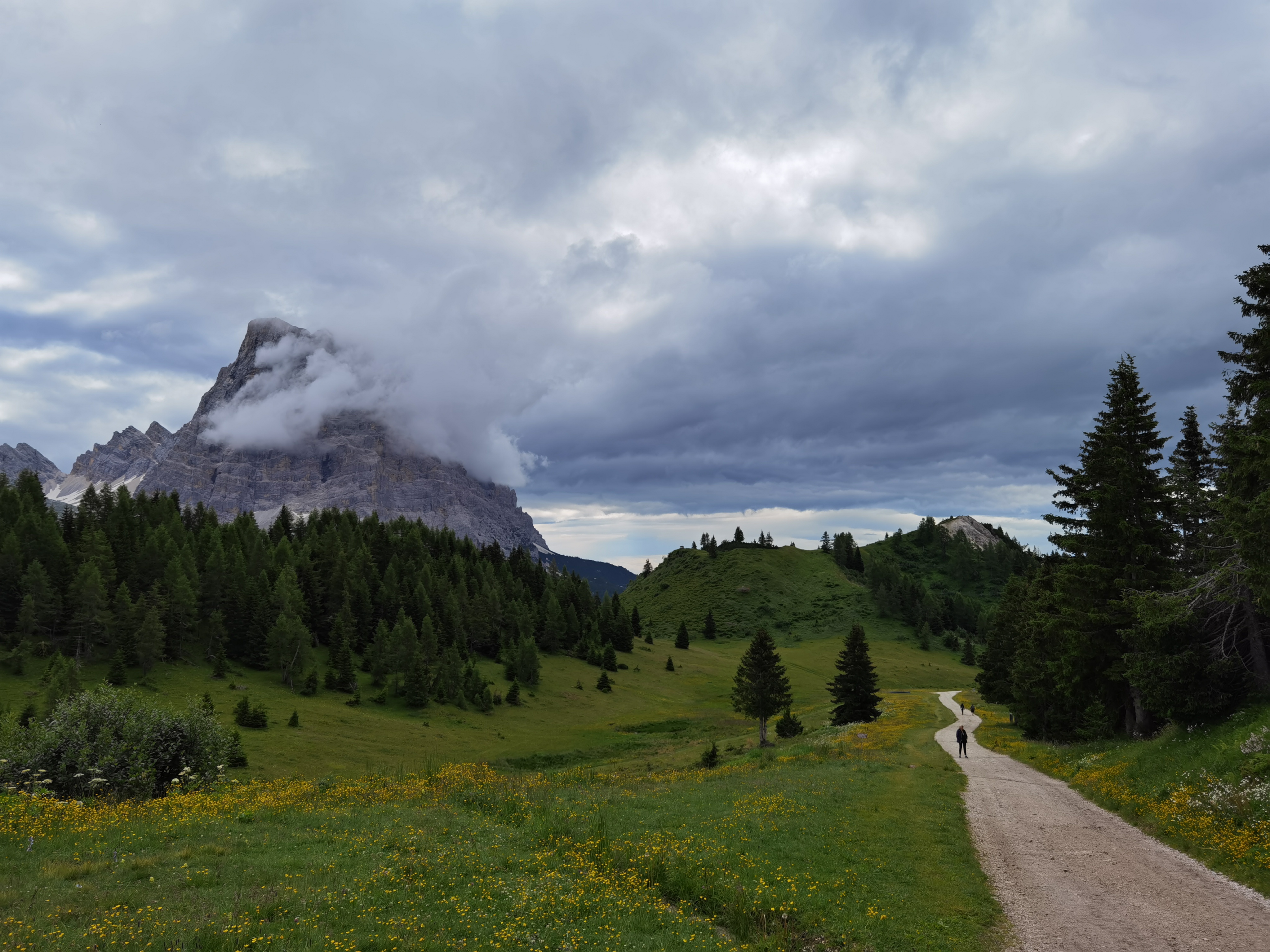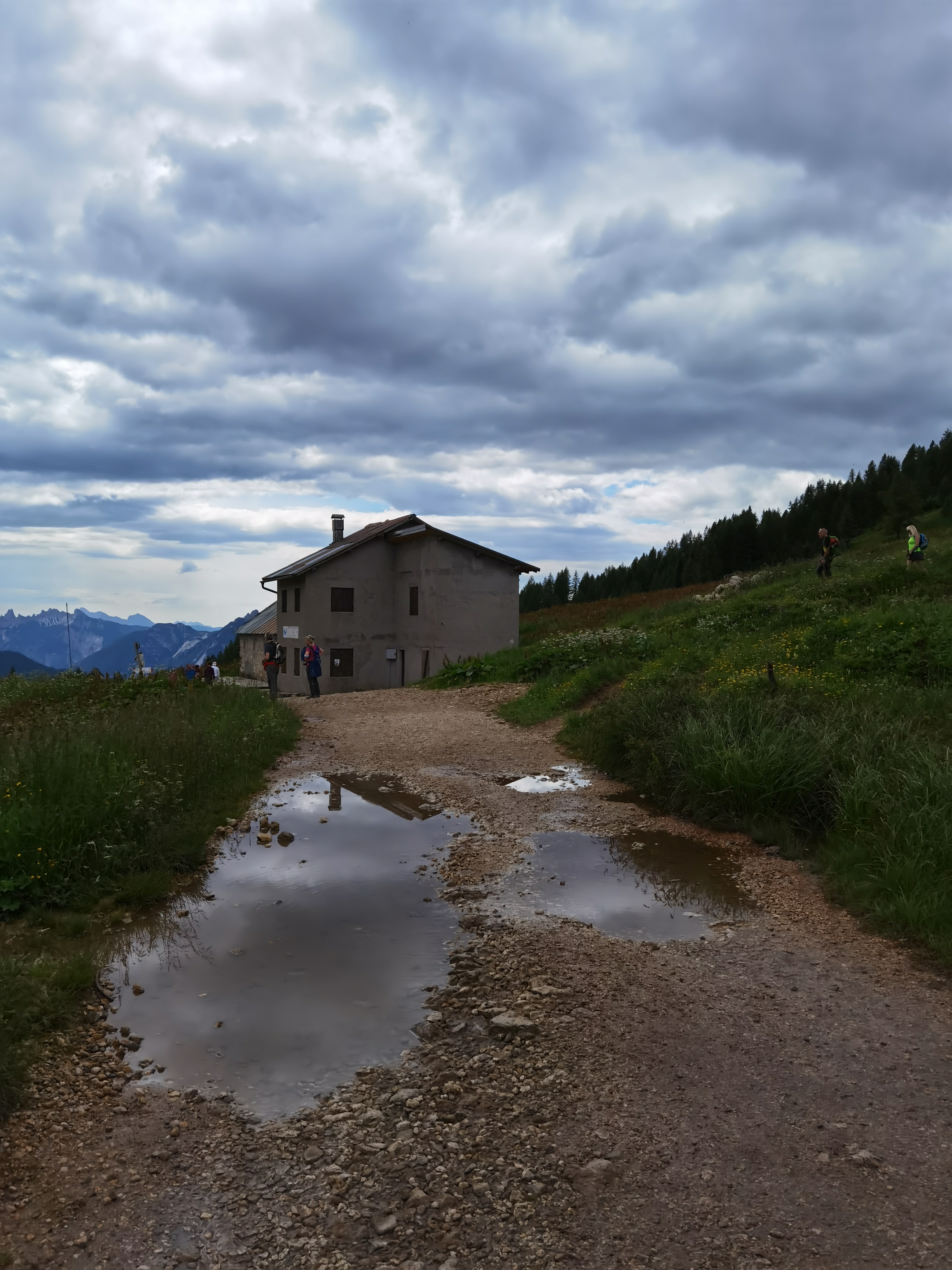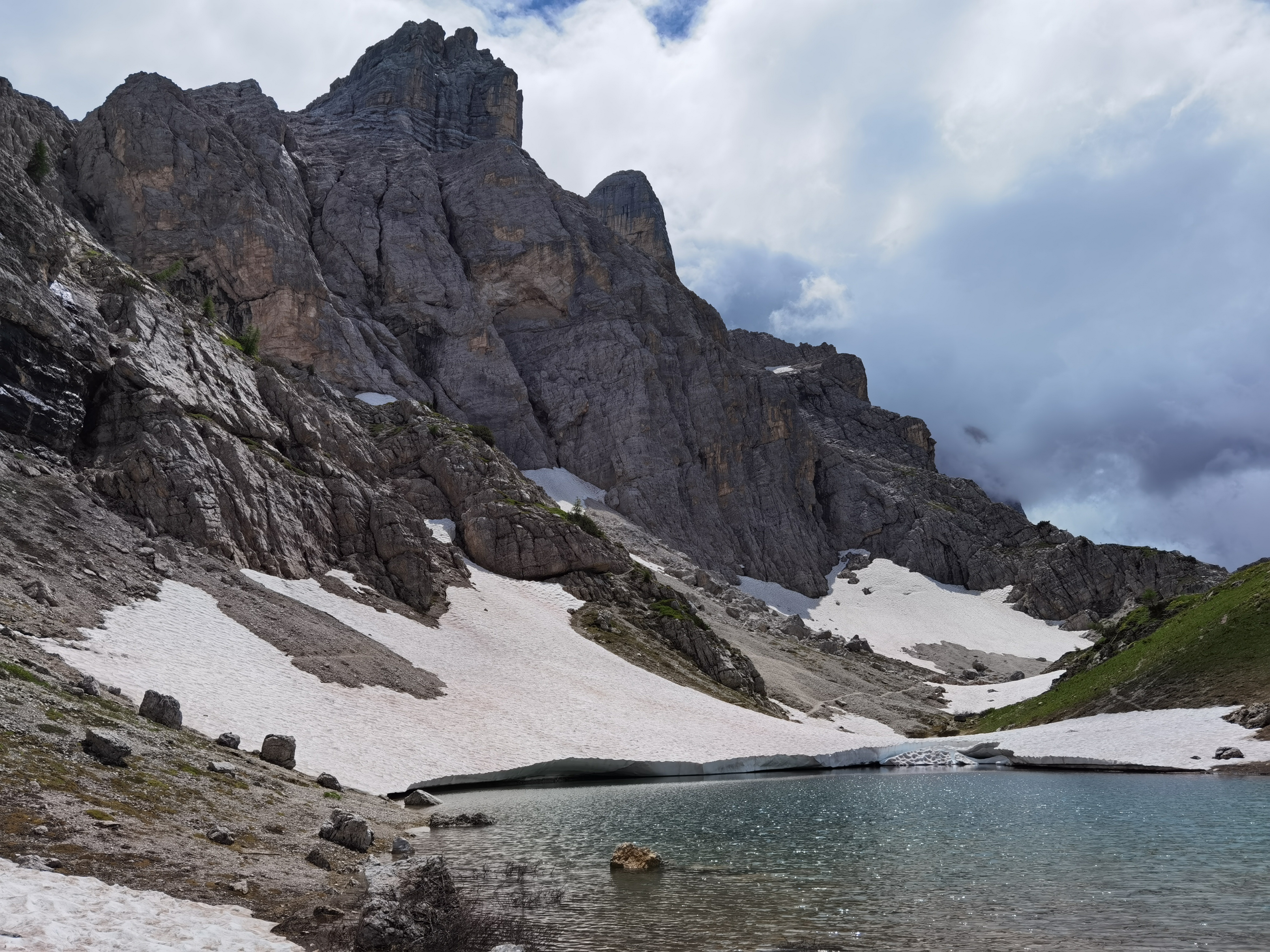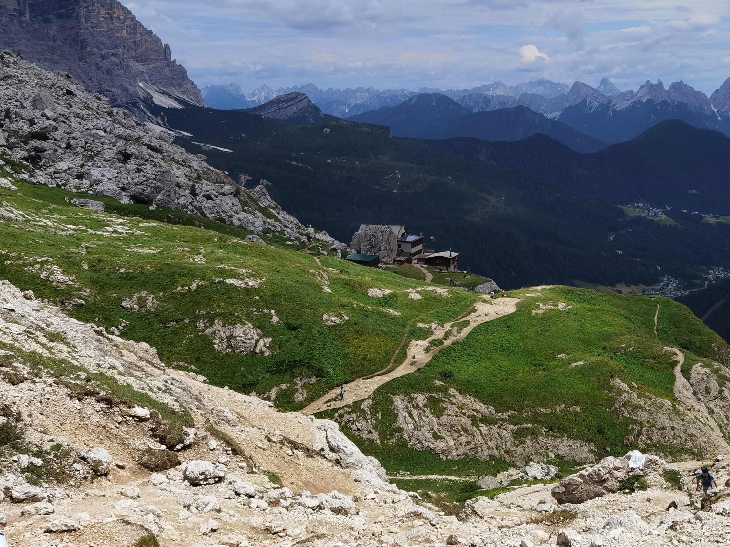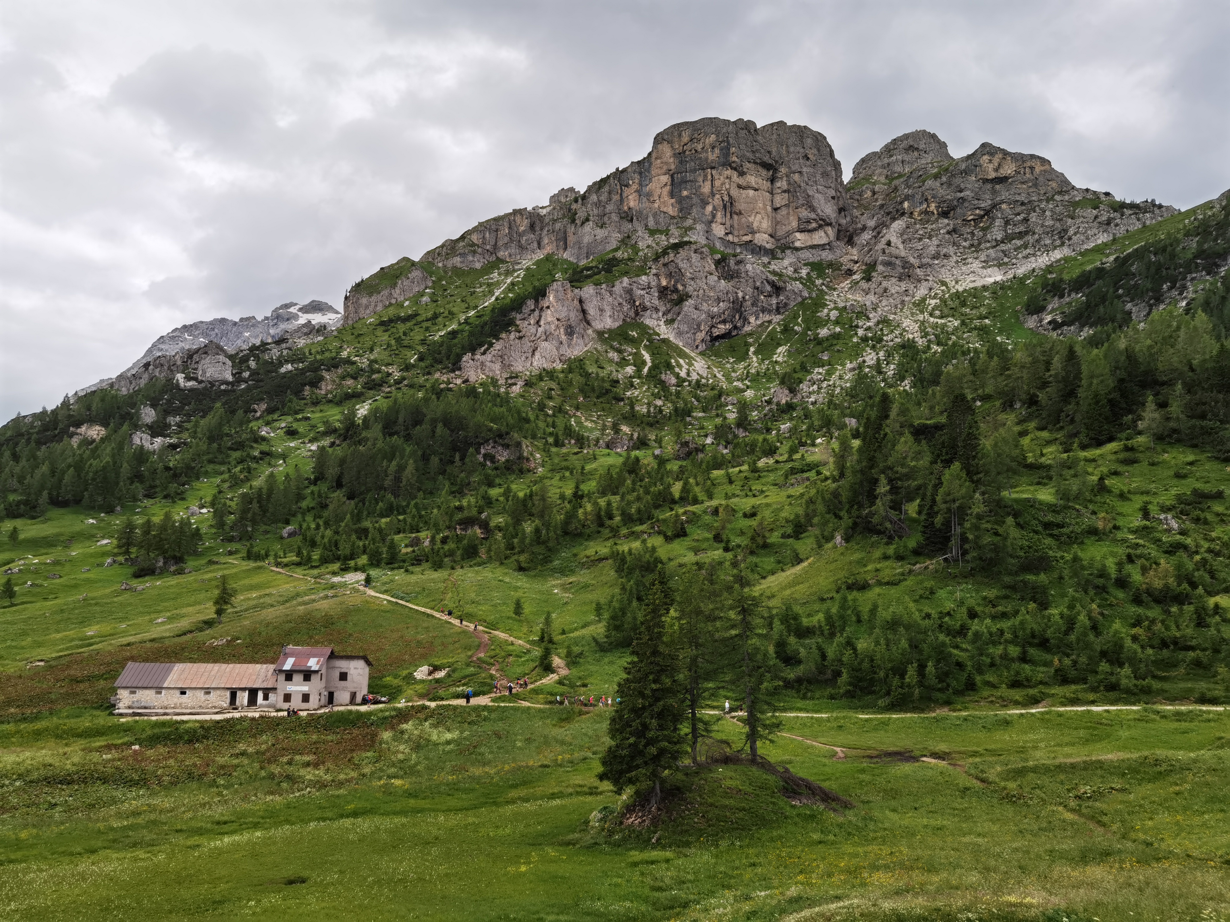 Il Monte Pelmo, che prima avevamo iniziato ad intravedere, ora si erge sempre più maestoso con il suo inconfondibile profilo. Dopo aver percorso tutto il sentiero lastricato in salita, il percorso prosegue nell’ultima parte del tracciato, molto più impegnativo, a causa anche della ghiaietta presente sul fondo. Dopo circa mezz’ora, il Rifugio Coldai (m.2132).