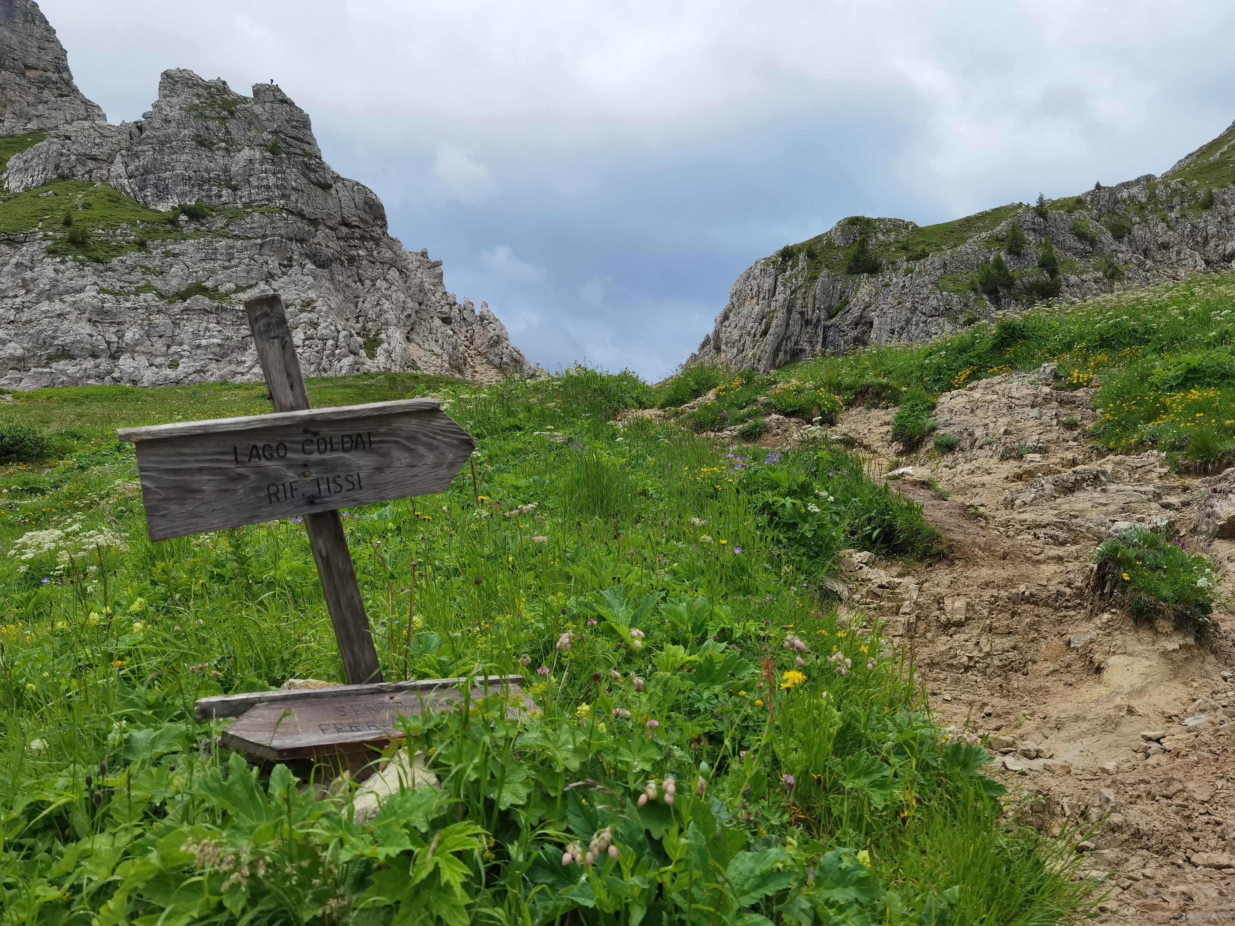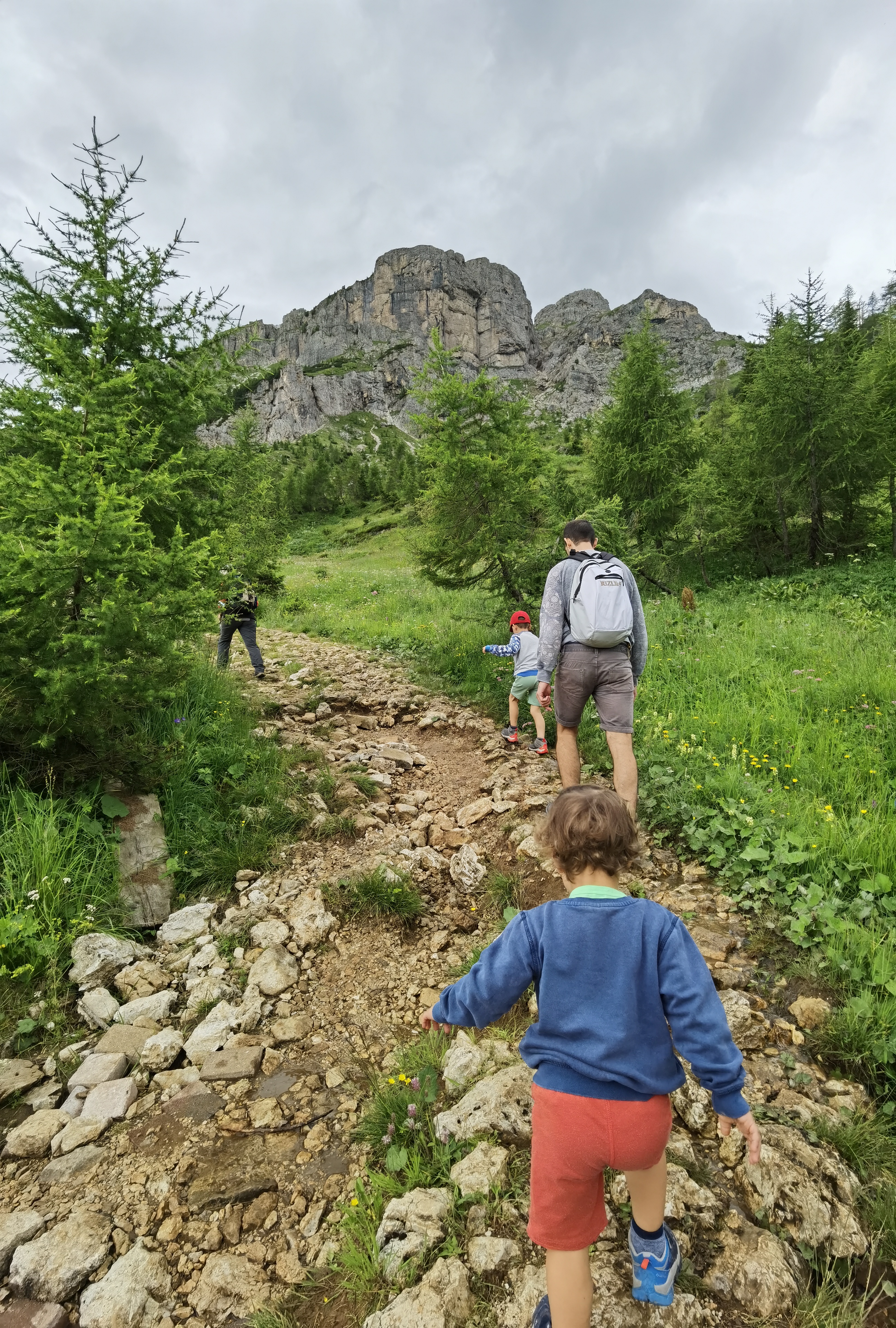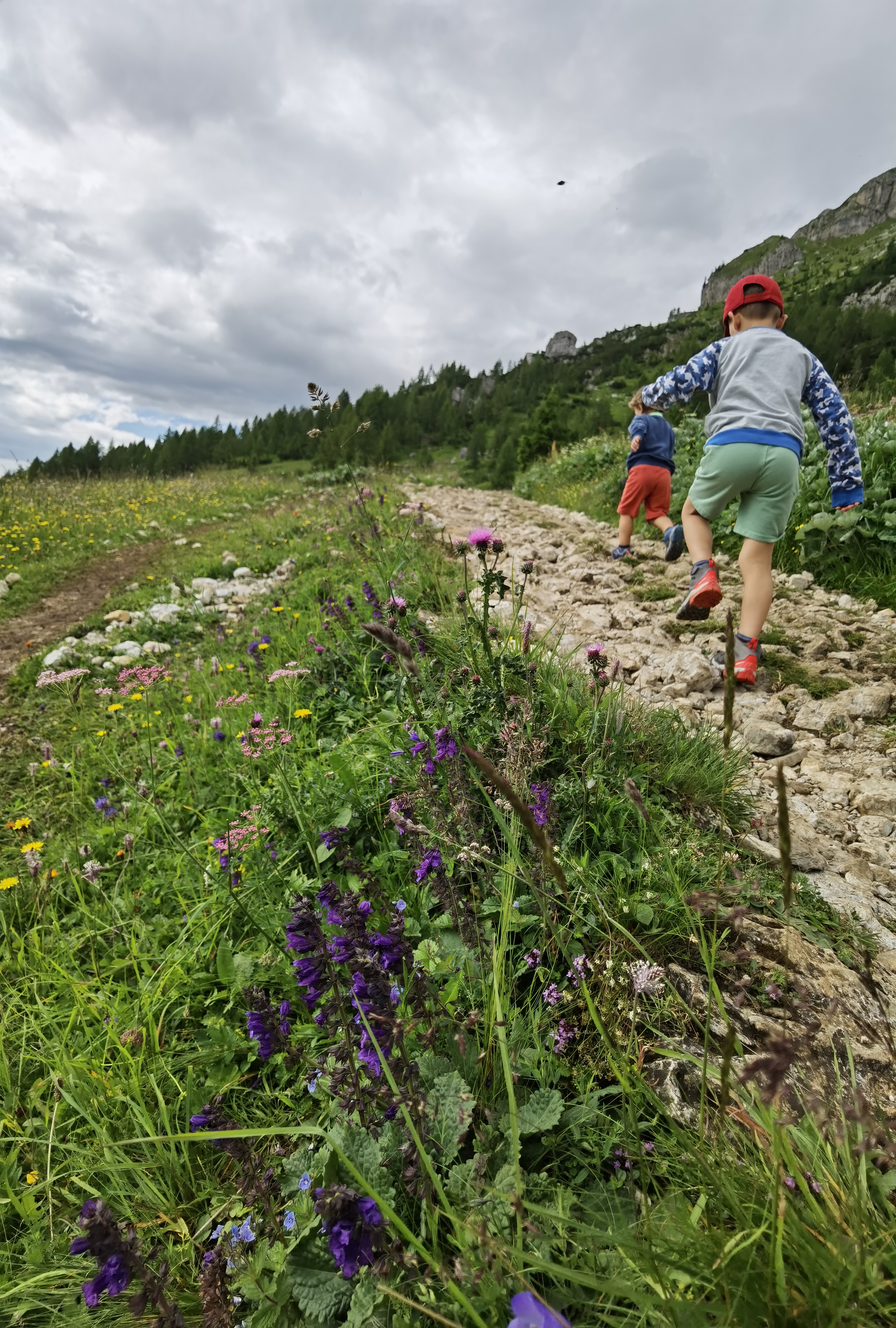 Camminando in discesa lungo la comoda mulattiera arriviamo a Malga Pioda (m.1816), in maniera un po’ casuale, dal momento che non ci sono cartelli che indicano la via da seguire. Fin qui si può arrivare anche in passeggino. Da qui imbocchiamo il sentiero n.556 che, ampio e in parte lastricato, sale in maniera costante portandosi in quota con ampi tornanti, anche se diverse scorciatoie consentono di tagliare le curve ma sconsigliato con bambini piccoli. Essenziale lo zaino portabimbo perché senza non si può proseguire.