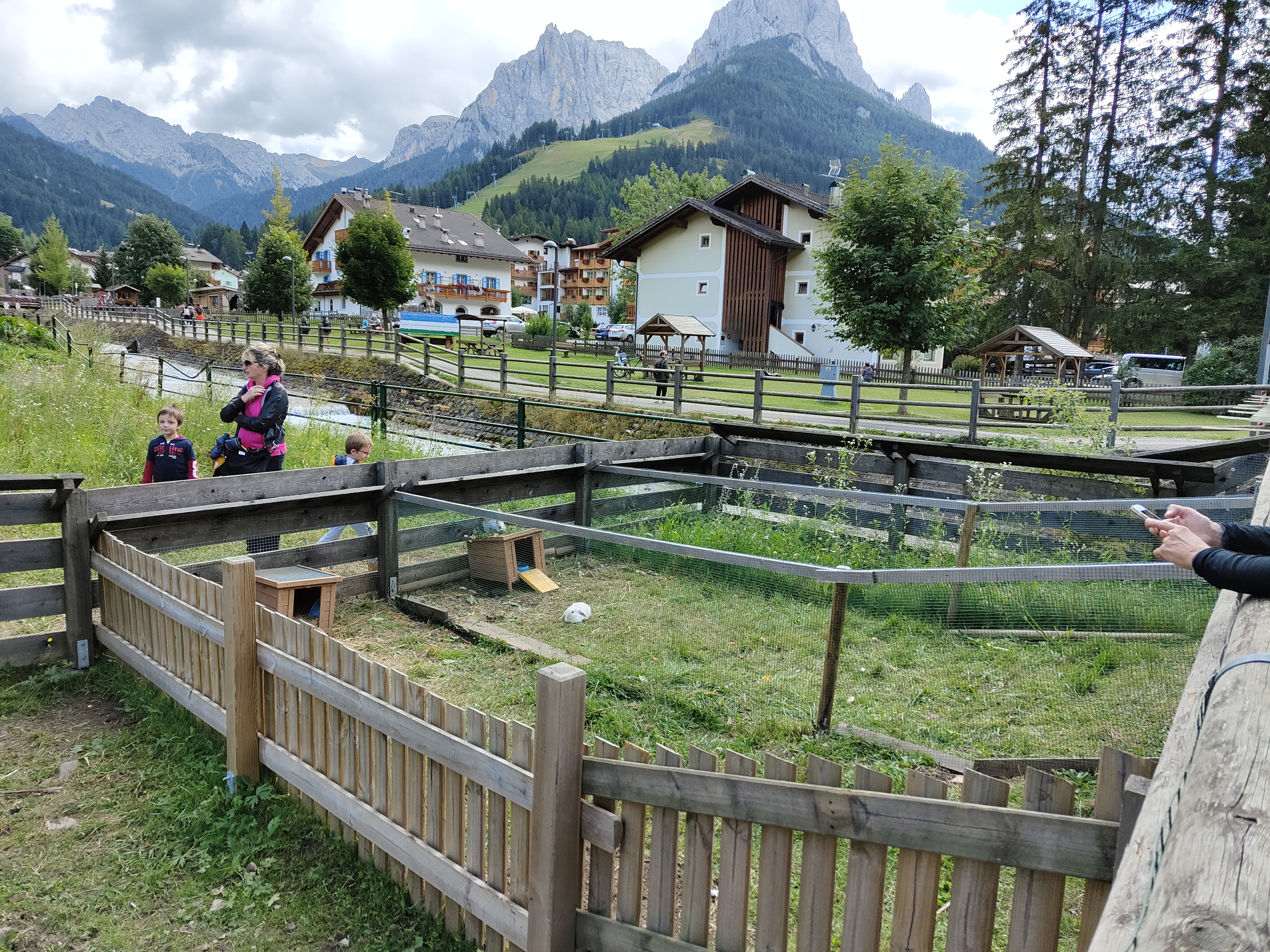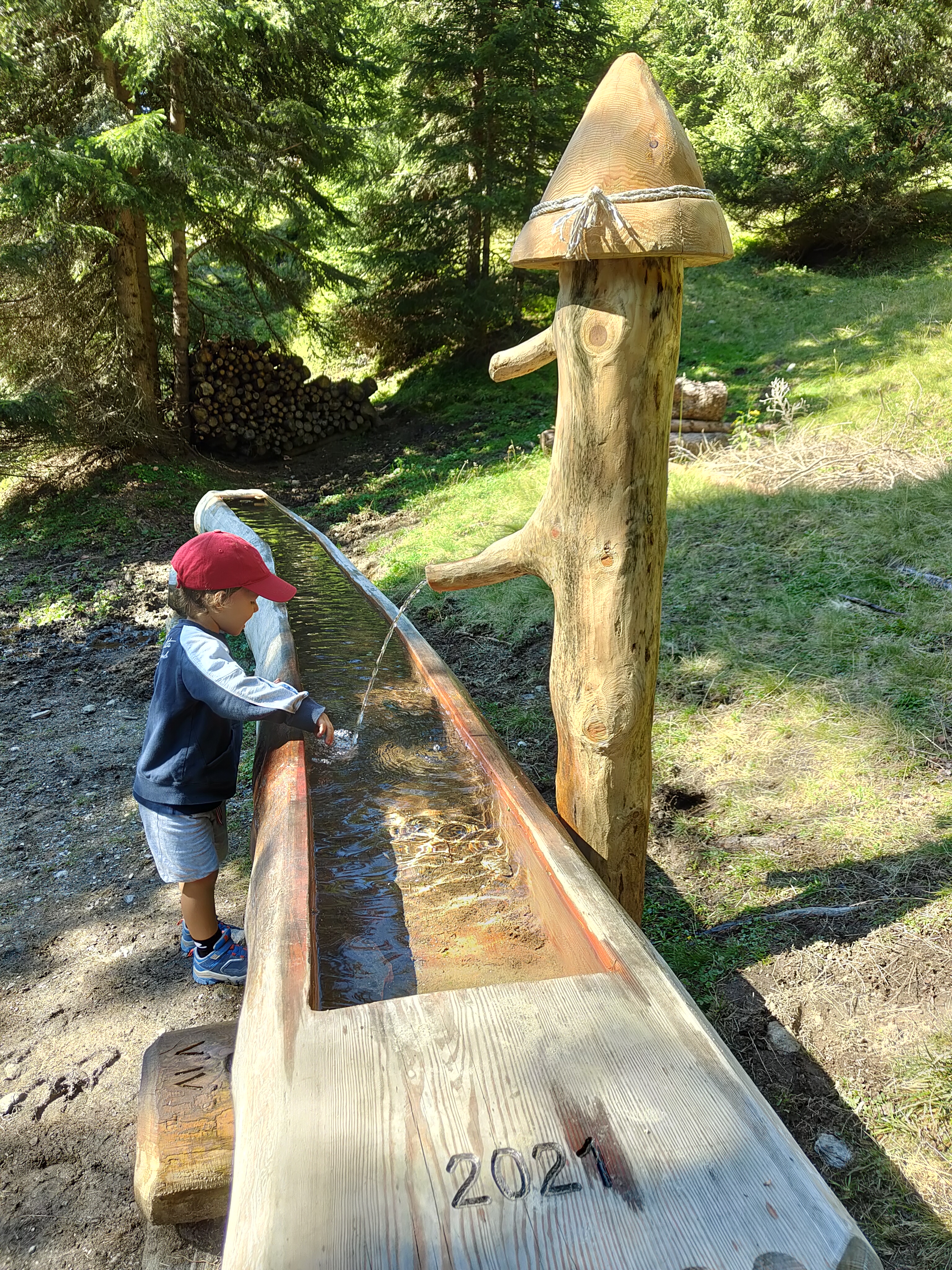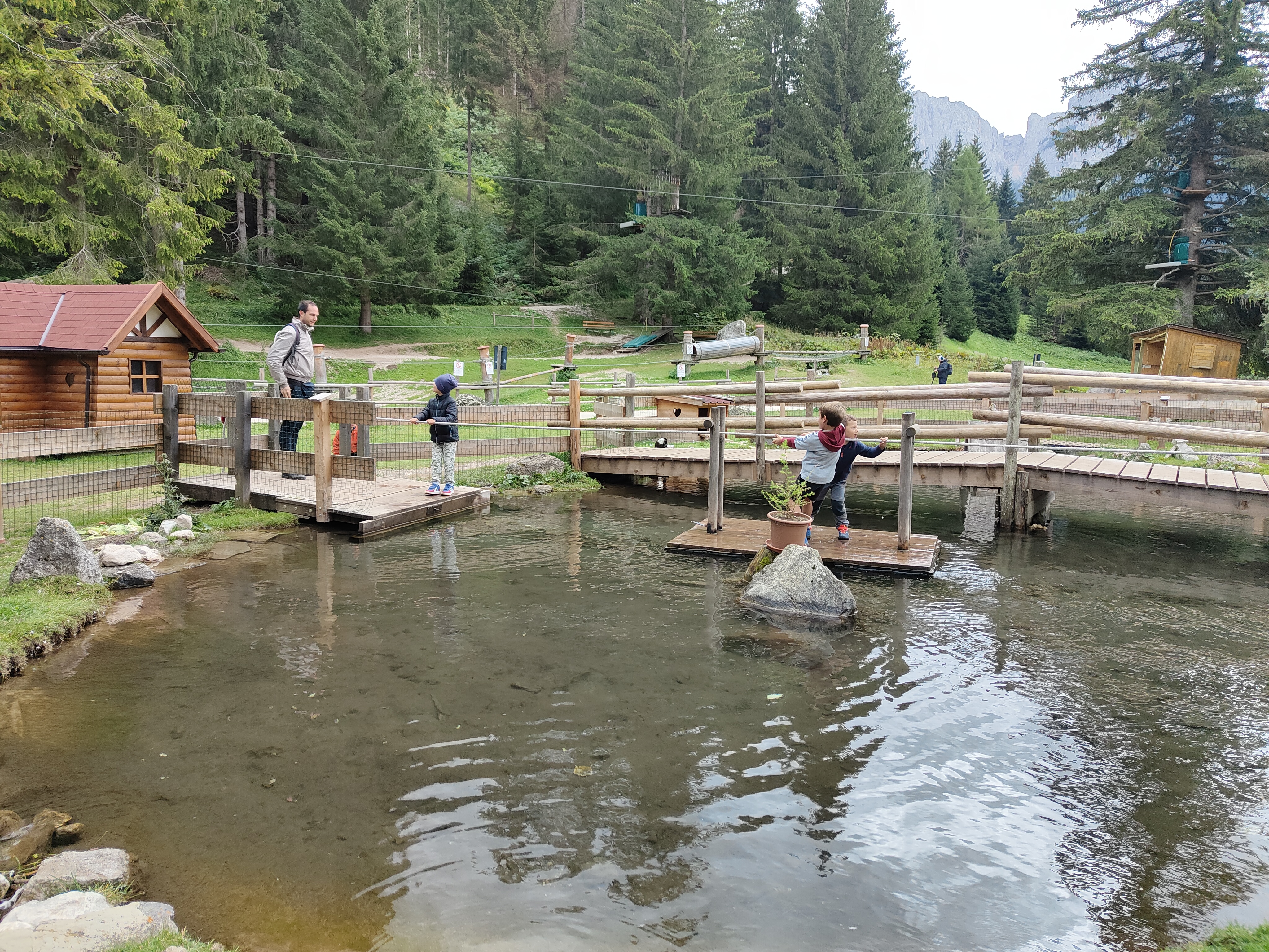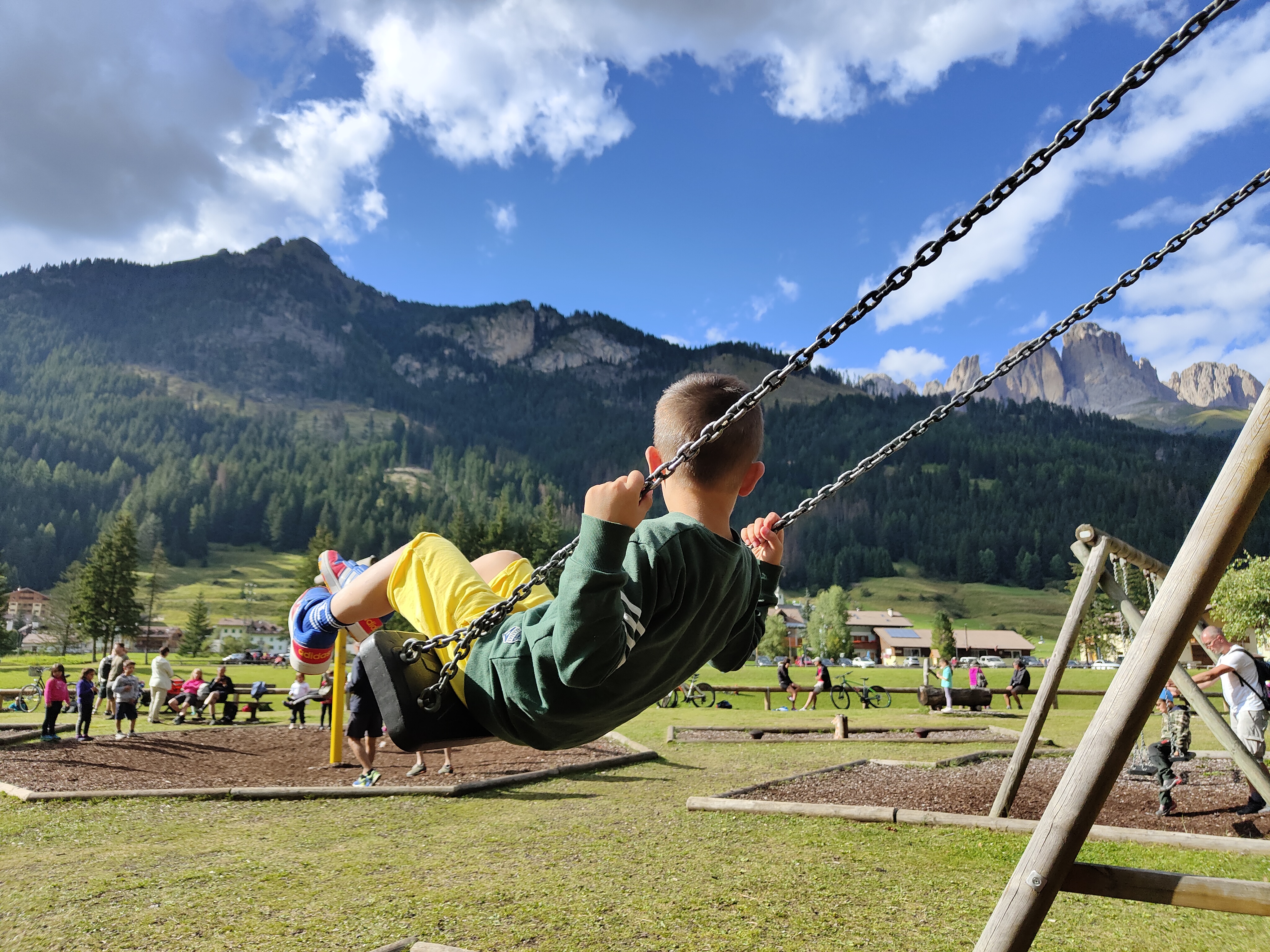 Prima tappa a Fontanazzo, vicino al nostro secondo hotel. Di fronte alla dolciaria fassana (famosa per i suoi dolci) i giochi si affacciano sul torrente e il panorama che si ammira dondolandosi dall’ altalena è fantastico. Tavoli per un pic-nic nascosti tra gli alberi invitano ad una sosta ed i bambini non possono che perdersi tra scivoli, carrucole, sabbiere e piramidi. O semplicemente possono divertirsi tirando sassi nel torrente che affianca il parco giochi.