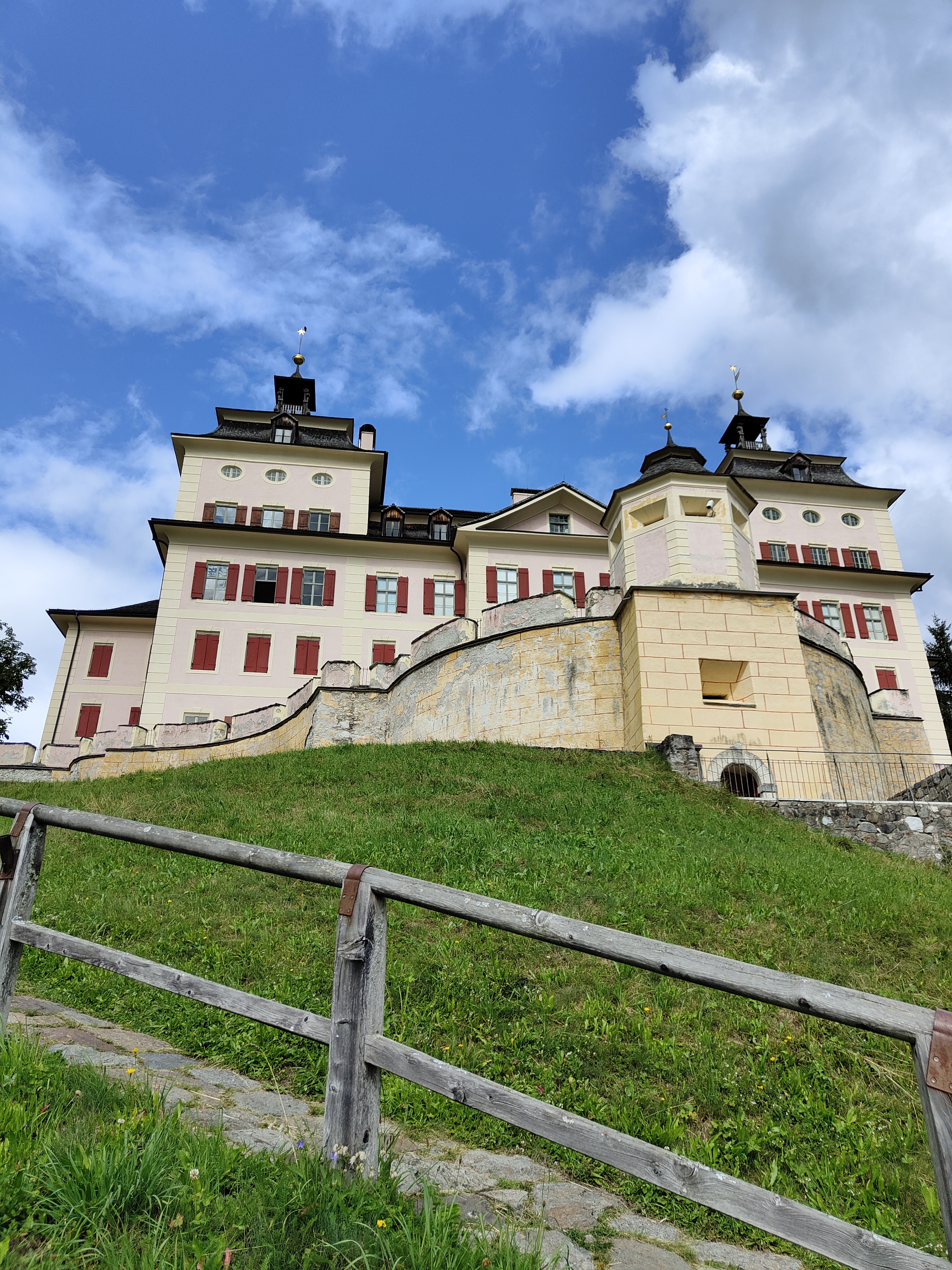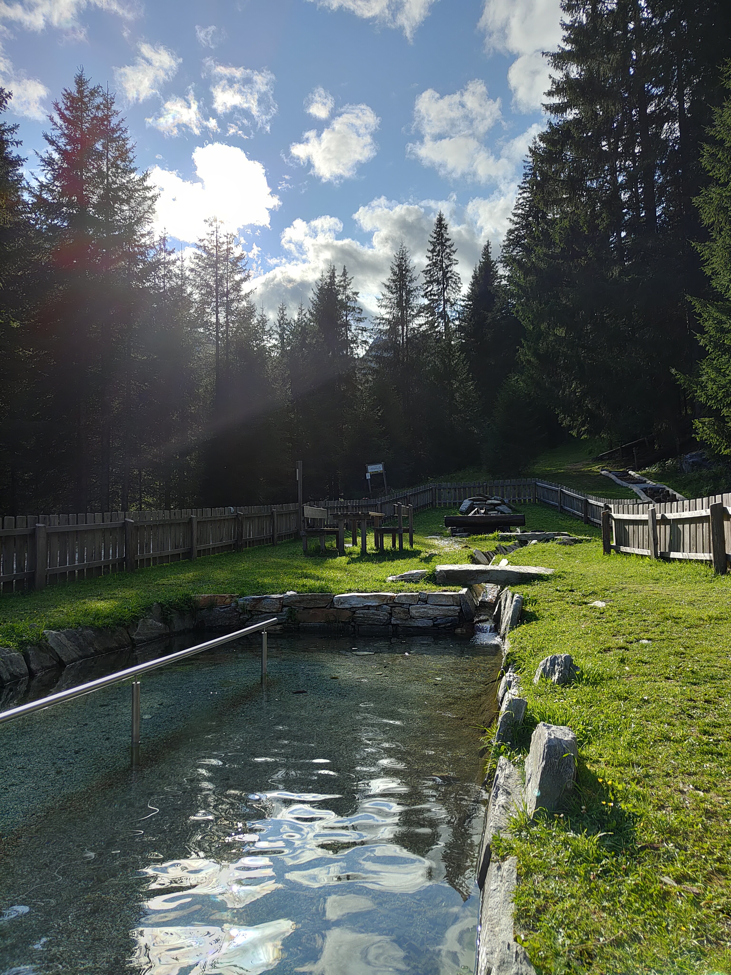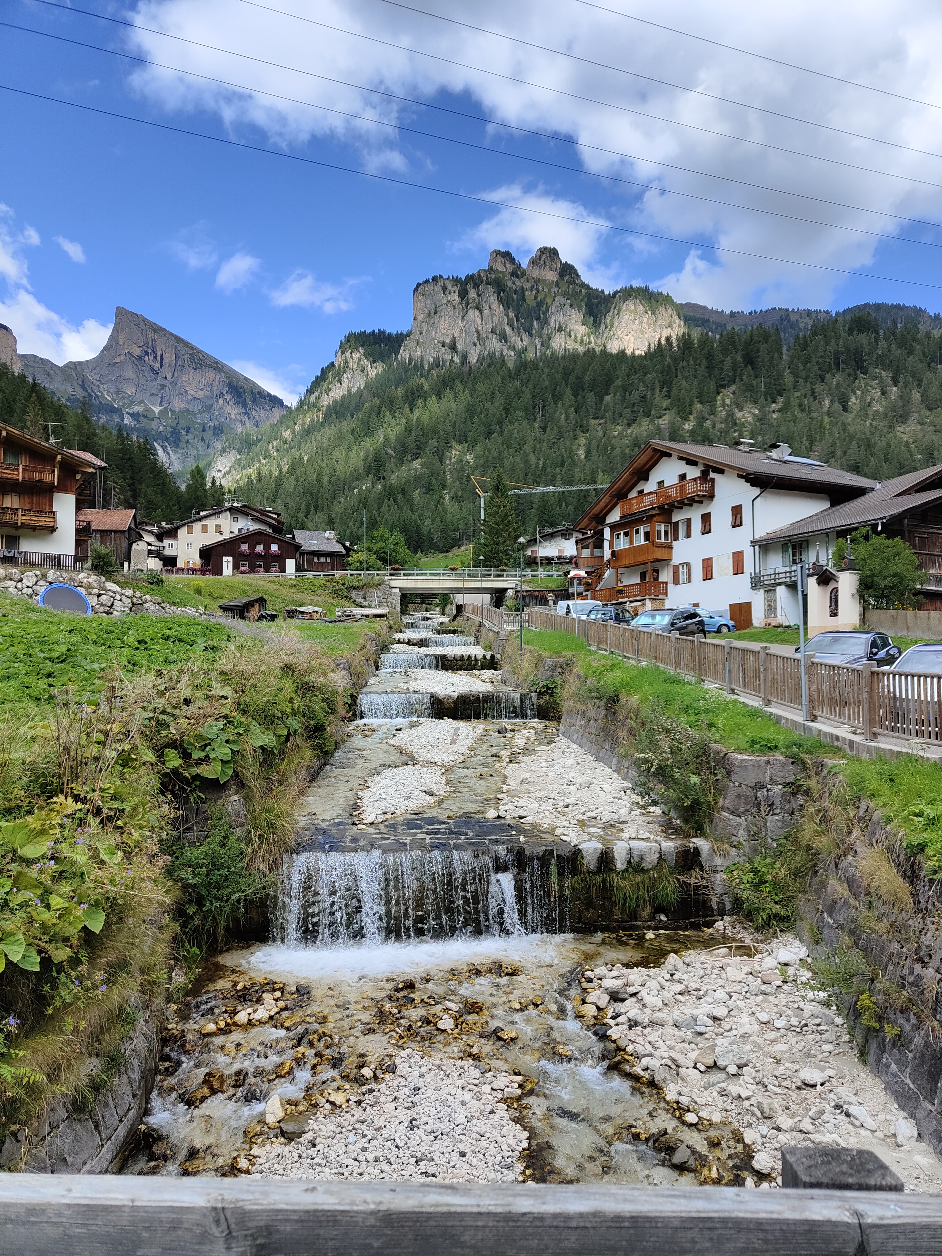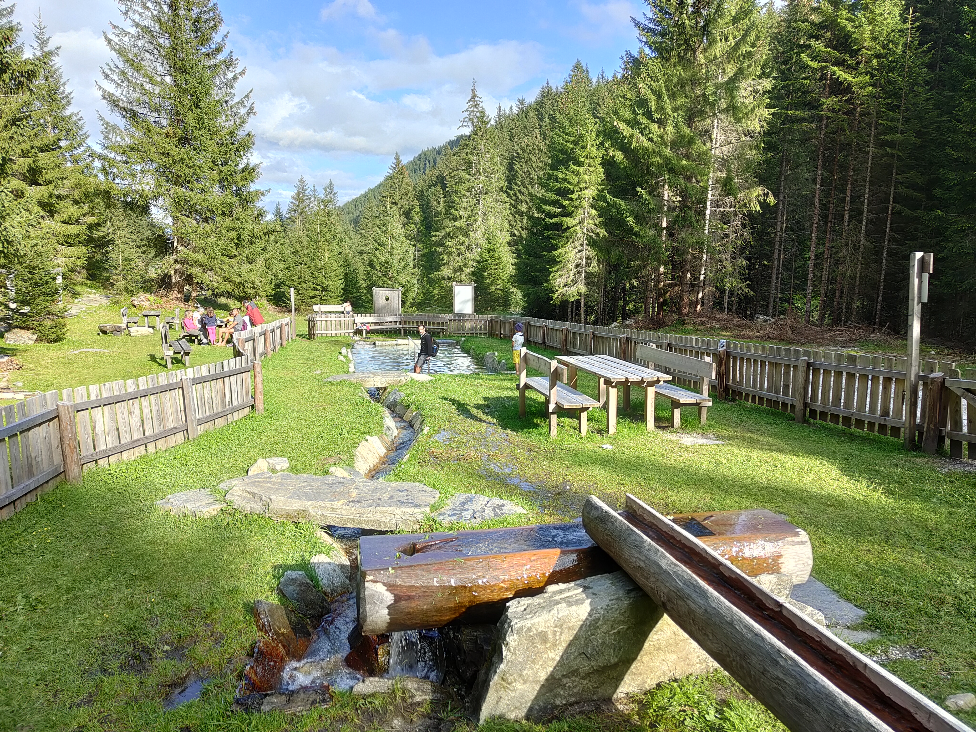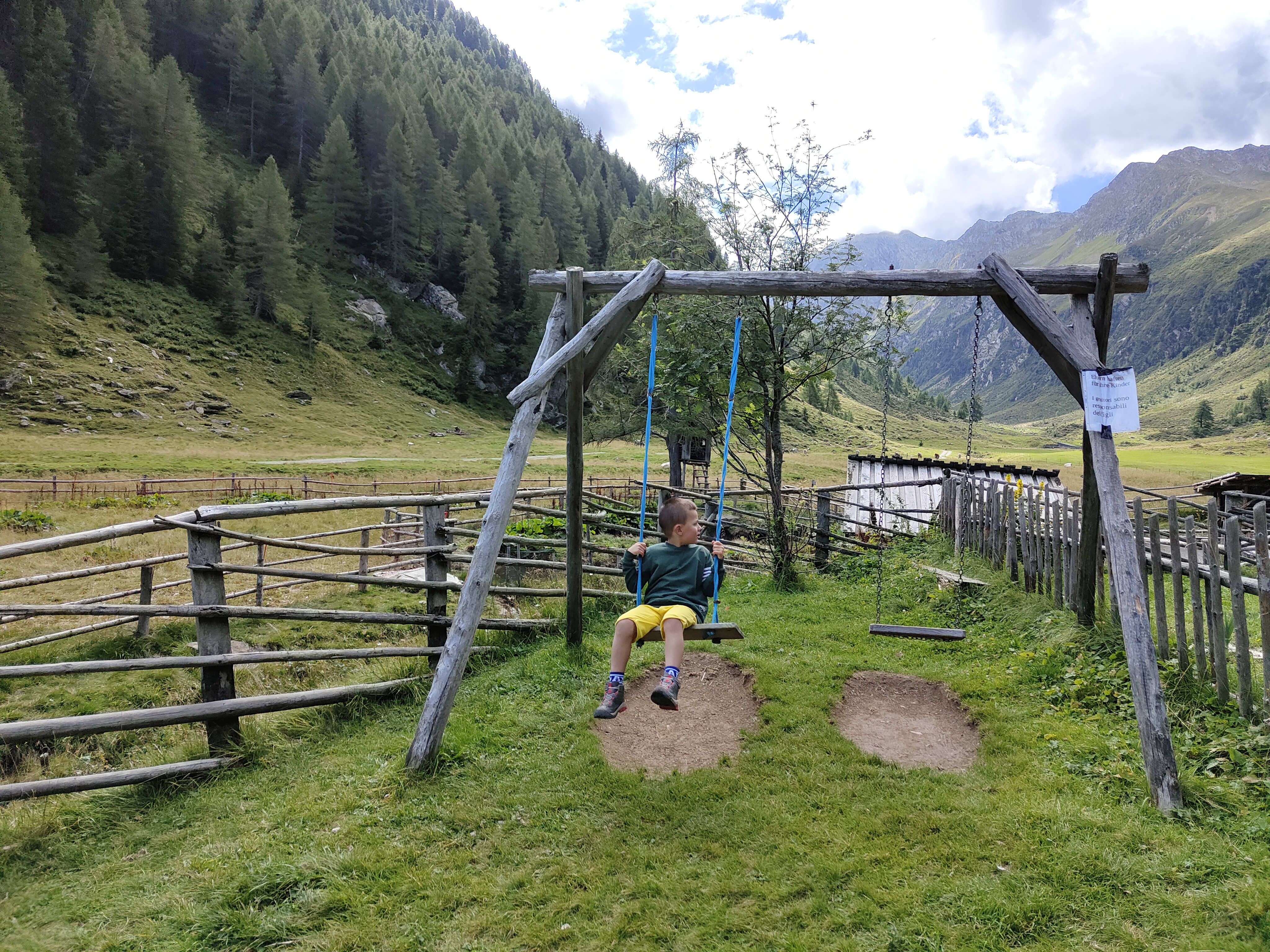 Prima tappa a Fontanazzo, vicino al nostro secondo hotel. Di fronte alla dolciaria fassana (famosa per i suoi dolci) i giochi si affacciano sul torrente e il panorama che si ammira dondolandosi dall’ altalena è fantastico. Tavoli per un pic-nic nascosti tra gli alberi invitano ad una sosta ed i bambini non possono che perdersi tra scivoli, carrucole, sabbiere e piramidi. O semplicemente possono divertirsi tirando sassi nel torrente che affianca il parco giochi.