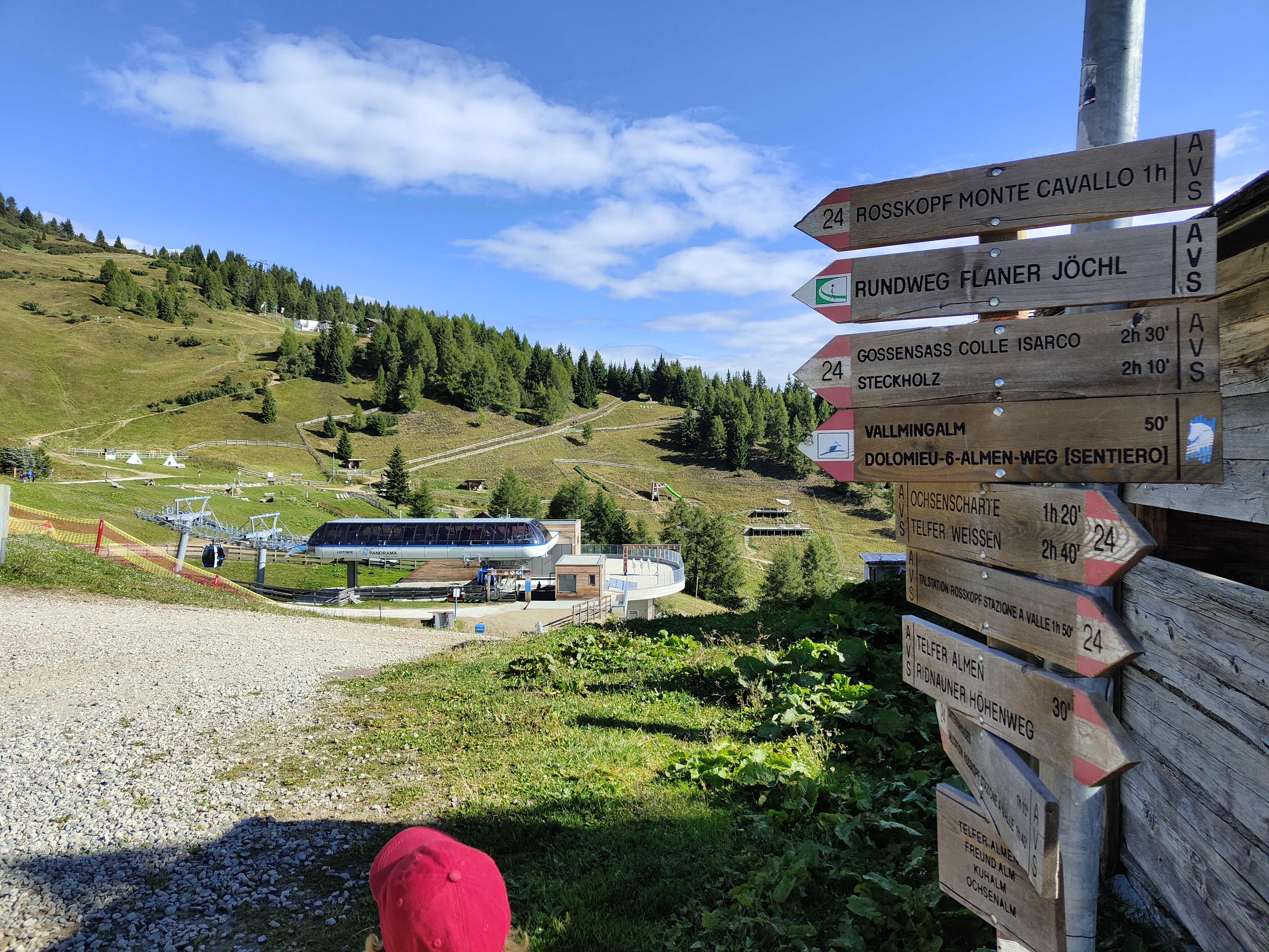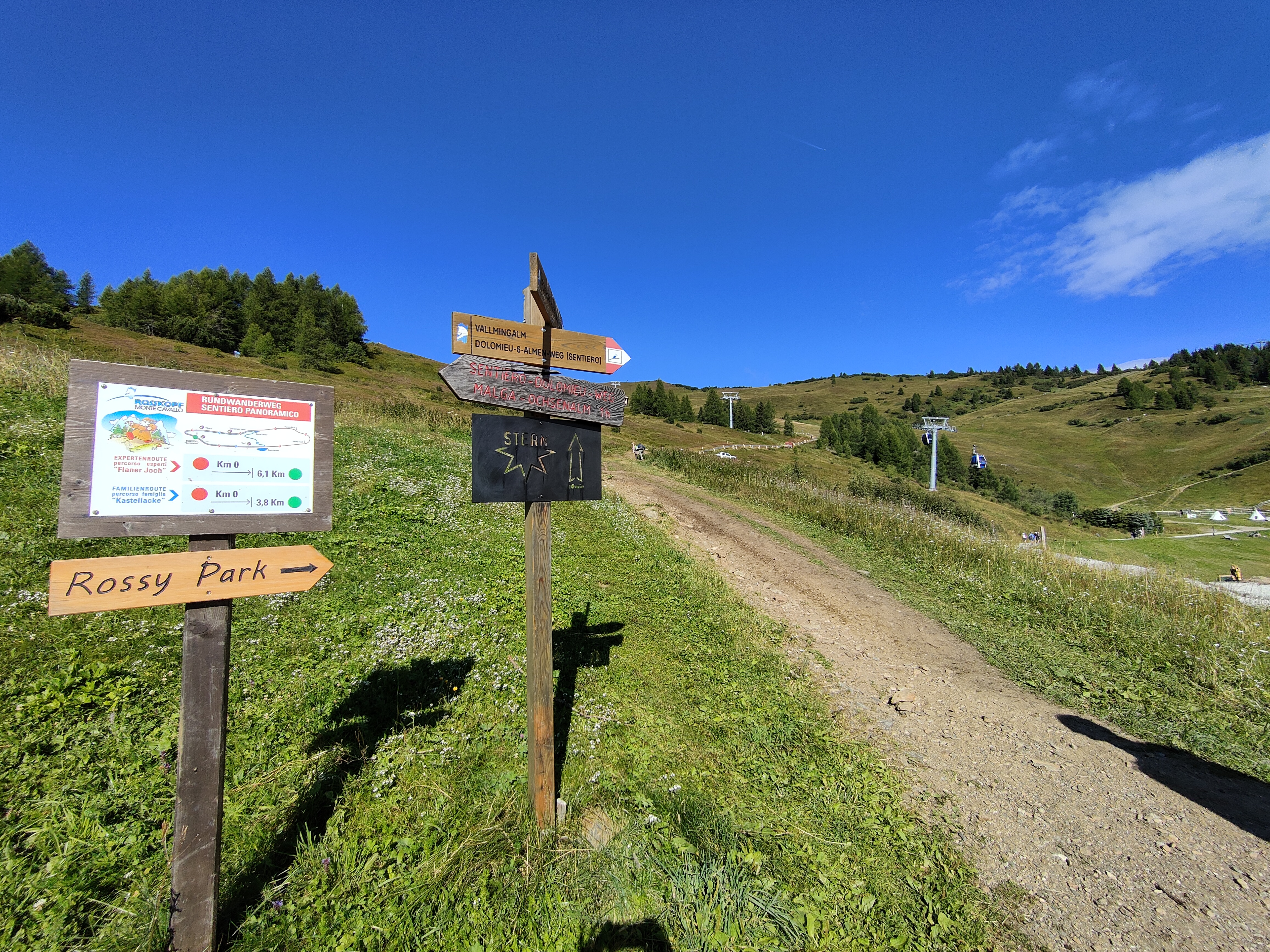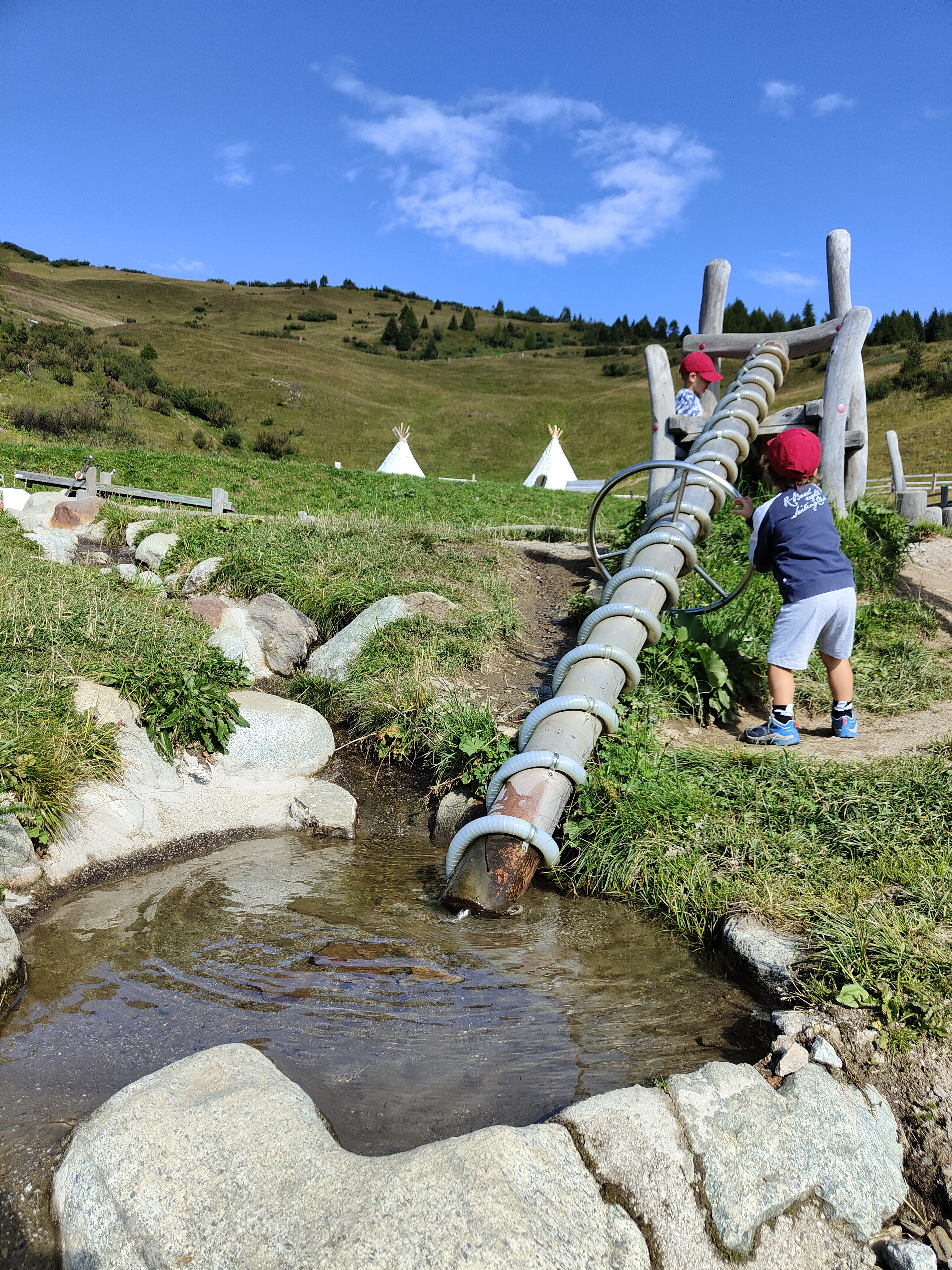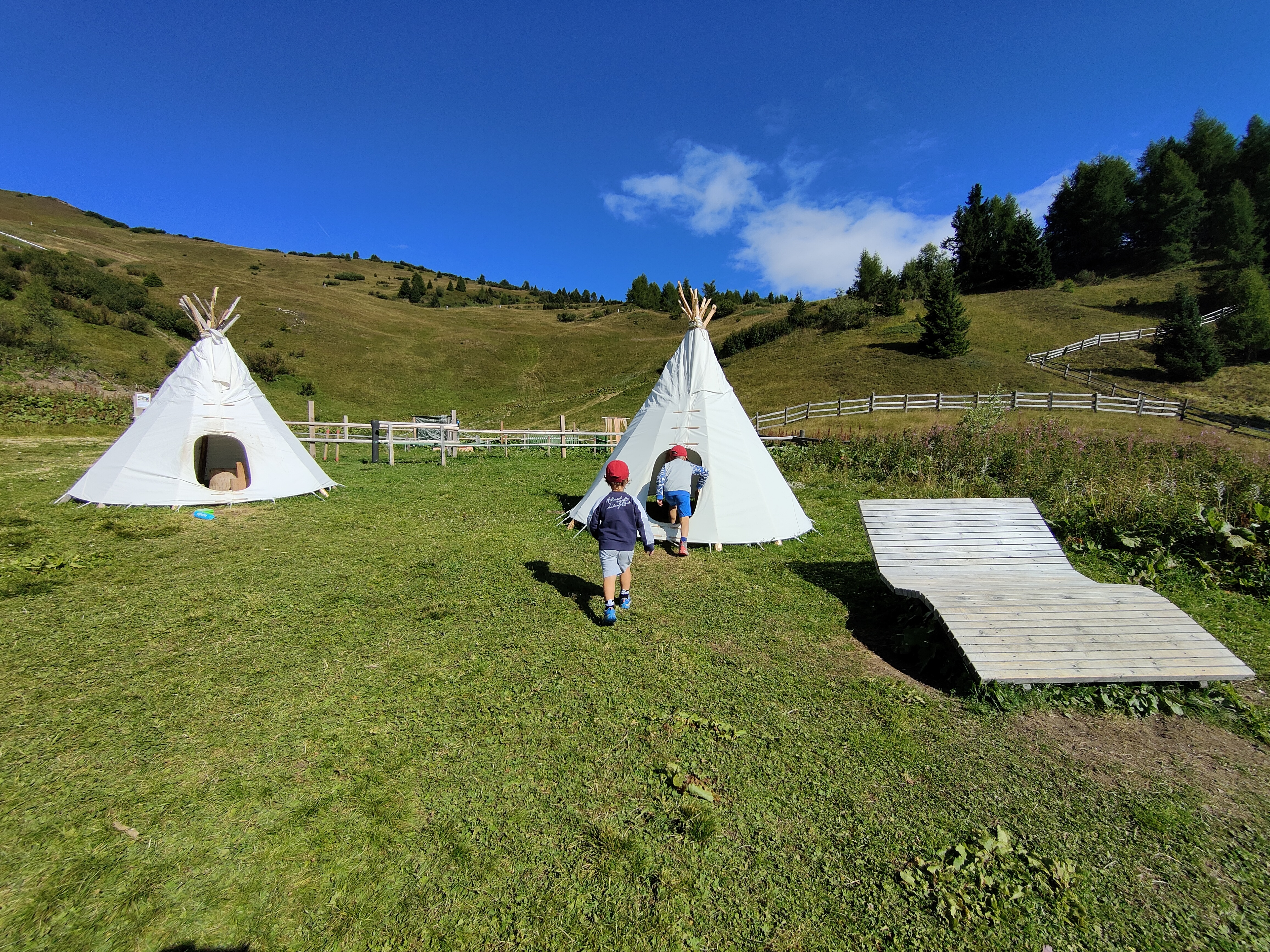 Scendiamo dalla cabinovia alla stazione a monte di Monte Cavallo i bambini già intravedono giochi d’acqua – ci sono un laghetto da attraversare in equilibrio sui tronchi, dighe, ponticelli, pozzi, il tunnel e altri intelligenti sistemi per giocare e sperimentare. Accanto e connessa c’è la buca della sabbia con la casetta, il secchio con la carrucola, il piccolo fiume. Siamo al Rossy Park, uno zoo con animali di montagna da accarezzare. Asini, capre e caproni, conigli di montagna e naturalmente i lama e gli alpaca. Insomma un’area gioco ricca e ben pensata, nei giorni più caldi (munitevi di cappellini e crema solare). Intorno all’area di gioco ci sono panchine, un paio di tavoli, amache e sdraio in legno che rendono questo luogo una perfetta meta per un pic nic. Qualche metro più avanti incontriamo lo zoo d’alta quota con caprette, lama e alpaca (fate attenzione alle ortiche che circondano i recinti).