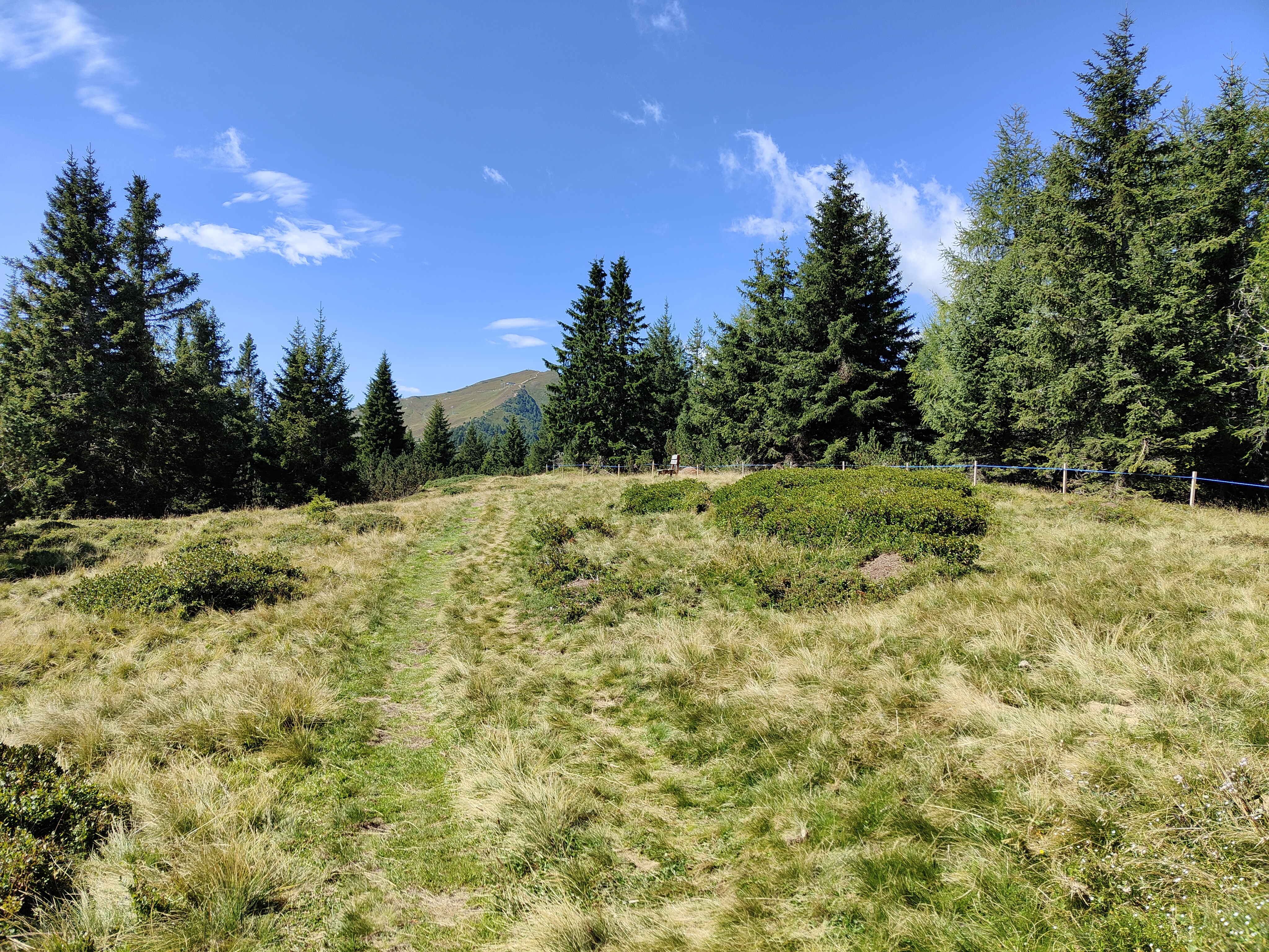 Fin qui abbiamo percorso una comoda strada sterrata, da qui in poi – mentre ci stiamo girando pian piano di nuovo in direzione degli impianti – percorriamo un sentiero che si snoda tra vegetazione e prati d’alta quota in un continuo saliscendi (ci vogliono gambe un pochino allenate).