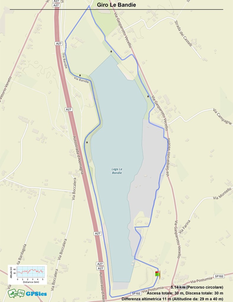 Superiamo l’entrata dell’impianto cavatore e poco più avanti prendiamo la stradina a lato di due case per guadagnare la riva del lago. Ora se preferite stare all’ombra proseguite per la stradina alta che corre sopra il lago (che sarà alla vostra destra). Fatta la prima curva e superato uno stabile, si apre una bella vista sul laghetto e le Prealpi trevigiane da Praderadego al Col Visentin. Restando “in quota” alla vostra sinistra al di là della siepe c’è l’autostrada Venezia-Belluno.