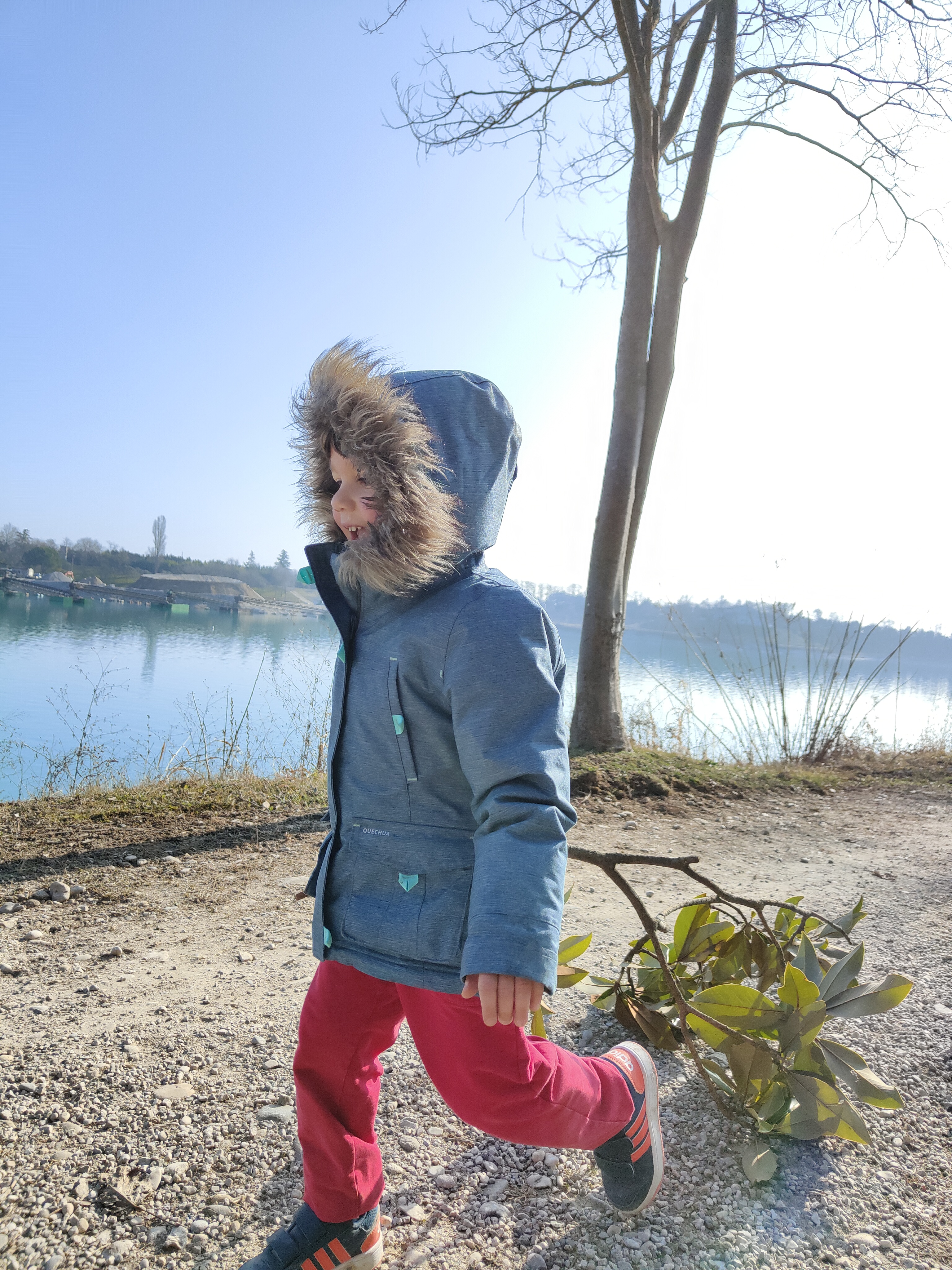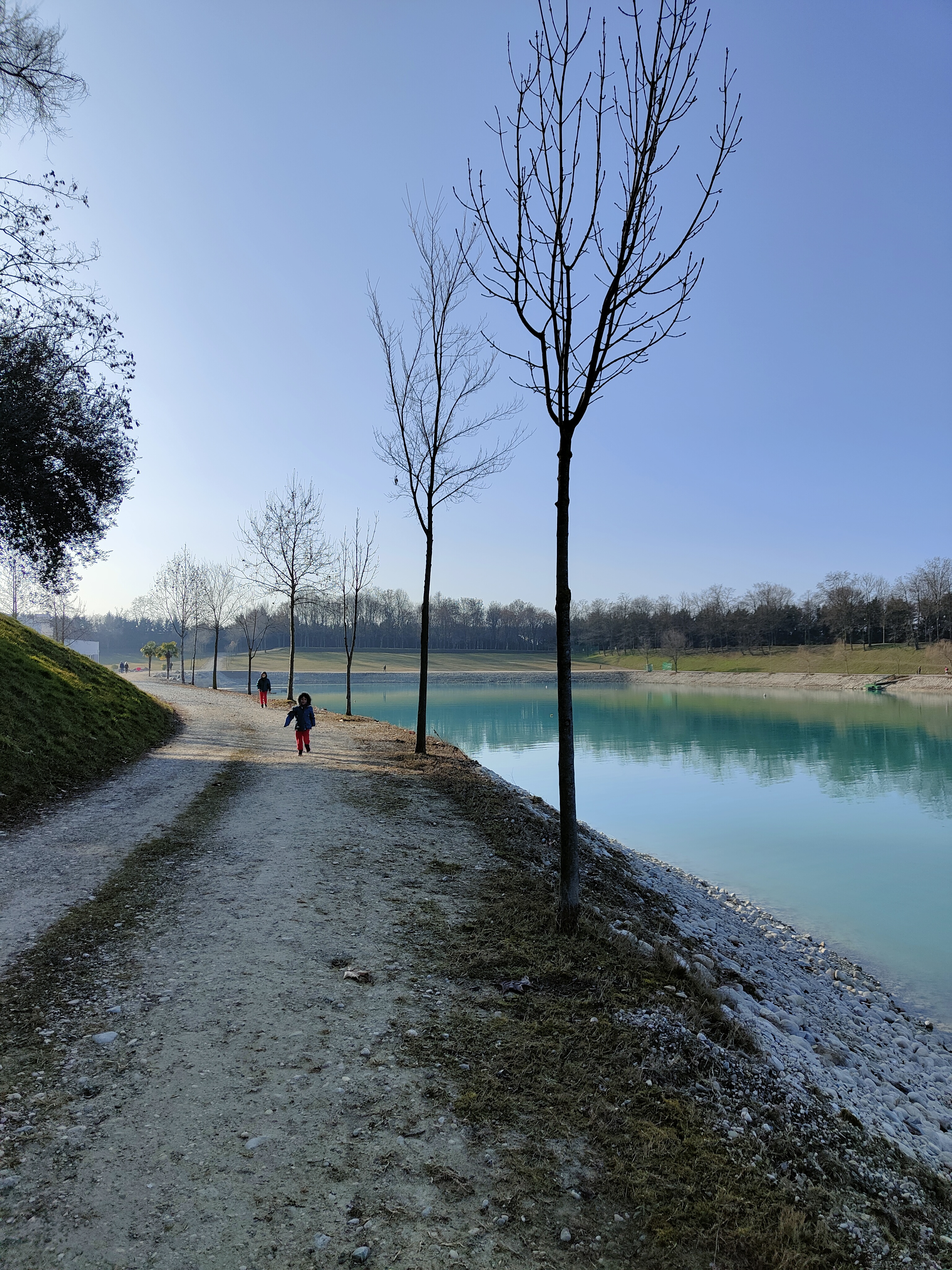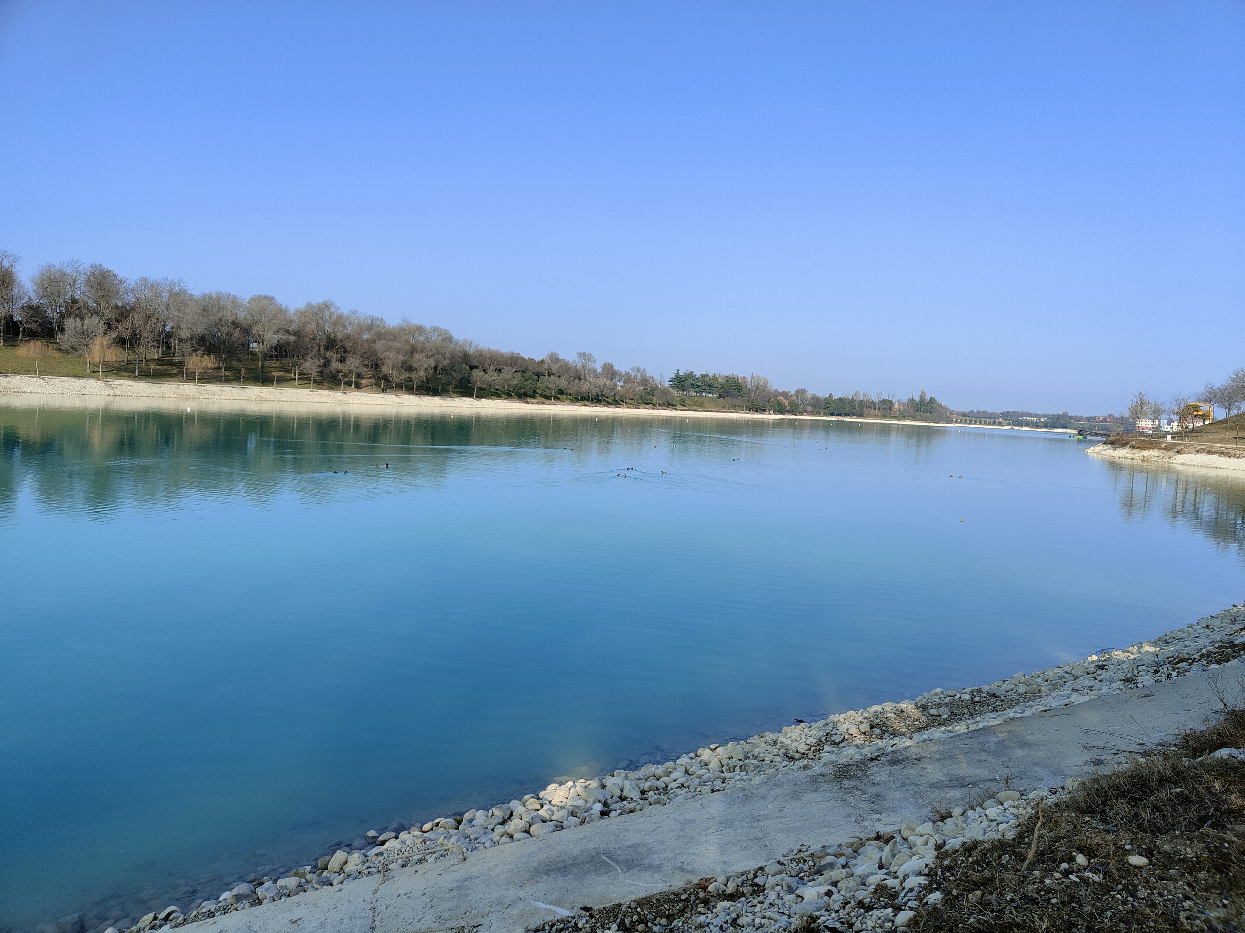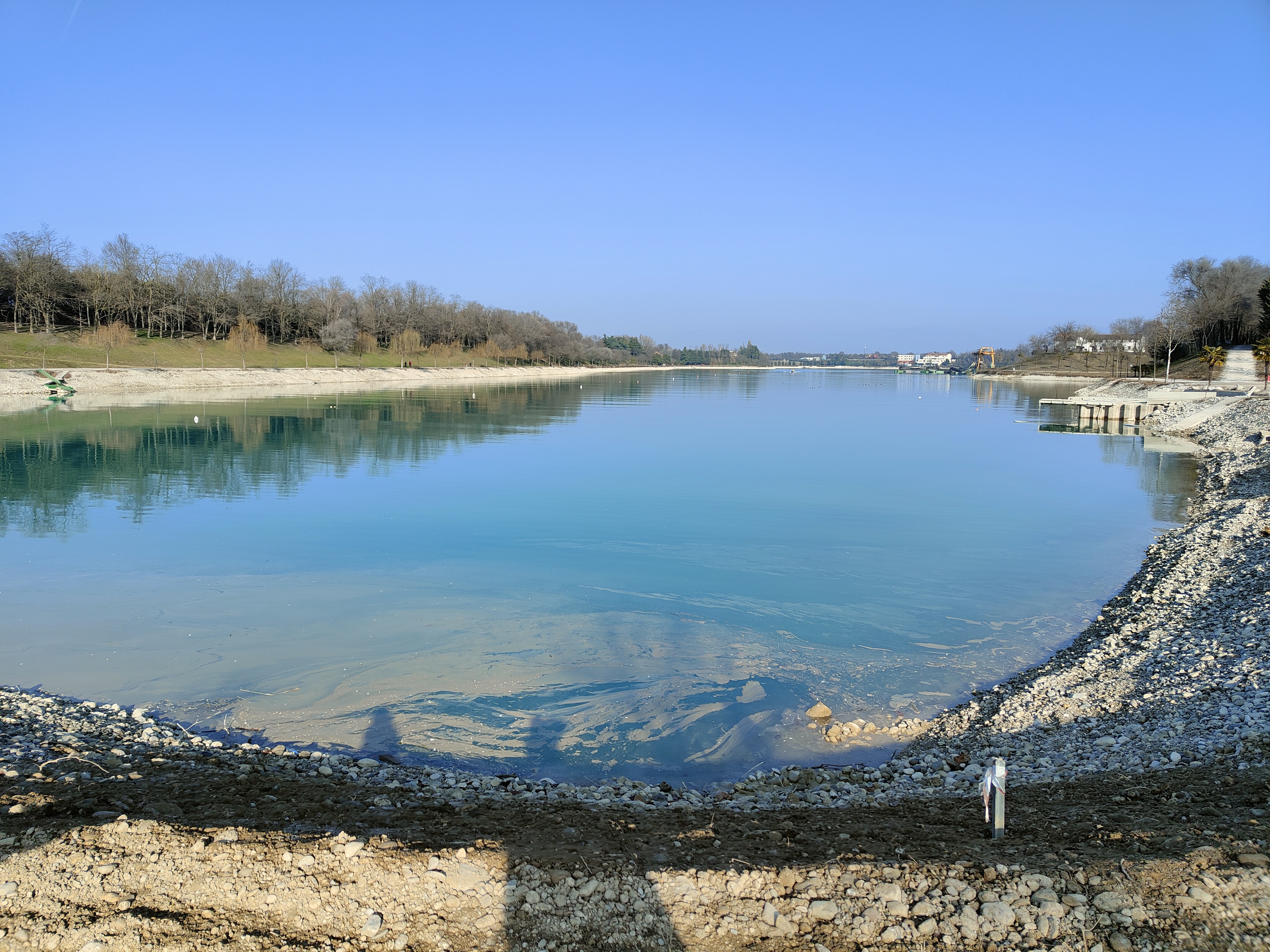 Noi preferiamo rimanere al sole e continuiamo a passeggiare lunga la riva del lago, la superficie dell’acqua è limpida e sulla sponda opposta vediamo nuovamente gli impianti di estrazione della ghiaia.
