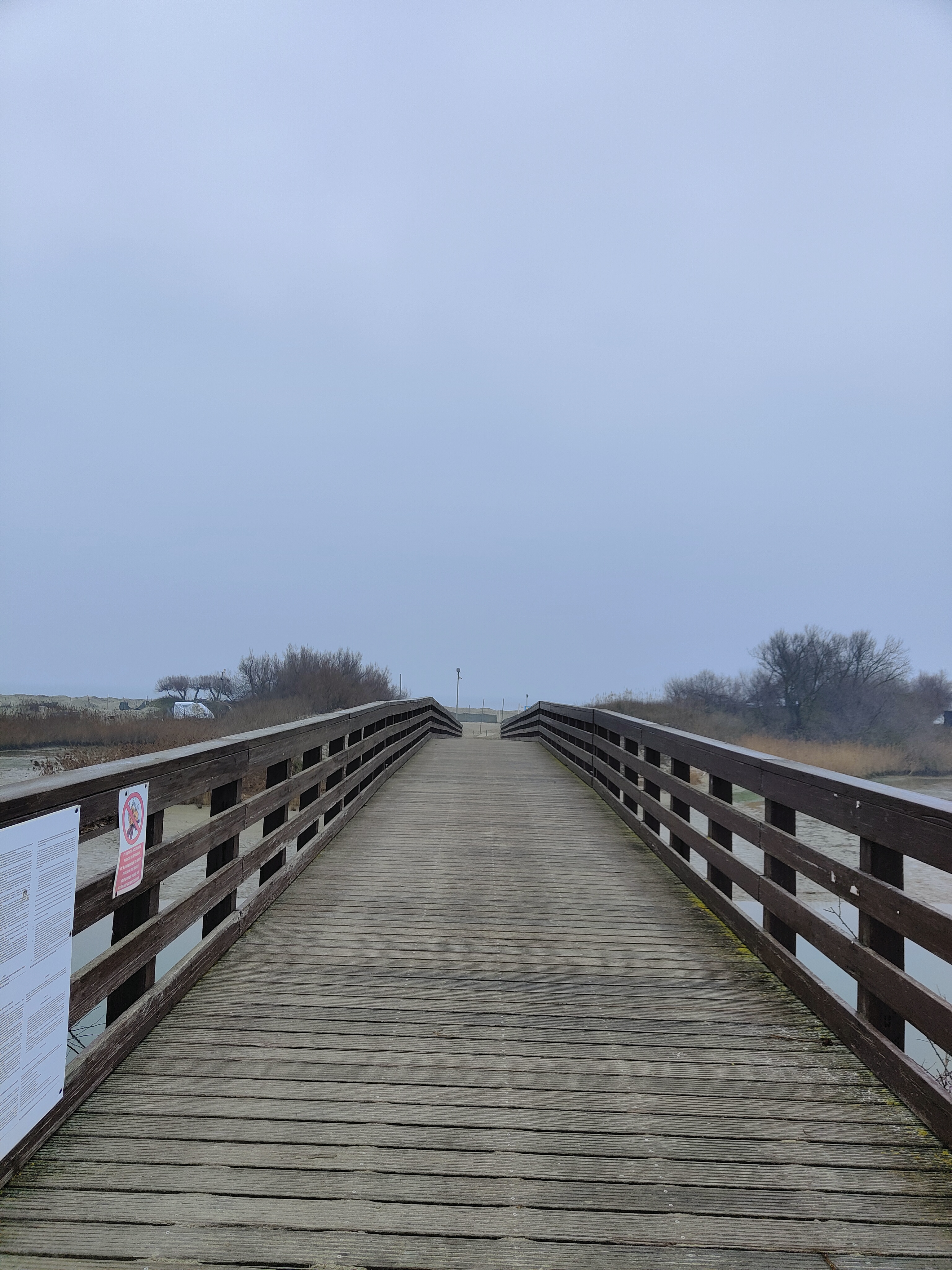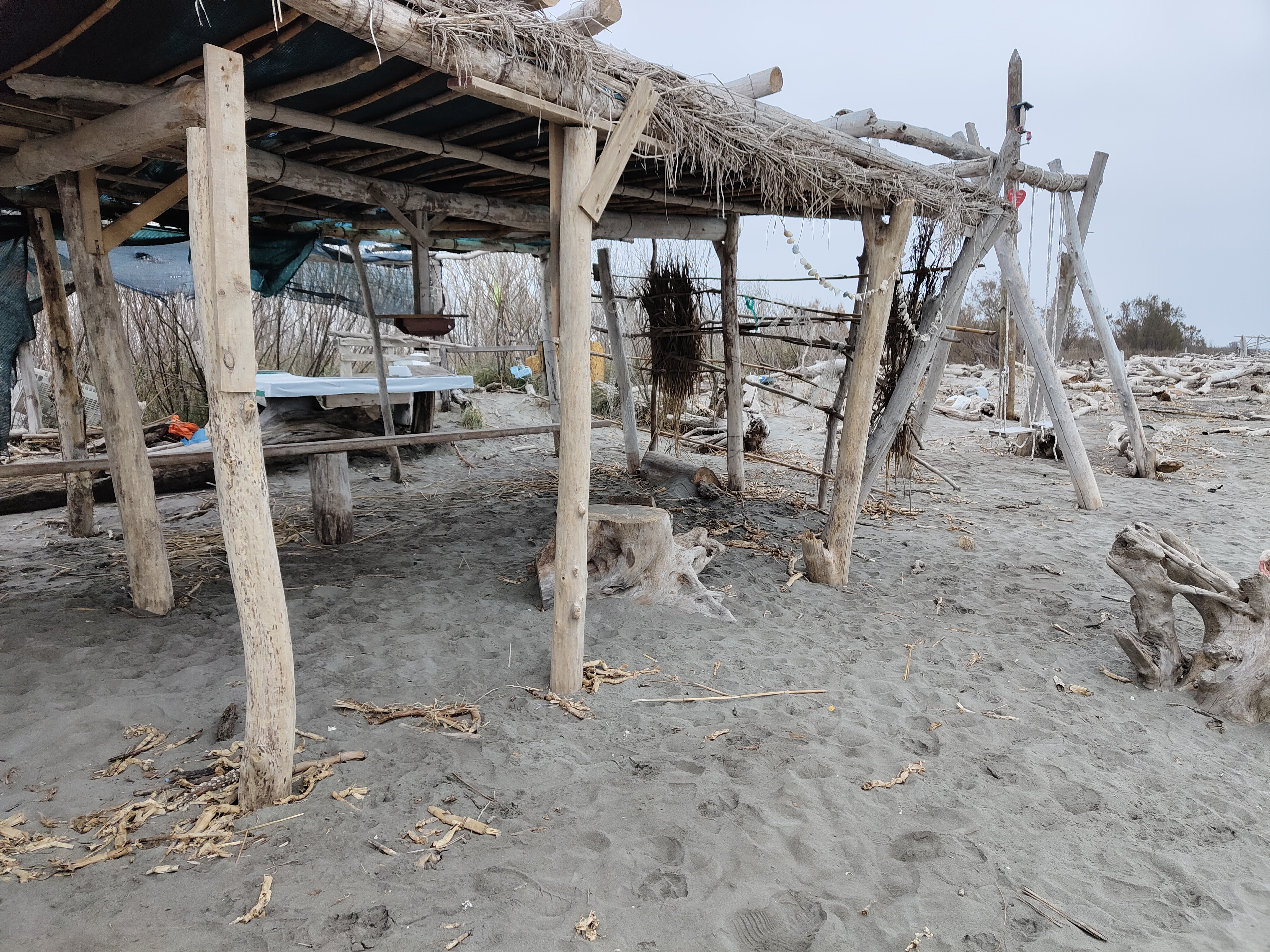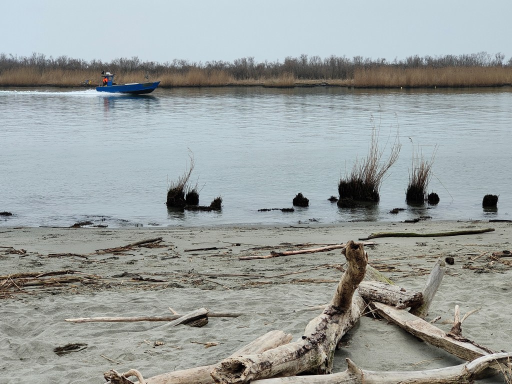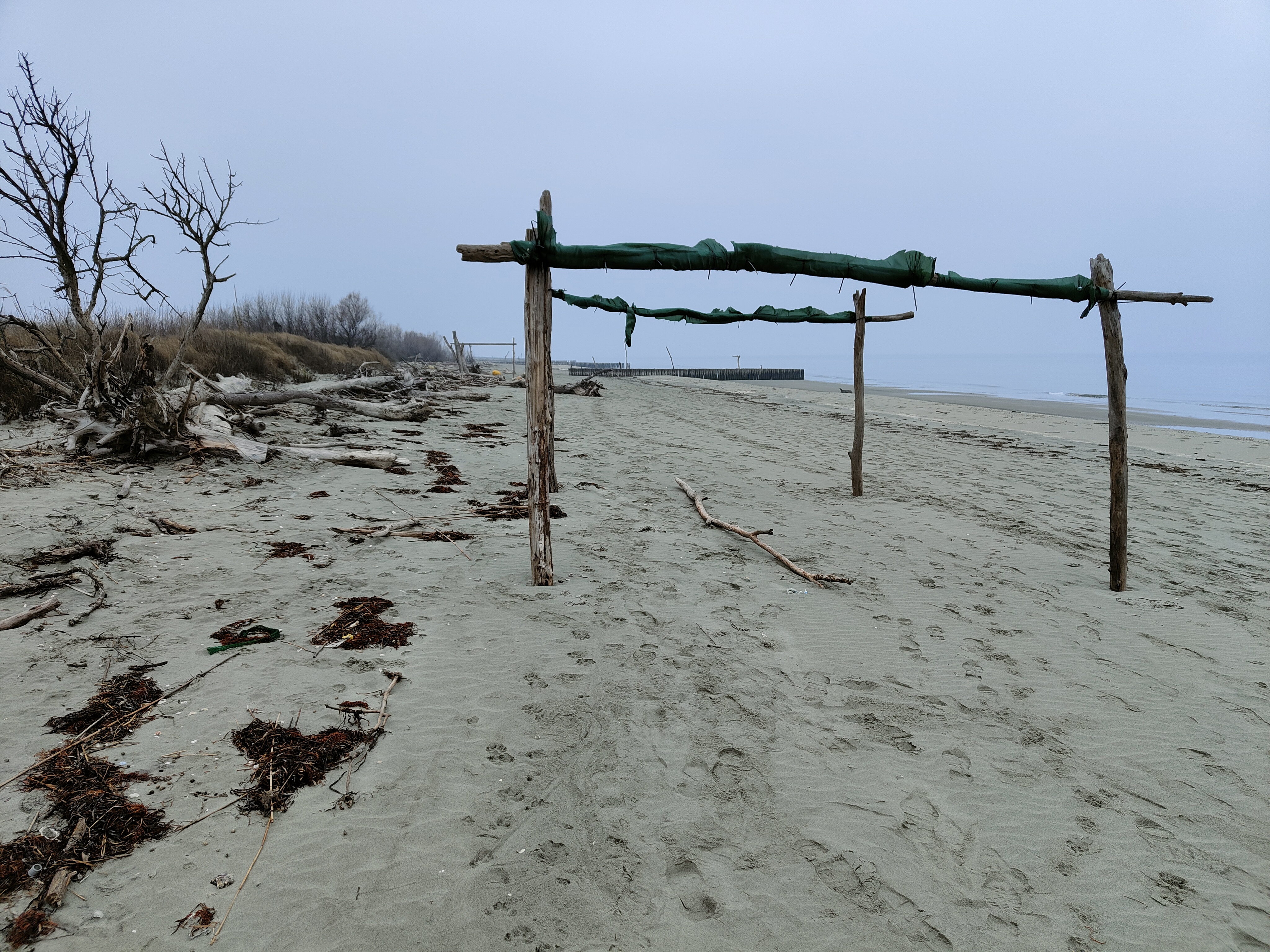 La spiaggia si trova a Porto Tolle, all’interno del Parco Regionale Veneto del Delta del Pò. Abbiamo lasciato alle spalle la strada statale Romea, altri 15 km nella campagna bonificata fino ad un parcheggio gratuito d’inverno. Attraversiamo un suggestivo ponte di legno pedonale e raggiungiamo in spiaggia.