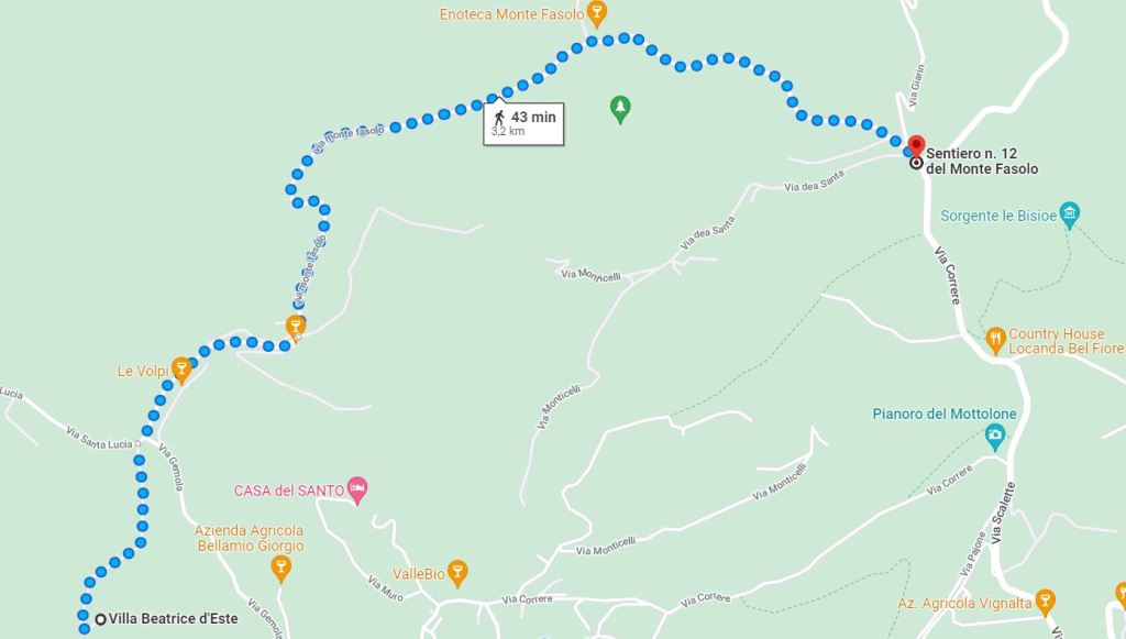 Ti consigliamo, come abbiamo fatto noi, di fare una piccola deviazione per andare a Villa Beatrice d’Este. Ti basterà proseguire dritto lungo via Monte Fasolo, oltrepassare l’agriturismo Le Volpi e imboccare la ripida salita che in breve ti porterà nei pressi del monumentale ingresso della villa. C’è un ampio parcheggio a disposizione.