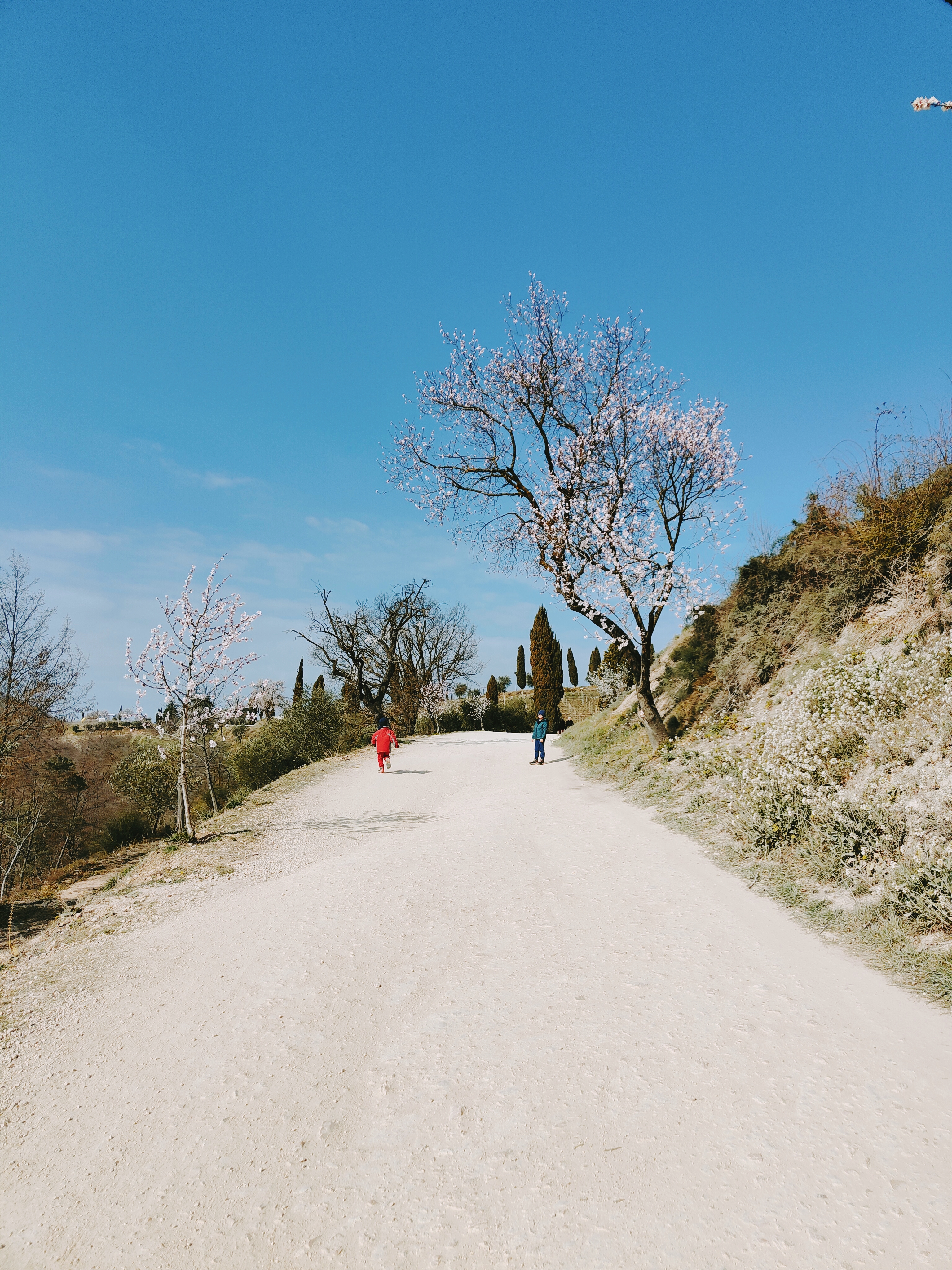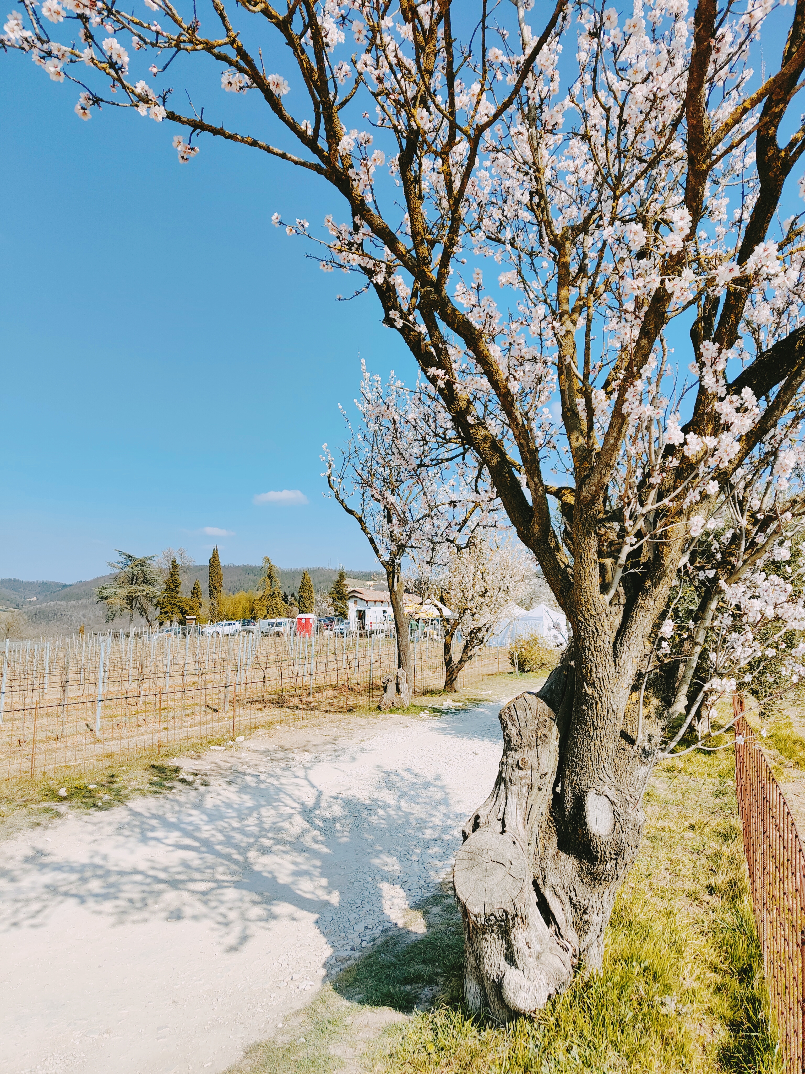 Durante il percorso inoltre si perdono a vista d’occhio splendidi vigneti, ulivi e cipressi e… l’incredibile fioritura dei mandorli in fiore!