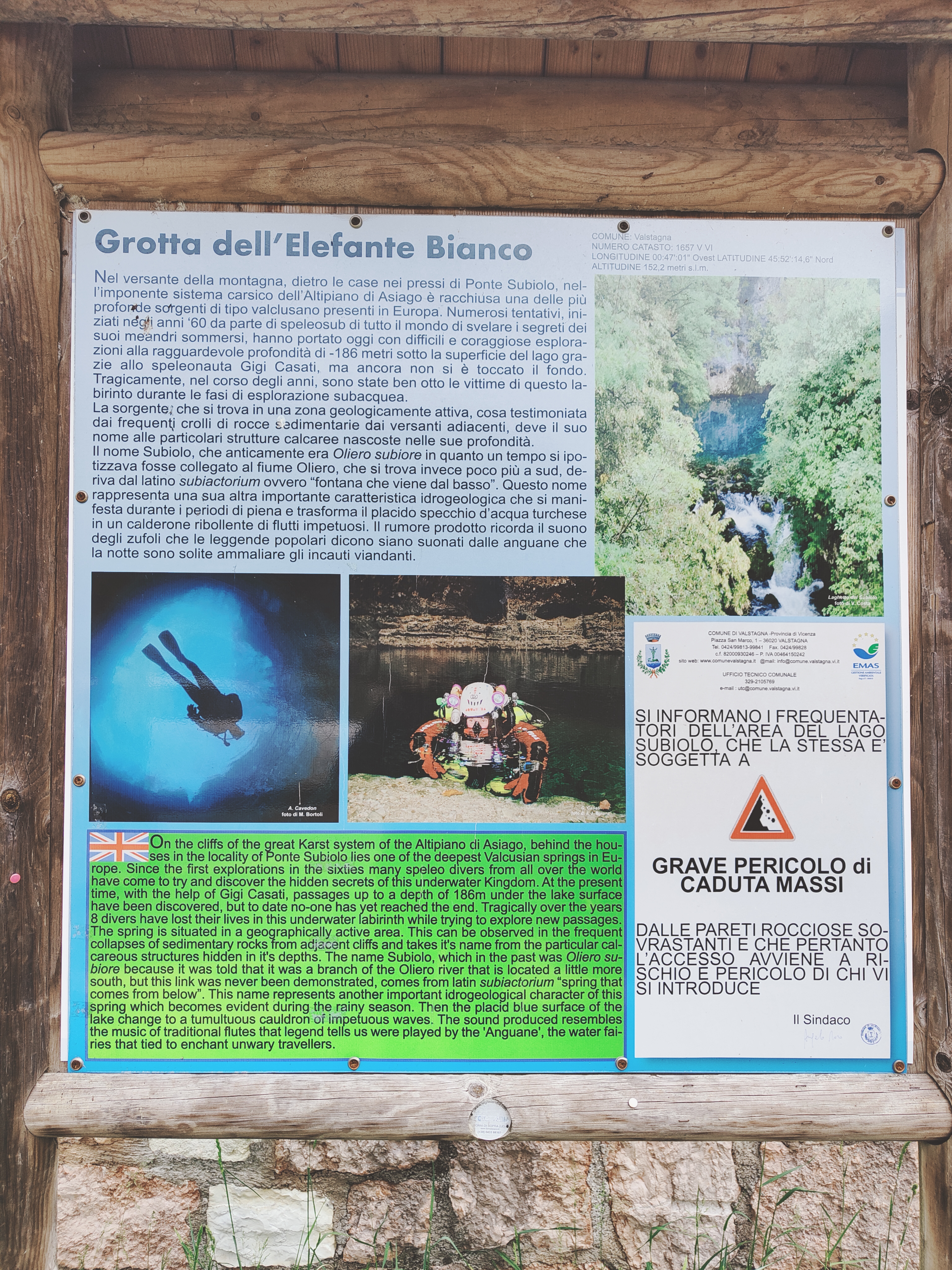 Il posto è meraviglioso, incastonato nella dolomia si trova un lago largo una ventina di metri per 35, dal color smeraldo, gioia assoluta per gli occhi. E’ il punto di partenza dell’immersione. Lo specchio d’acqua è profondo circa 20 mt e può rappresentare già un valido posto di immersione per i neofiti data la limpidezza dell’acqua, ovviamente scegliendo il periodo idoneo, lontano da precipitazioni e piene del Brenta che è collegato direttamente al laghetto. Arrivati sul fondo inizia la galleria. Lo spazio di ingresso è ampio, senza particolari ostacoli, circa dieci metri di larghezza per tre metri in altezza. La grotta, nella prima parte, ha un andamento regolare, con una inclinazione verso il basso. Il fondo è coperto di enormi massi che ci accompagnano fino alla profondità di 40 mt. La grotta ha un filo di Arianna che agevola l’orientamento.
