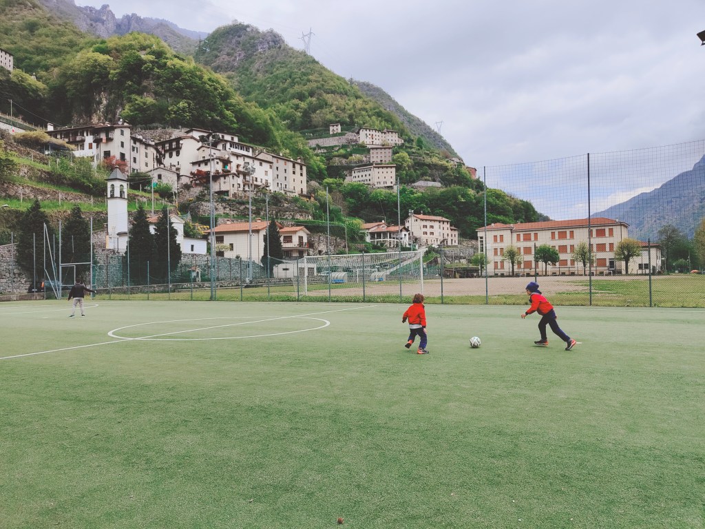 Non ci sono tuttavia barriere che dividono le due aree e i bambini possono scegliere liberamente dove andare a giocare. I più grandicelli potranno anche approfittarne per fare una partita a pallone al fresco, nel vicino campo da calcio in erba con entrata libera e con vista sulle montagne e sul Brenta.