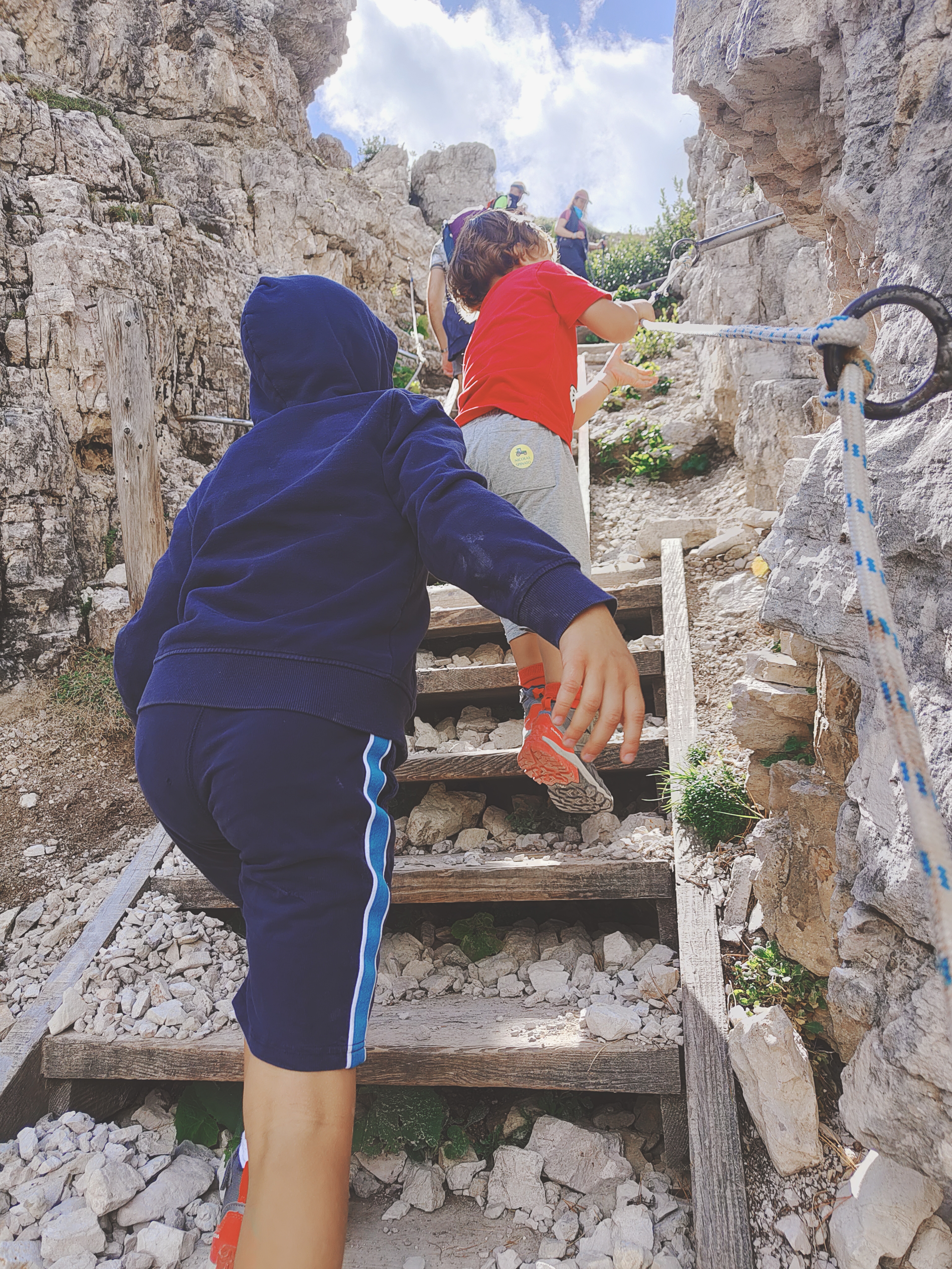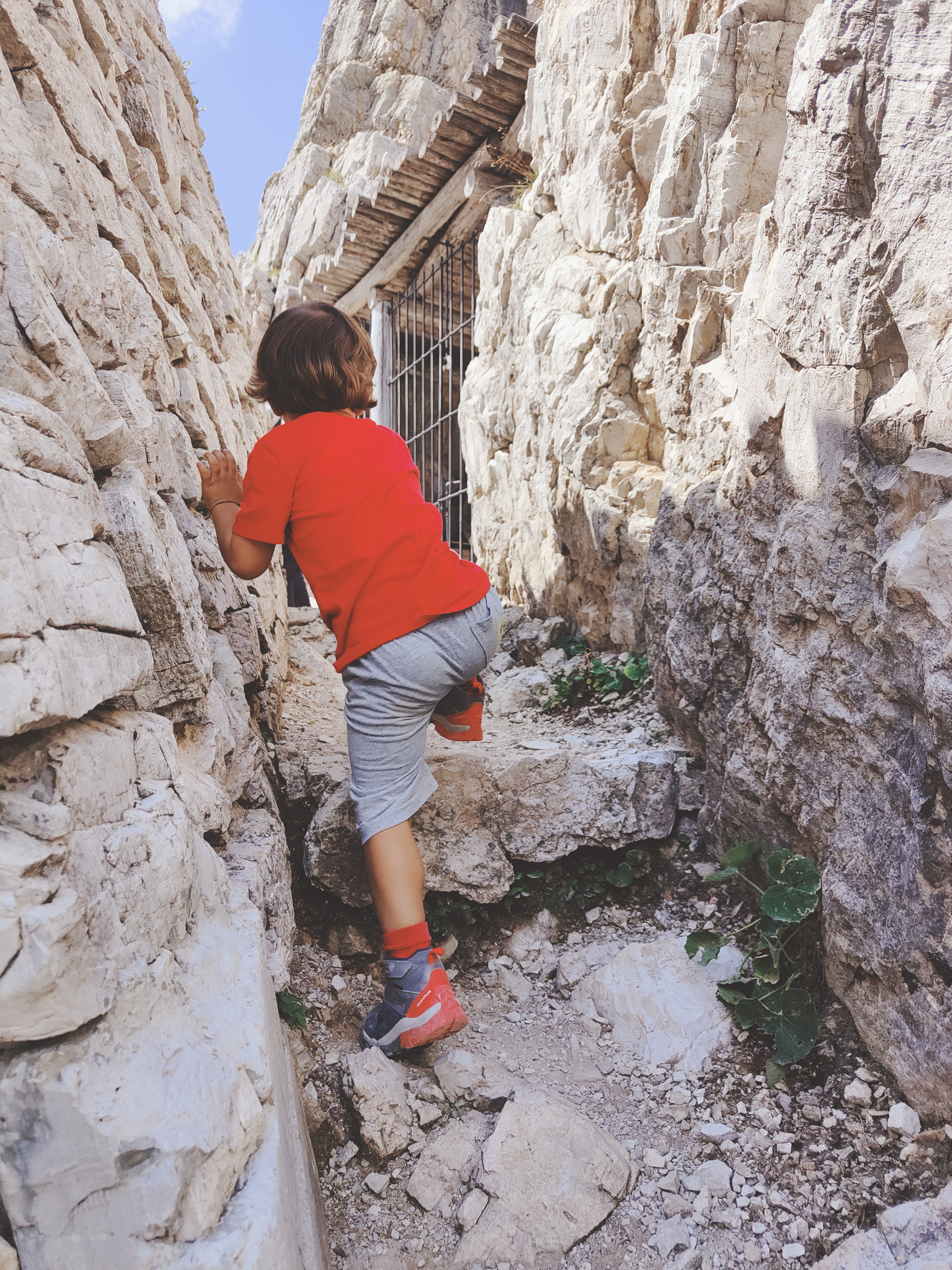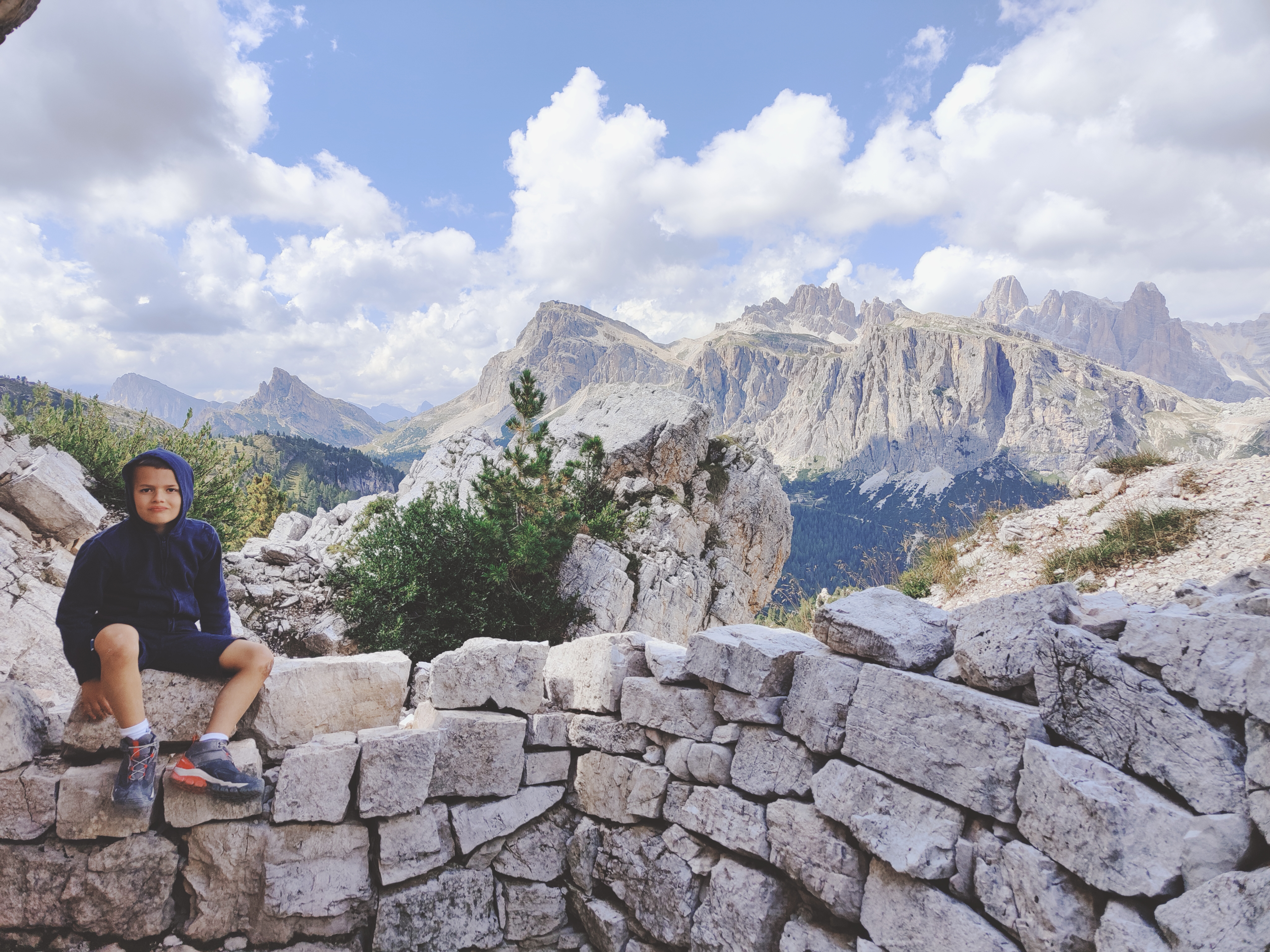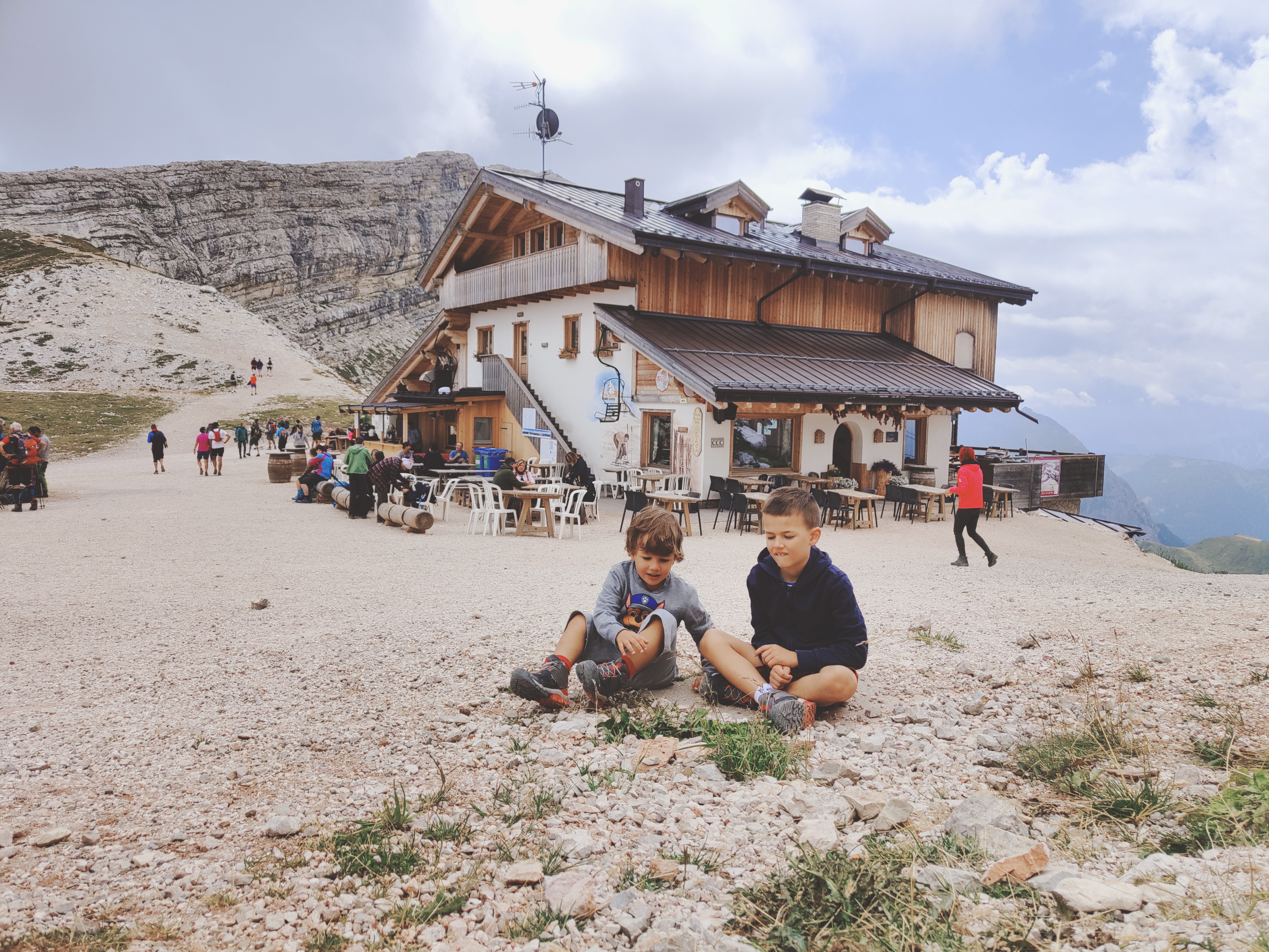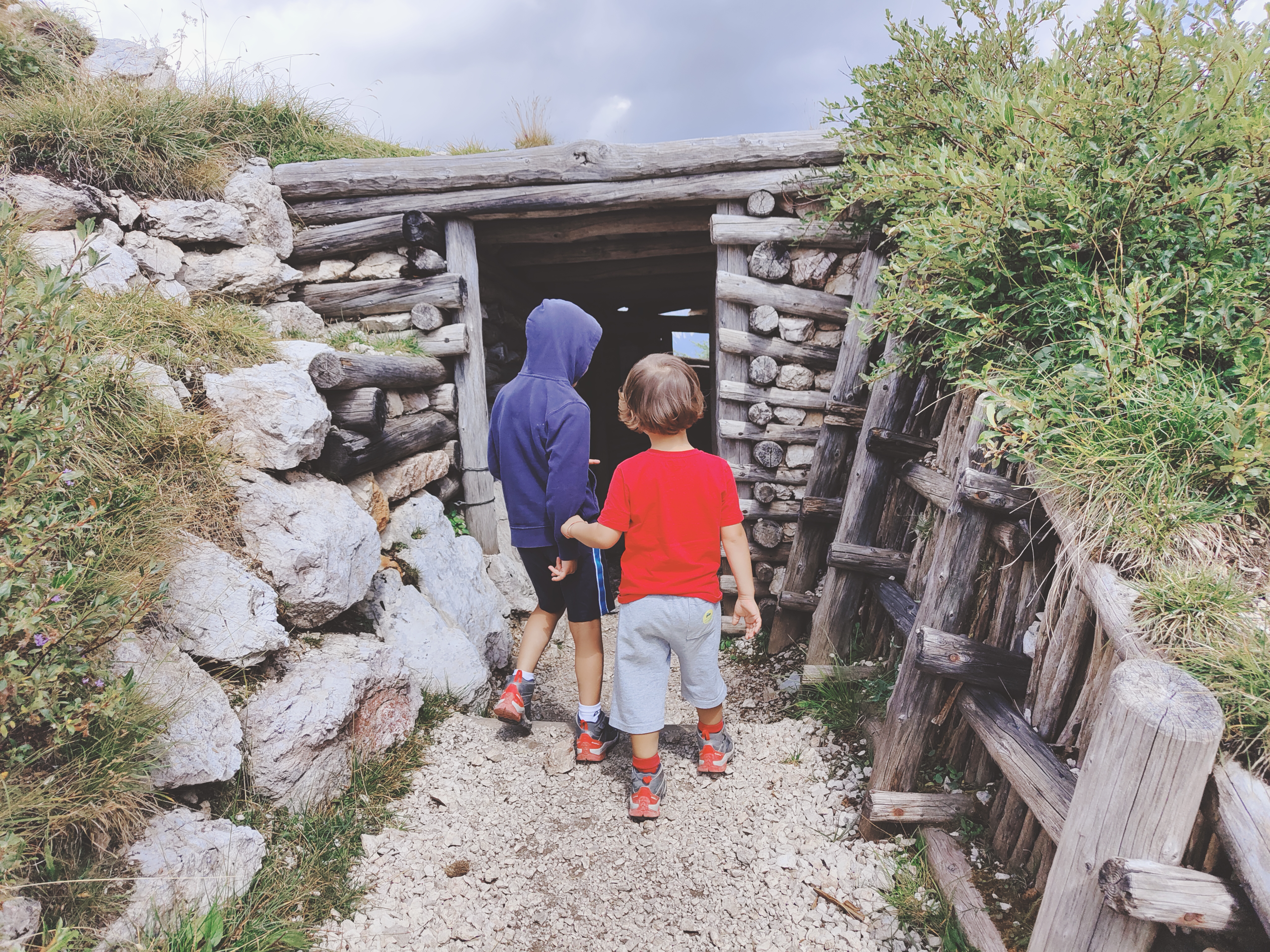 Arrivati, con qualche lamentio del più piccolo, confermo che la discesa è stata più tosta. Ci rilassiamo nella terrazza panoramica del Rifugio Scoiattoli davanti un buon dolce. Mica ci fermiamo qui…un’altra esperienza ci aspetta nel museo a cielo aperto della grande guerra.
