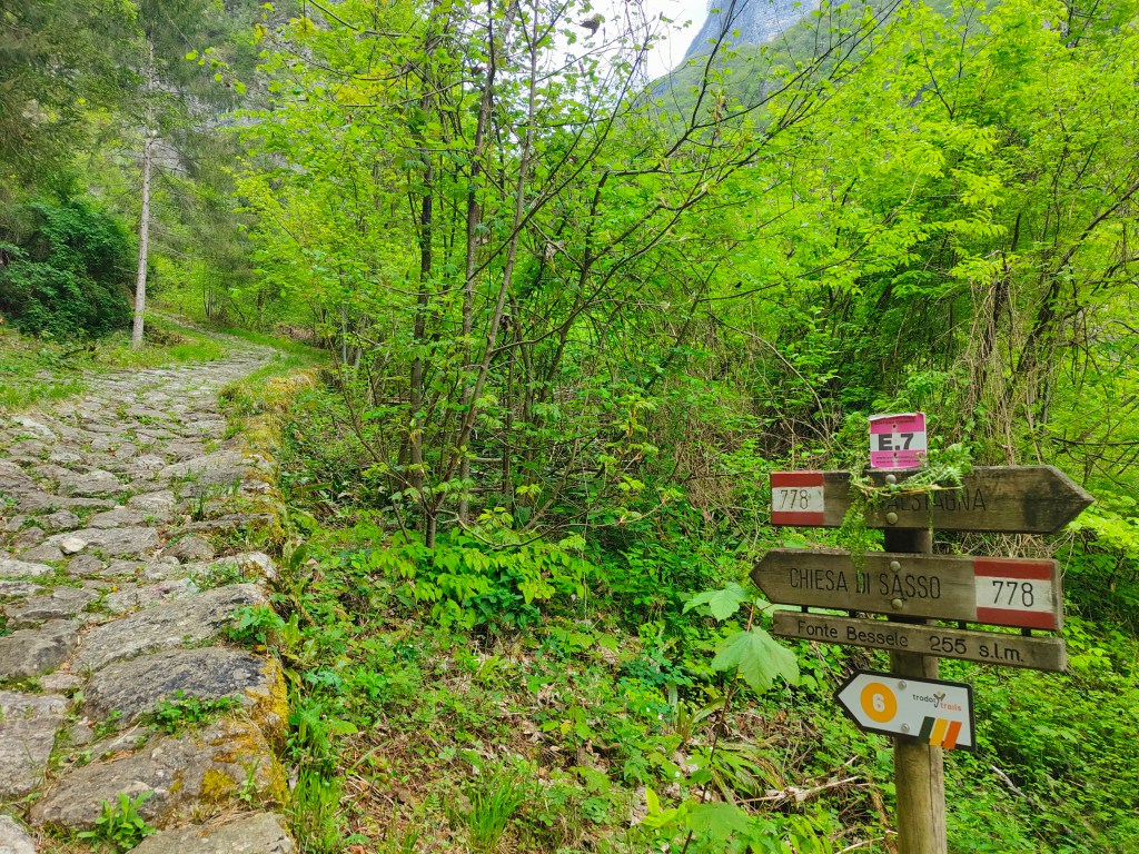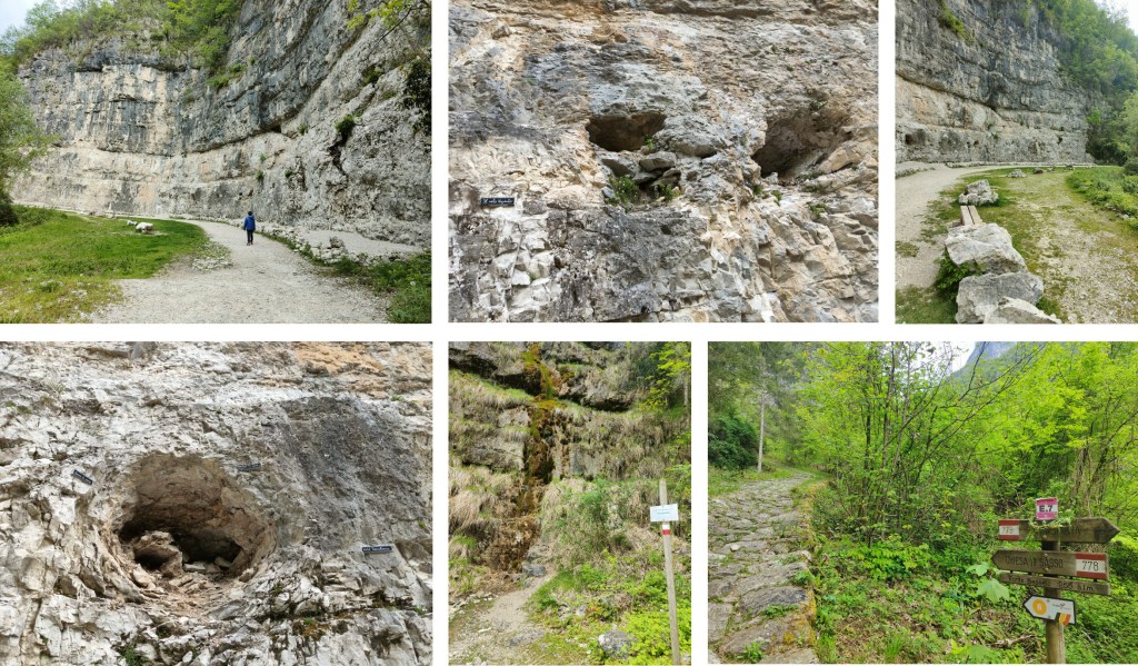 Inizia quindi un tratto di strada bianca (sentiero n. 778 CAI) pressochè pianeggiante, tra due alte pareti rocciose, di circa un chilometro che porta a Fonte Bessele 255 s.l.m (Fontanèa) dove una struttura in legno accoglie l’escursionista per un breve ristoro al coperto offrendo la possibilità di leggere su un pannello esplicativo la storia dei luoghi.