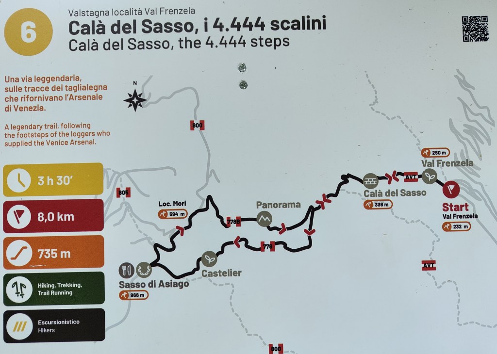 Per scendere nuovamente a Valstagna potete ripercorre la gradinata e fare altri 4444 gradini in discesa oppure prendere un percorso boschivo che parte dal centro della borgo e si ricongiunge a metà del percorso fatto all’andata.