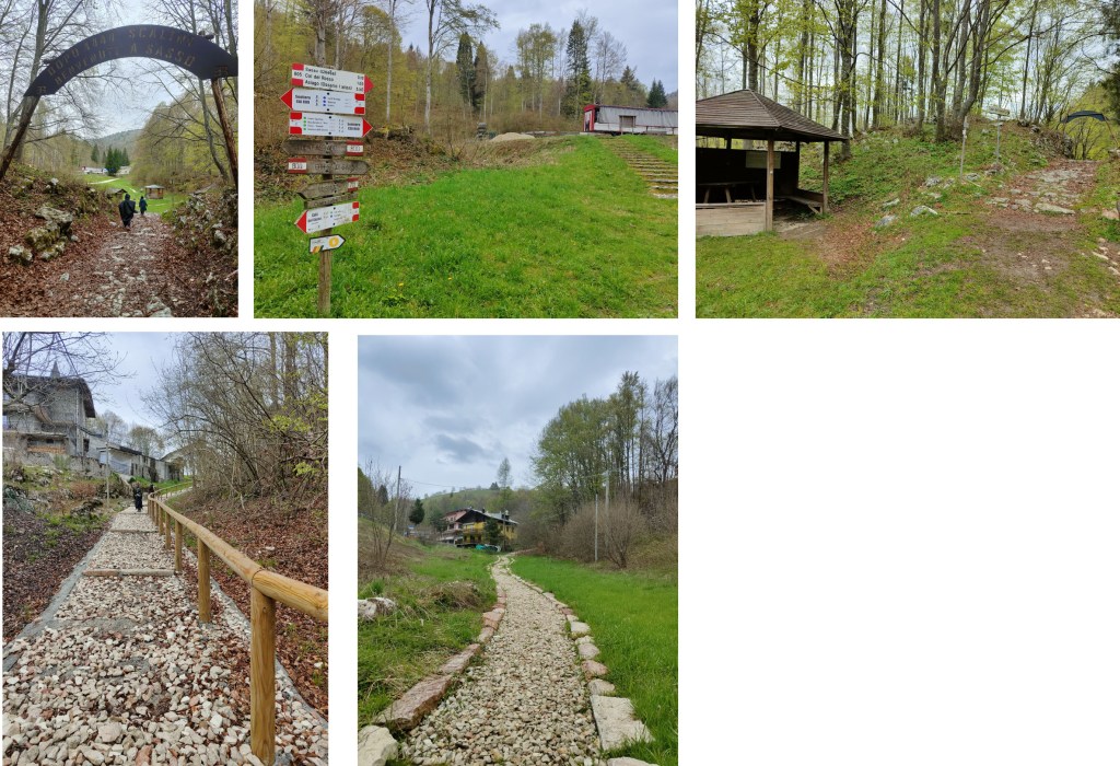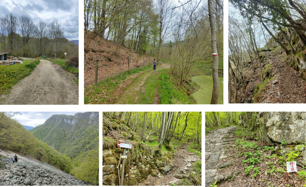 Pian piano si addentra sempre più nel bosco fitto di vegetazione e ricco di colori. E ora da qui inizia la vera salita. Oltre al legname scendevano in continuazione anche mercanzie e soprattutto persone, da qui “Calà” ovvero calare-scendere. Come si può notare nell’immagine, la scalinata è formata da gradini fatti di pietre e sassi.