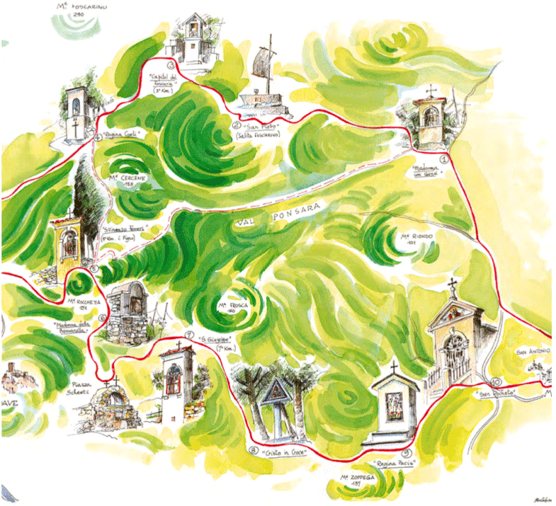 E’ segnalato da cartelli in legno, ed è scandito da 10 tappe, 10 capitelli votivi dedicati a Santi e figure religiose, con indicazioni aggiuntive che riportano puntualmente i nomi dei capitelli: