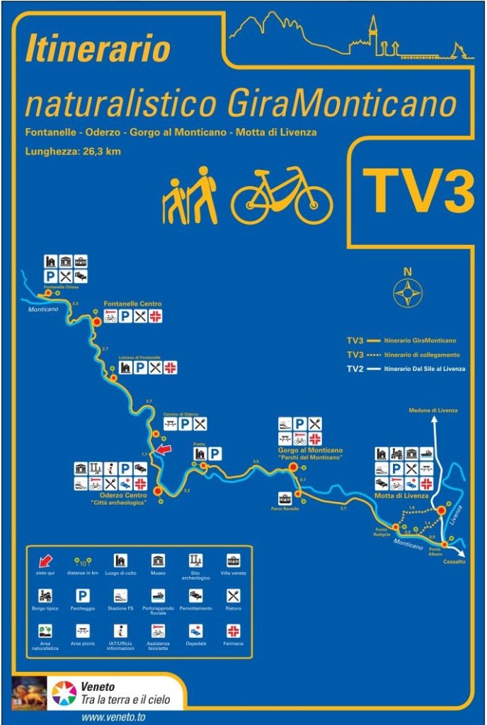 Il percorso in tutti i comuni è evidenziato da apposita segnaletica e il sentiero è pavimentato con materiale ecologico. Con la possibilità da Fontanelle del collegamento con il “GiraLivenza”. L’itinerario è identificato con il codice TV3 nelle mappe della provincia di Treviso. La ciclabile TV3 realizzata dalla Provincia di Treviso è molto bella ed è dotata di indicazioni esaustive.
