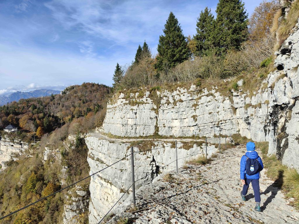 Appena usciti alla luce del sole inizia la parte della strada a strapiombo sulla Val d’Astico. Per chi soffre di vertigini non è il posto migliore, comunque il sentiero è sempre largo e protetto da dei cavi metallici.