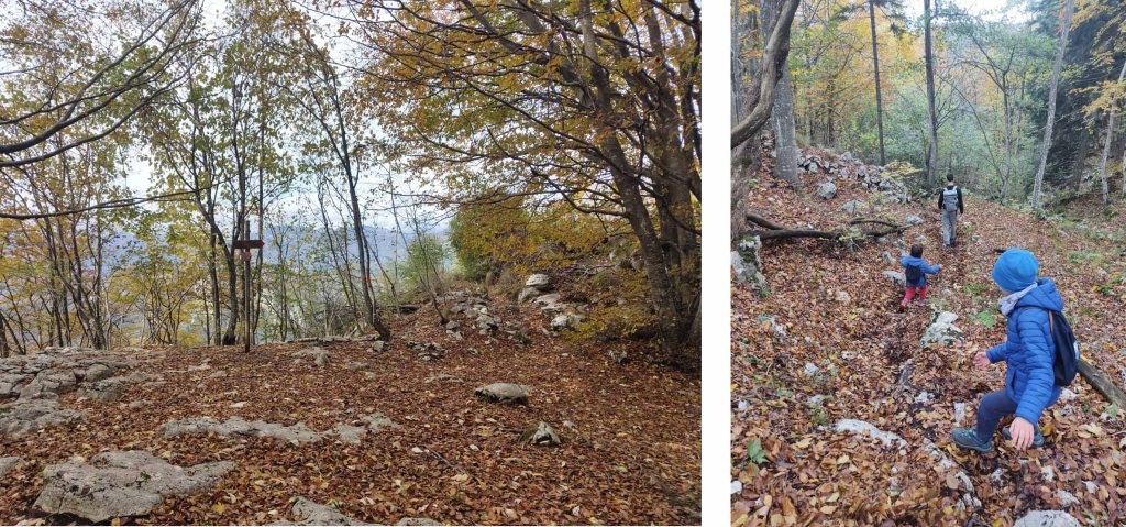 Ritorniamo brevemente lungo il sentiero dell’andata e, prima del Piazzale Pennella, svoltiamo a sinistra seguendo il sentiero 643 Trincea del Granatieri.