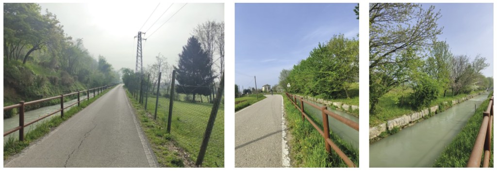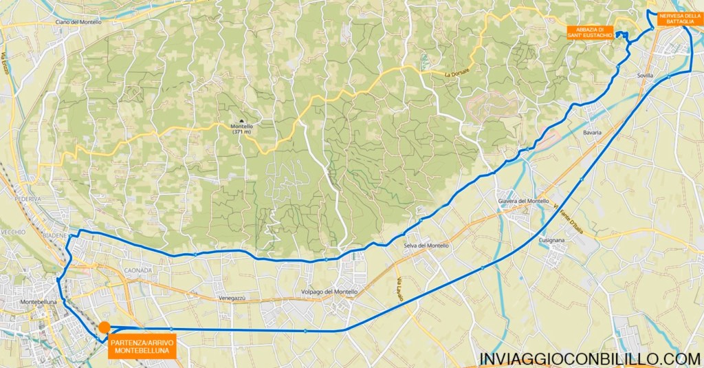 Fino a Giavera del Montello costeggiamo il canale del bosco, un lungo tratto tranquillo, asfaltato a tratti in ombra, molto naturalistico e suggestivo. Raggiunta la prima rotonda proseguiamo dritti per Via Pedemontana, successivamente in Via Francesco Baracca, in Via Arditi e in Via Armando Diaz.