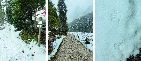 Questa mattina iniziamo un escursione accompagnati da una pioggia di neve soffice e lieve, a momenti un po’ più intensa ma senza disagi. Da Passo Cereda si scende fino a raggiungere un bivio, si devia a destra per la Val Canali. Arrivati a Villa Welsperg, si prosegue fino al ristorante Cant del Gal e poi si seguono le indicazioni. Non dovete proseguire per Malga Canali sulla carreggiata asfaltata, proseguite verso il Ristorante la Ritonda, troverete le indicazioni.