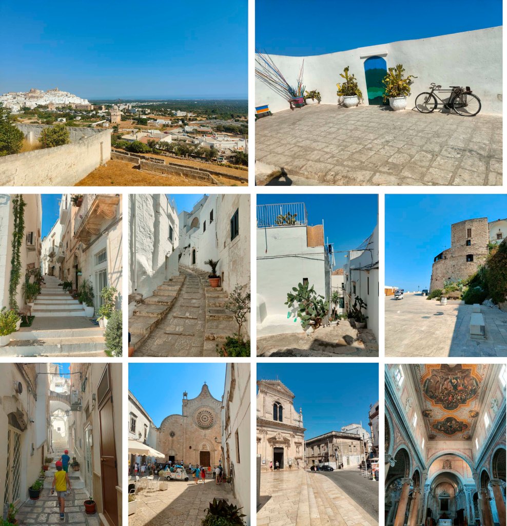 In 25 minuti siamo ad Ostuni, lasciamo in auto in un parcheggio gratuito lungo la strada. La città bianca, candida, arroccata su tre colli e famosa per le sue case ricoperte di latte di calce. Dalla Piazza della Libertà, dove si trova l’obelisco di Sant’Oronzo, si inizia a camminare in questo labirinto di stradine dove, a fare da contrasto al bianco dei muri. ci sono le porte e le finestre colorate di verde e di blu.
