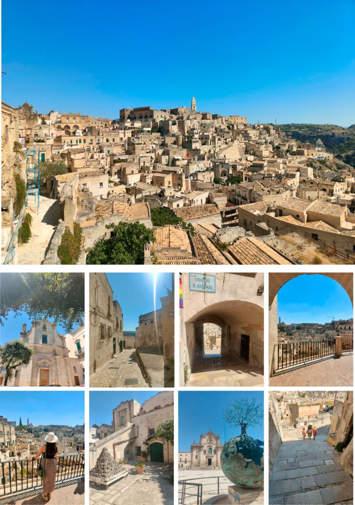 Un’ora e mezza per raggiungere Matera. Prima impressione: un presepe a cielo aperto. Una delle città ancora abitate tra le più antiche del mondo. Situata su un altopiano calcareo della Basilicata caratterizzato da profonde fessure, burroni, rocce e caverne, si ha la sensazione di entrare in un presepe. Case, chiese, monasteri ed eremi sono costruiti nelle grotte naturali della Murgia.