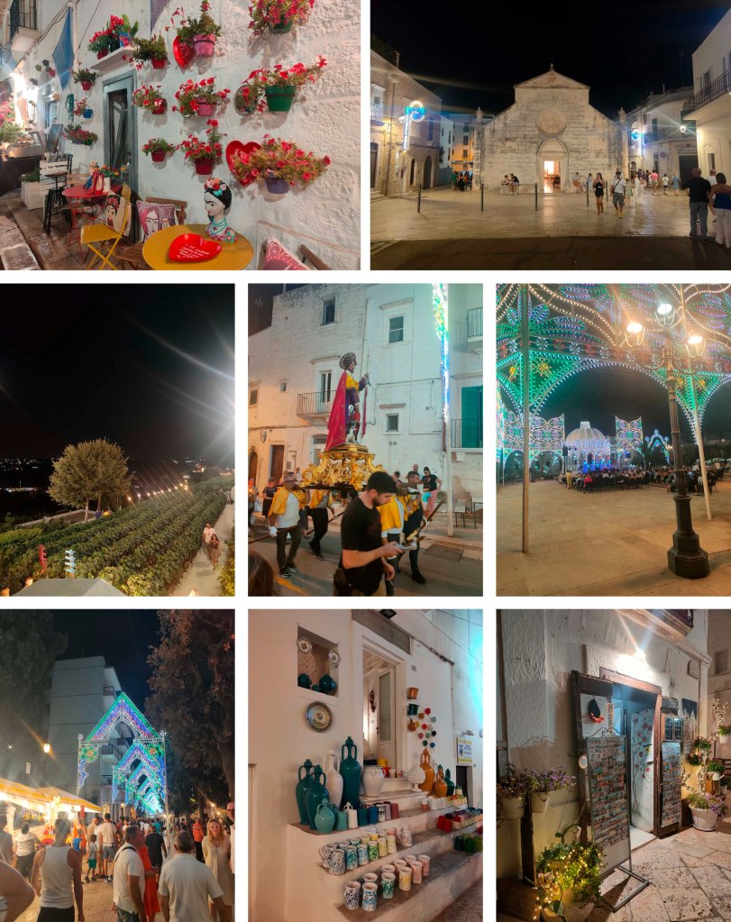 Oggi 15 agosto, ci uniamo alla festa di San Rocco a Locorotondo. Un borgo molto simile Cisternino, poesia dipinta sulle mura tra i vicoli del paese. E’ una serata speciale, siamo immersi in un paese in festa, fuochi d’artificio, mercato serale, botteghe, negozi aperti, luminarie nelle vie, concerti, banda musicale, non ci si annoia.