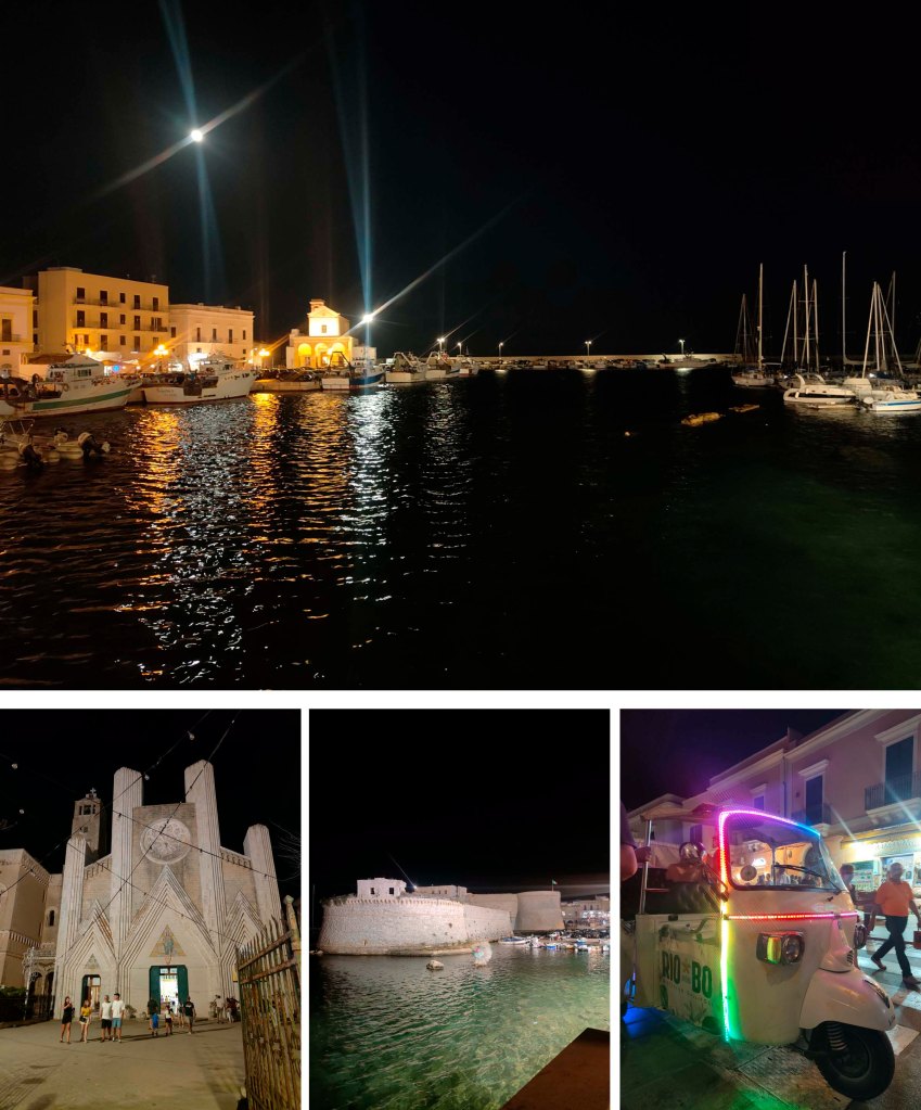 Nel pomeriggio usciamo a piedi e in soli 10 minuti raggiungiamo la bassa scogliera, dove è possibile fare anche un pò di snorkeling, il panorama è davvero molto suggestivo, nonostante il bel sole, l’aria è piacevole e rilassante. Rientriamo per cena e poi andiamo a Gallipoli, una cittadina sulla costa pugliese, nota soprattutto per la sua movida. Lasciamo l’auto nel parcheggio a pagamento del cimitero e in 20 minuti siamo nel cuore del paese.