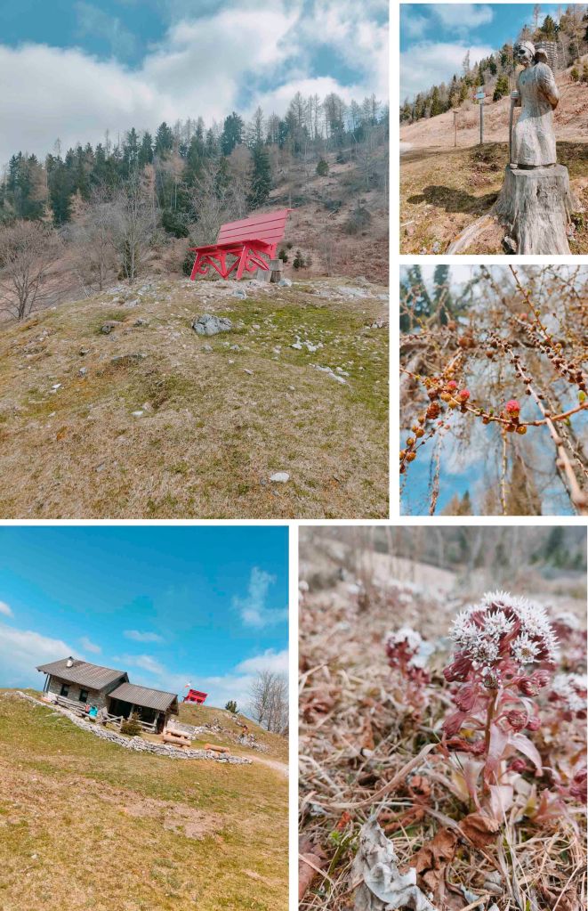 Lasciamo l’auto in un comodo parcheggio, si intravede un sentiero in salita. Iniziamo la salita in alcuni punti un pò ripida e raggiungiamo Casera La Grava, Quindi al primo bivio andiamo a destra seguendo le indicazioni per Casera Erte, la quale si trova proprio a fianco della panchina.
