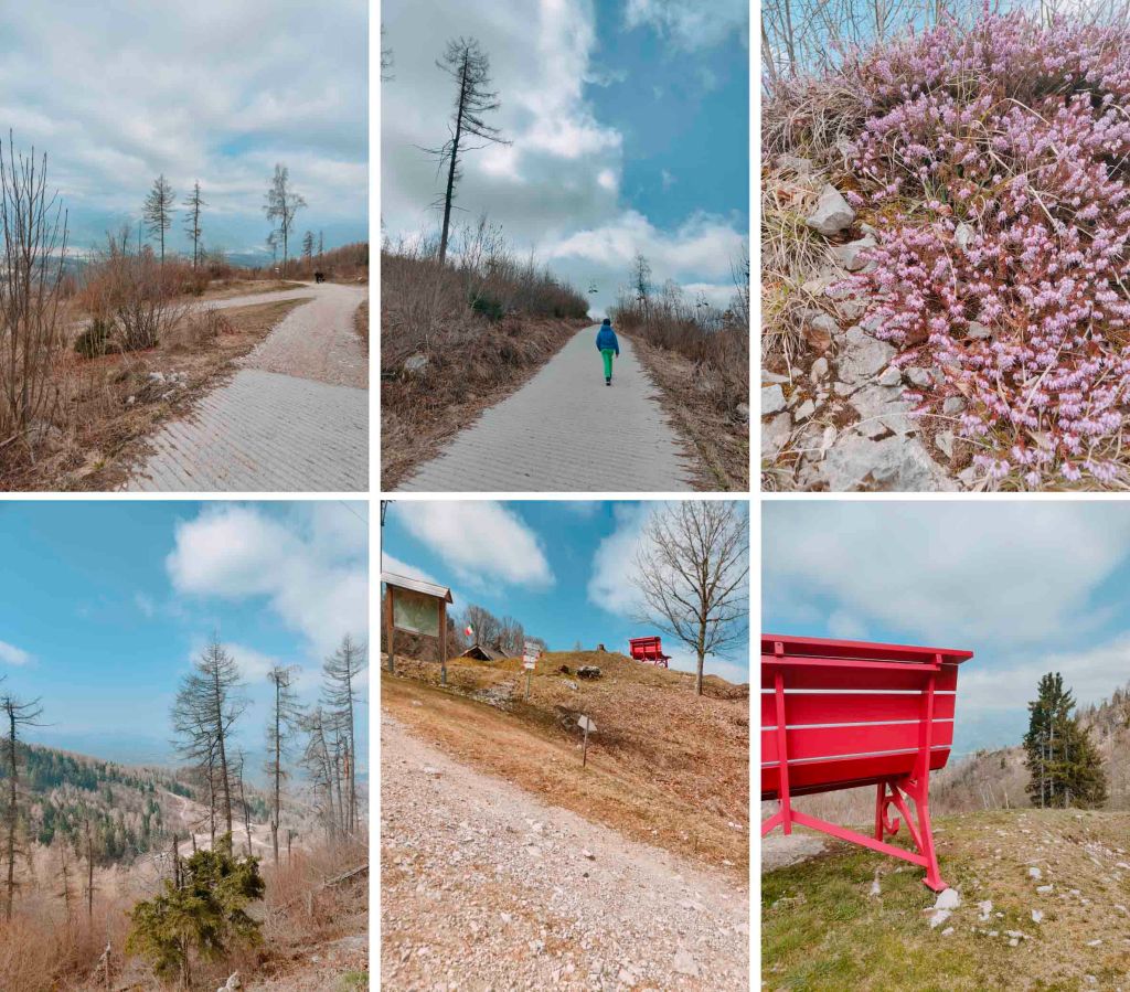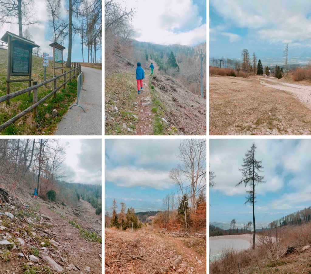 Da qui bisogna risalire faticosamente la pista da sci fino a sbucare su una nuova strada, in parte cementata, proveniente dal Villaggio Faverghera. Da qui in poi in una decina di minuti si sale dolcemente fino alla panchina, già visibile dopo la curva.