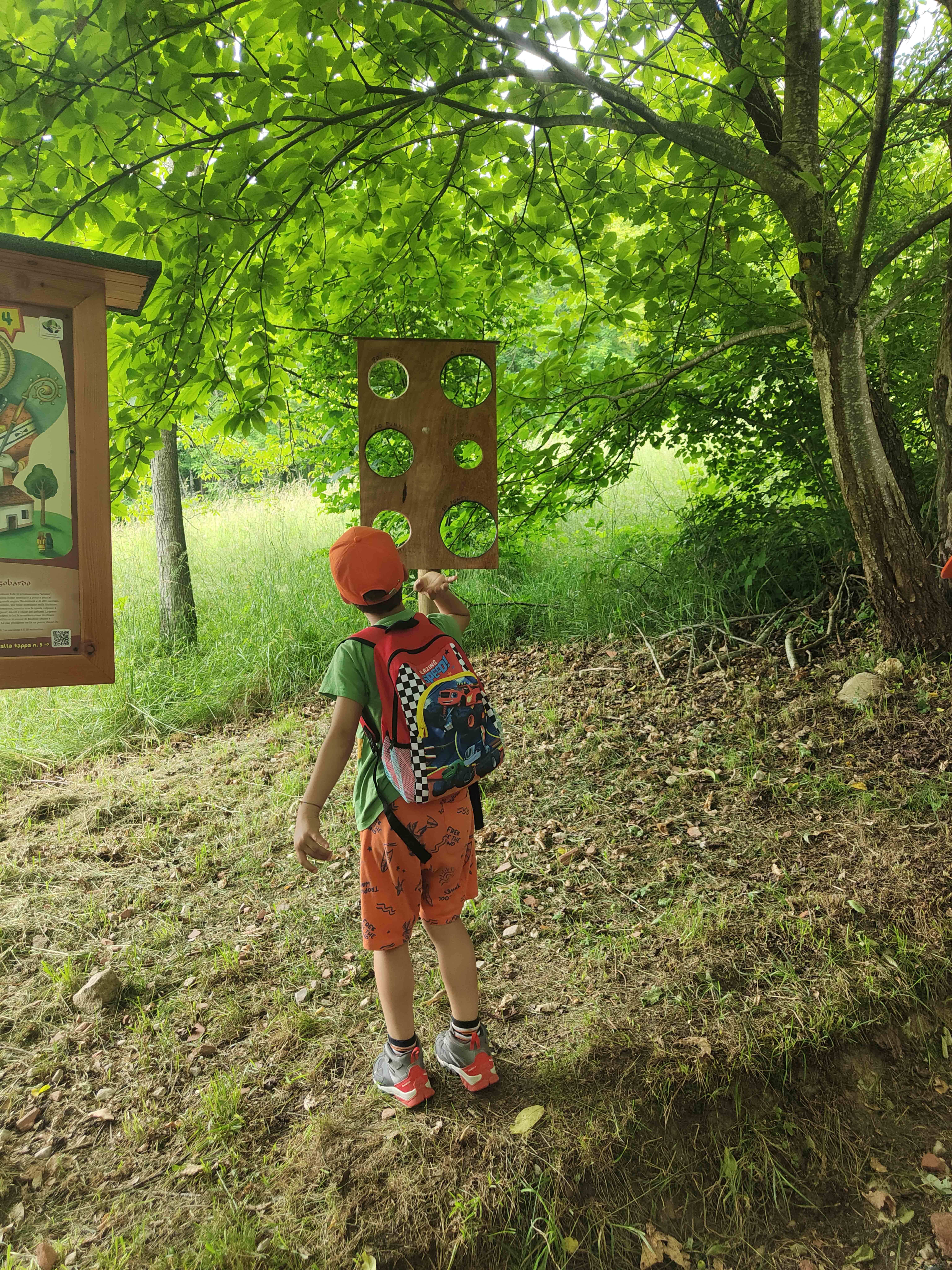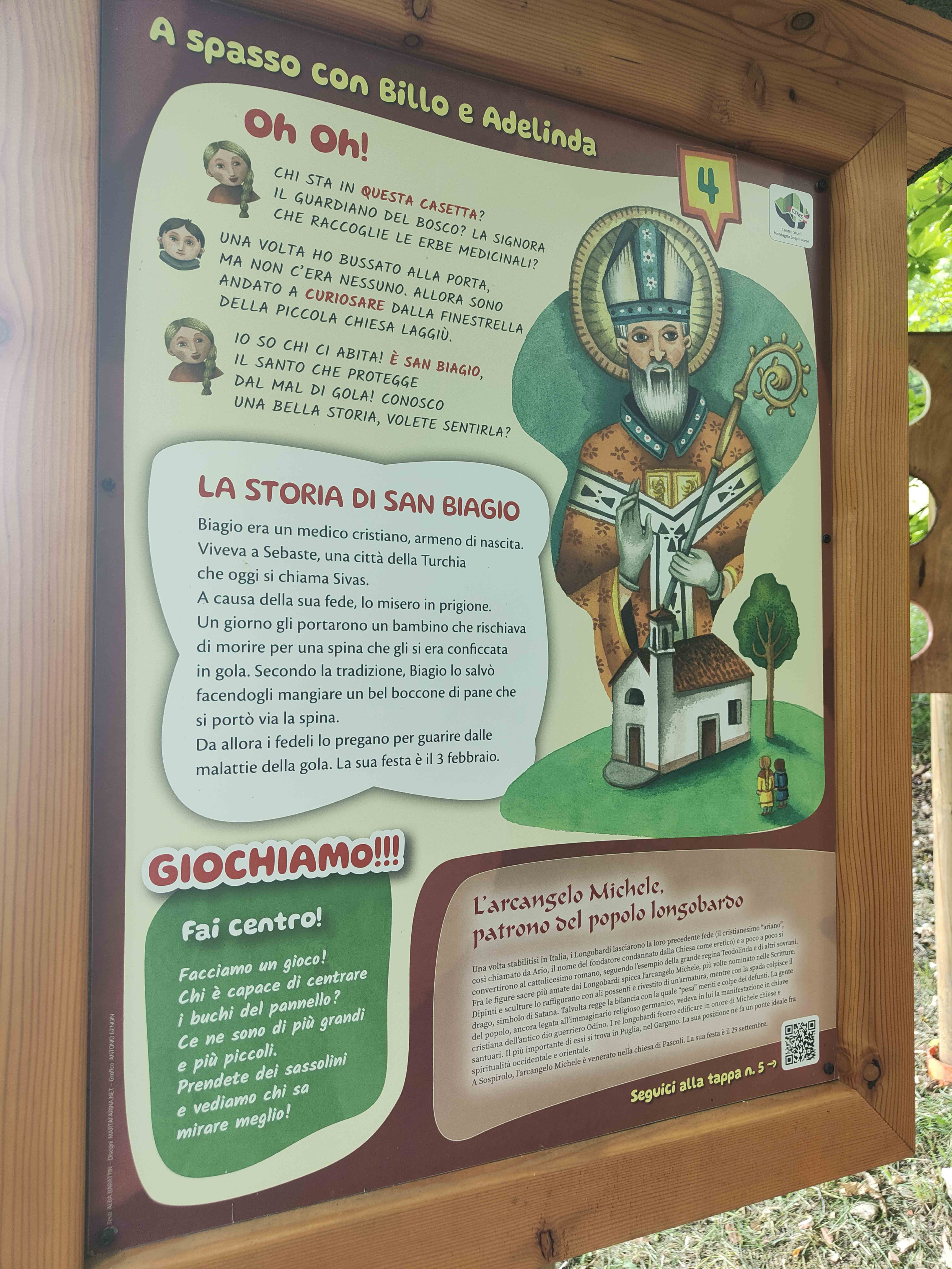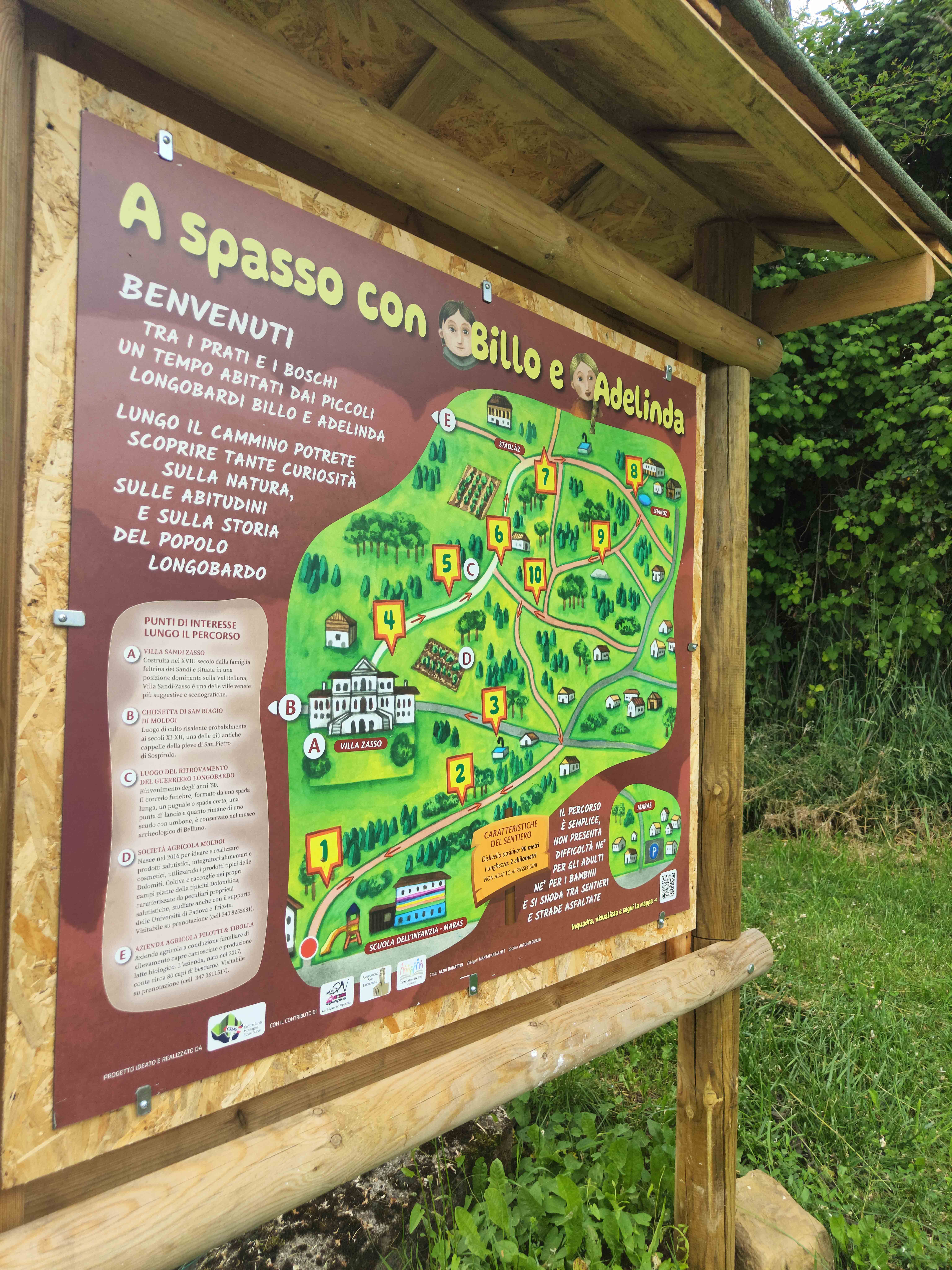 I dieci pannelli lungo il sentiero riportano ciascuno un dialogo tra due bimbi longobardi, Billo e Adelinda, e trattano temi riguardanti la vita quotidiana del loro popolo. Ogni pannello offre idee di gioco per i bambini, e riporta anche delle notizie storiche dedicate agli adulti. Le illustrazioni sono state curate dall’artista Marta Farina, ed i testi dalla professoressa Alba Barattin.