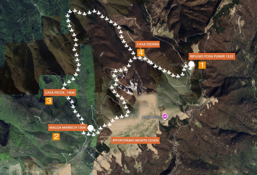 Proseguendo lungo il sentiero, abbiamo “incontrato” diversi laghetti, dove spesso sostano i pascoli, proseguiamo fino a raggiungere dopo circa 1 ora, il famoso Ippopotamo sul Monte Cesen, che ogni giorno ammiriamo dalla nostra casa, soprattutto d’inverno quando il Monte è ricoperto di neve risalta ancora di più. Un’enorme figura formata da abeti e faggi lungo i prati del Cesen. Di natura casuale infatti, sembra ci siano 4 zampe e una grande testa che ricorda quella di un ippopotamo.