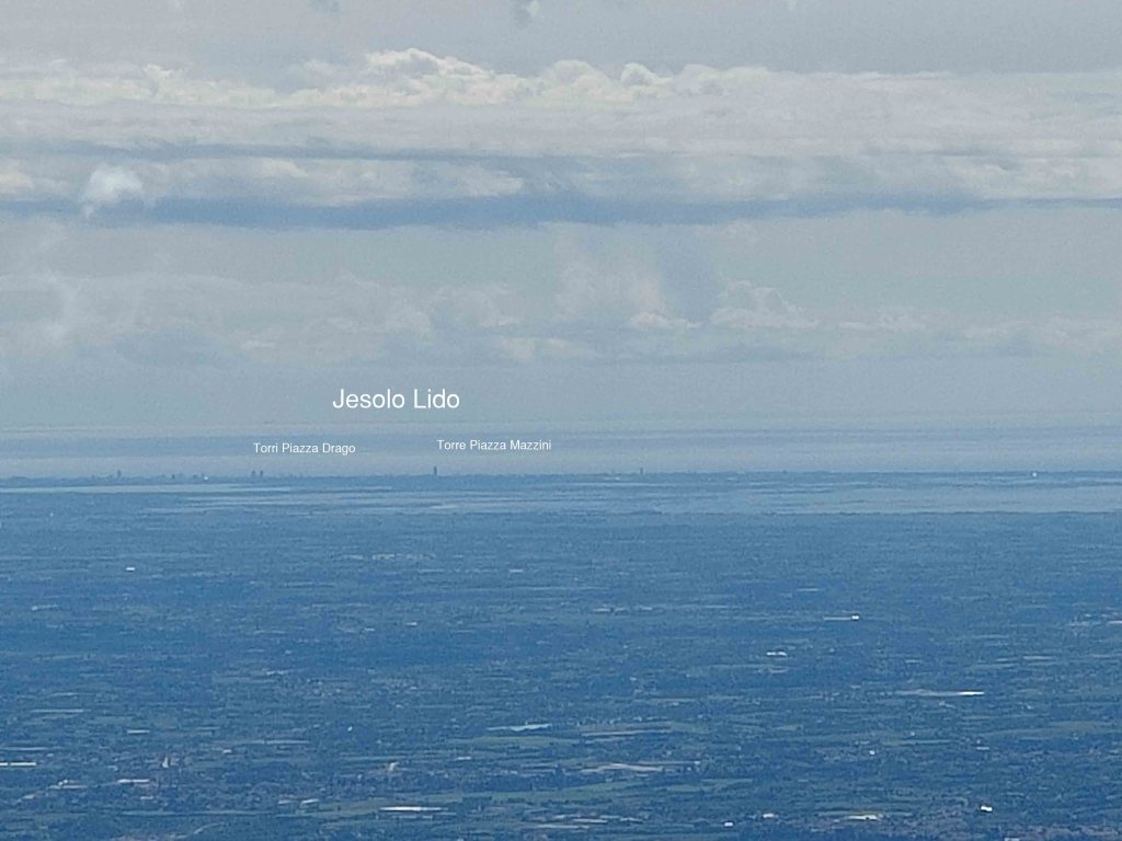 Facilmente visibile dalla pianura. Da questa altura, a oltre 1500 metri, si apre un punto panoramico davvero speciale: la vista spazia fino alla Laguna di Venezia. Il cielo limpido ci ha permesso persino di riconoscere Piazza Mazzini e le torri di Piazza Drago a Jesolo, inconfondibili nel profilo costiero.