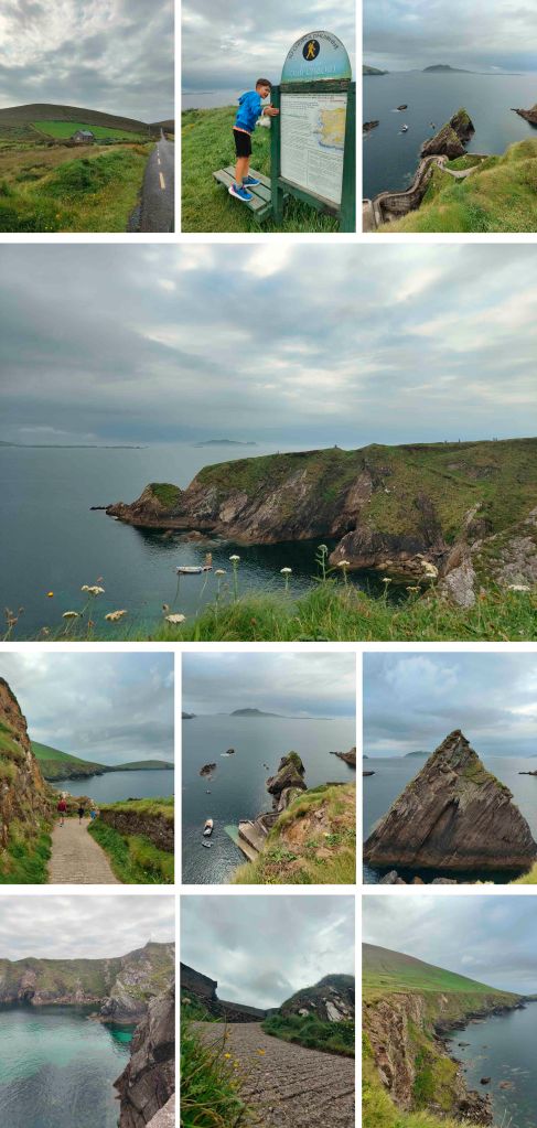 Si tratta di un piccolo molo che si affaccia sulle isole Blasket, collegato alla strada da un sentiero a zig-zag che scende lungo la scogliera. La vista dall’alto è spettacolare: l’oceano infinito, le rocce a picco e le barchette ormeggiate. È un posto che trasmette pace e immensità allo stesso tempo, quasi sospeso tra cielo e mare.