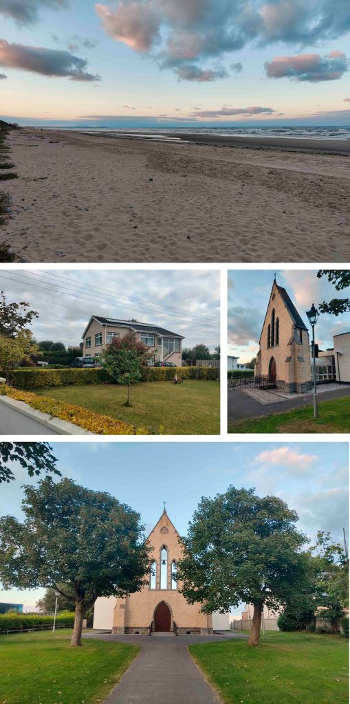 Prima di arrivare alla spiaggia, ci siamo fermati alla particolare chiesa di Laytown, costruita in posizione privilegiata proprio di fronte all’oceano. All’interno, le grandi finestre permettono di ammirare il mare, e la luce che entra conferisce all’ambiente una sensazione di calma e serenità. È un luogo semplice ma suggestivo, perfetto per godersi il contrasto tra la sacralità dell’edificio e la forza della natura fuori.